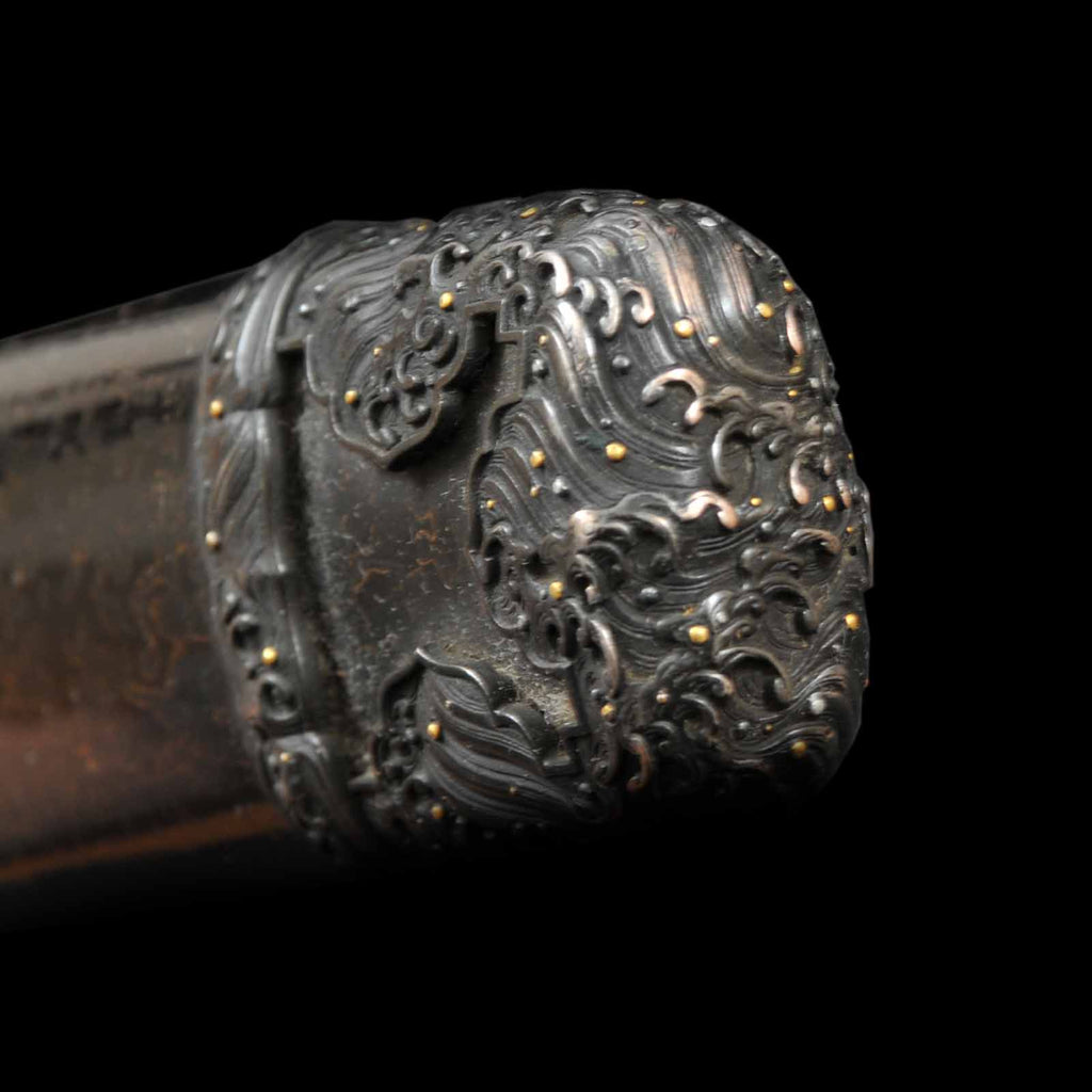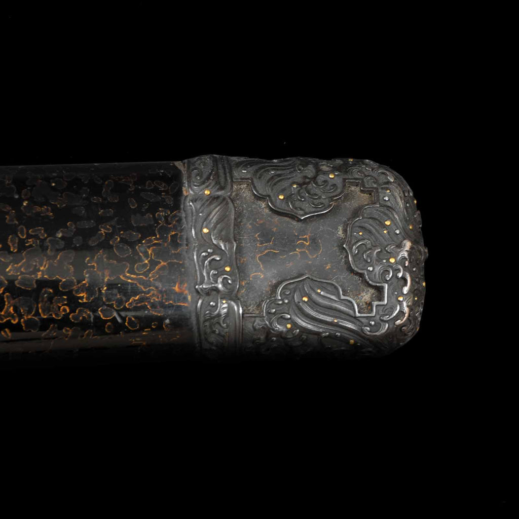 Handachi Koshirae is a style of sword mounting that was popular from the late Muromachi period to the early Edo period. It is a unique style that includes elements of both Tachi and Uchikatana. All the metal fittings are original as they were made and are in excellent condition. The delicate workmanship of the metal fittings alone has artistic value. The Habaki is made of very rare iron and has a unique shape. The sword is equipped with four Seppa, in accordance with the Tachi sword's specifications. The Tsuka-ito was recently wrapped, but there is a possibility that it was also used as an iai sword, so some of the threads have been torn off. For an additional fee, it can be rewrapped with a new cord. The scabbard is a beautiful Tsuishu and is in very good condition with minimal damage for its age.