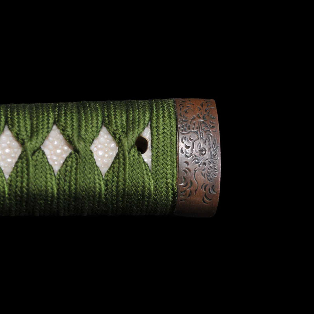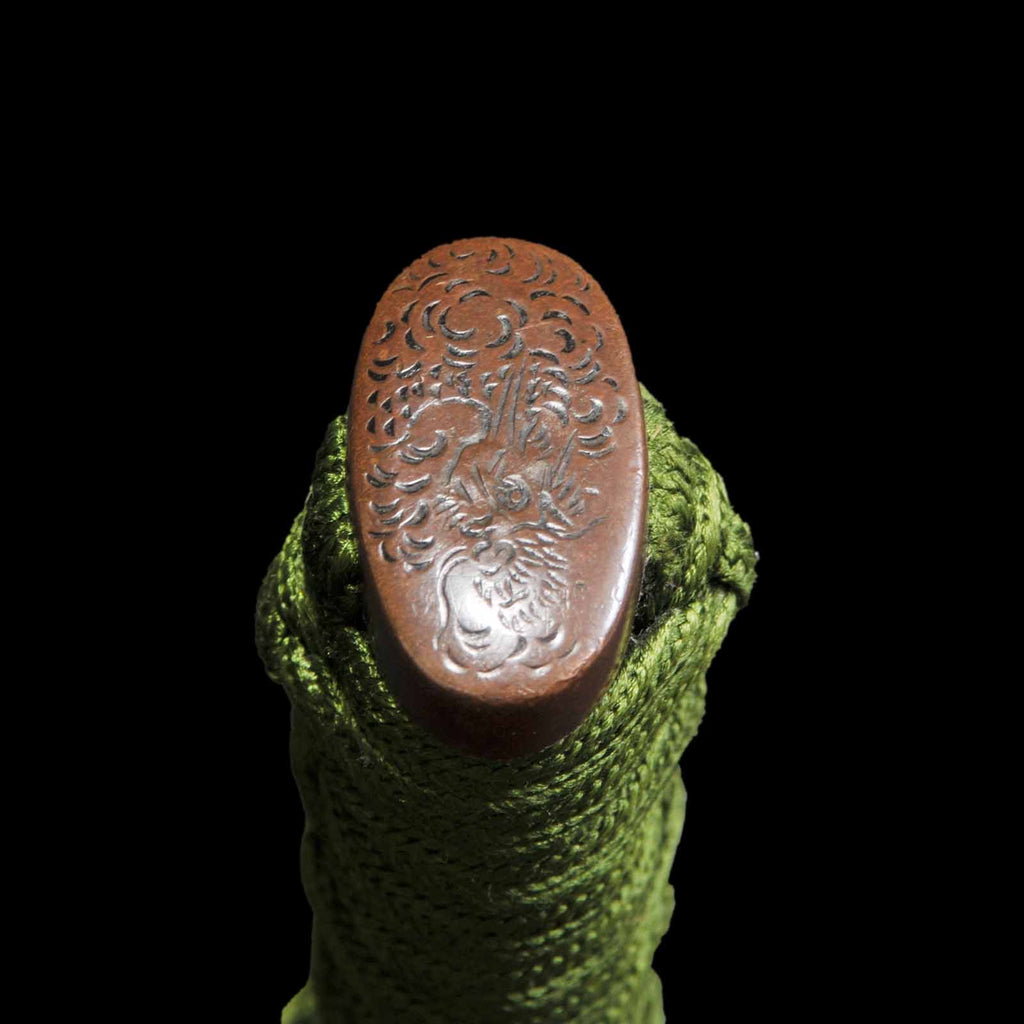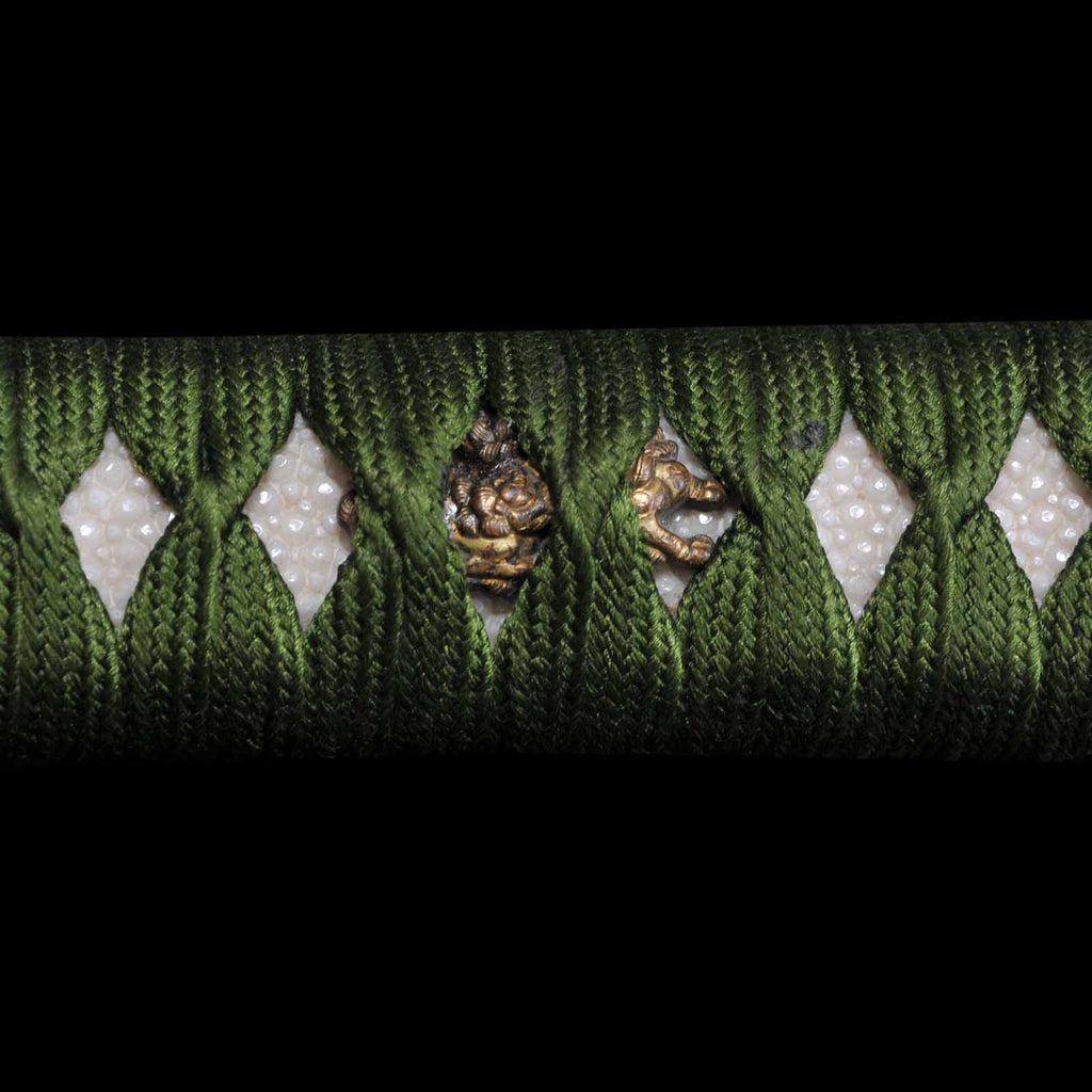 While the surface of the sword is a little cloudy overall, it is of excellent quality and there are no particularly noticeable flaws or rust. The well-packed koitame hada with a bright suguha hamon mixed with notare. The nie is finely covered and a lot of hataraki can be seen in the ha. This is a typical Kanbun period piece with little curvature. The copper fuchikashira has a dragon motif. The brass menuki has a lion design, which is not spectacular, but matches well with the sword blade.