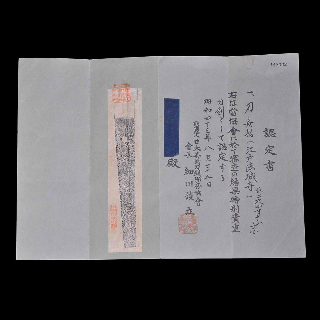 Although this sword is unsigned, the Society for Preservation of Japanese Art Swords has designated this sword as a work of the Edo Hojoji school, which is considered to be a particularly valuable sword. The Edo Hojoji school was a group of swordsmiths active from the Kanbun to Enpo periods of the Edo era, and produced numerous masters. The Edo Hojoji school is said to have been founded by Hojoji Masahiro, the successor of Hojoji Kunimitsu, who was active during the Koto period.