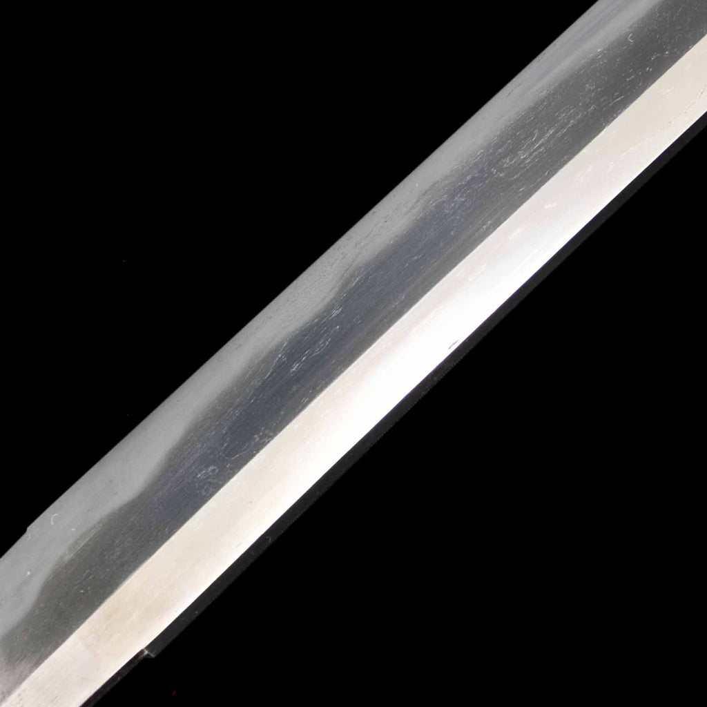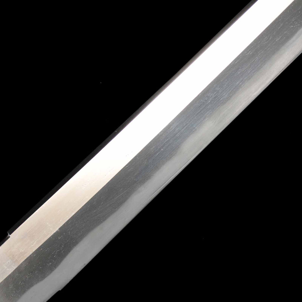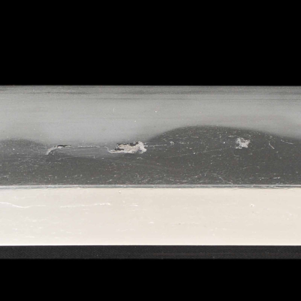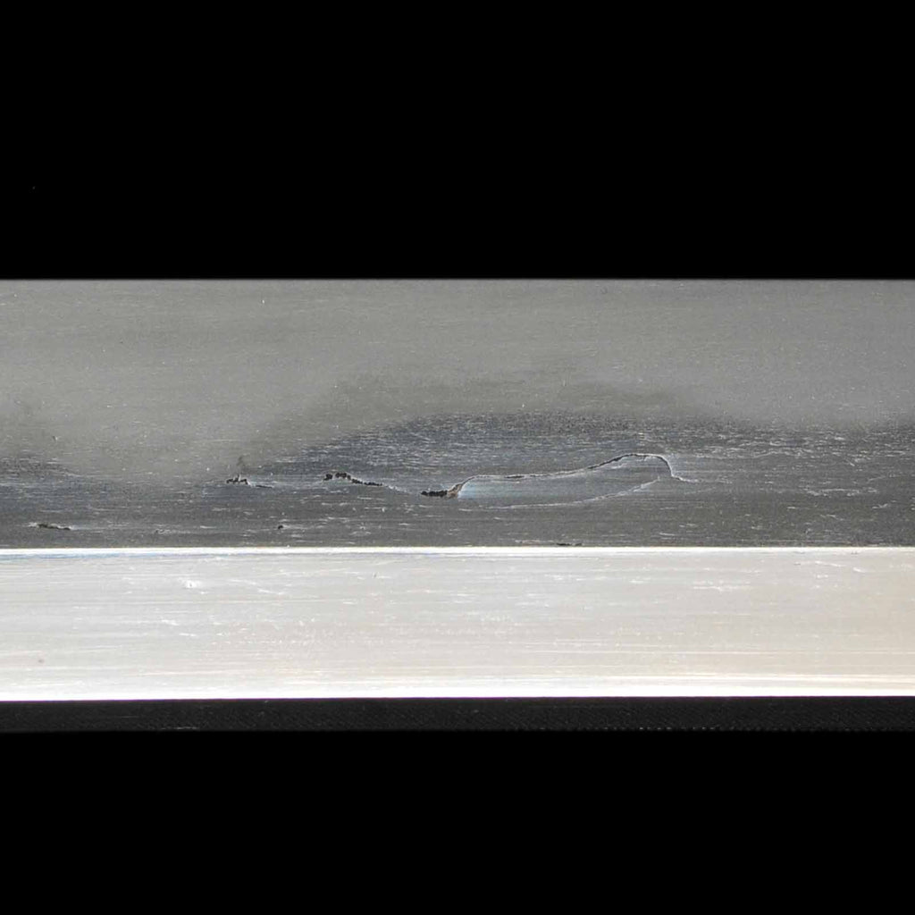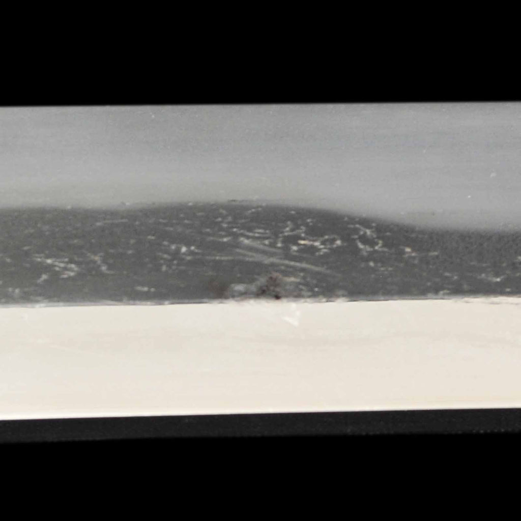 The overall condition of the blade is well sharpened, but there are a few flaws. On the sashiomote side, there is a layer of forging visible on the hiraji about 29.5 cm from the munemachi. There is also rust of about 3 mm on the shinogisuji, about 22 cm from the kissaki. On the sashiura side, there is a visible 5mm forge defect and accompanying visible line at the jien (border between hamon and hiraji) about 18cm from munemachi. There is also rust on the mine.