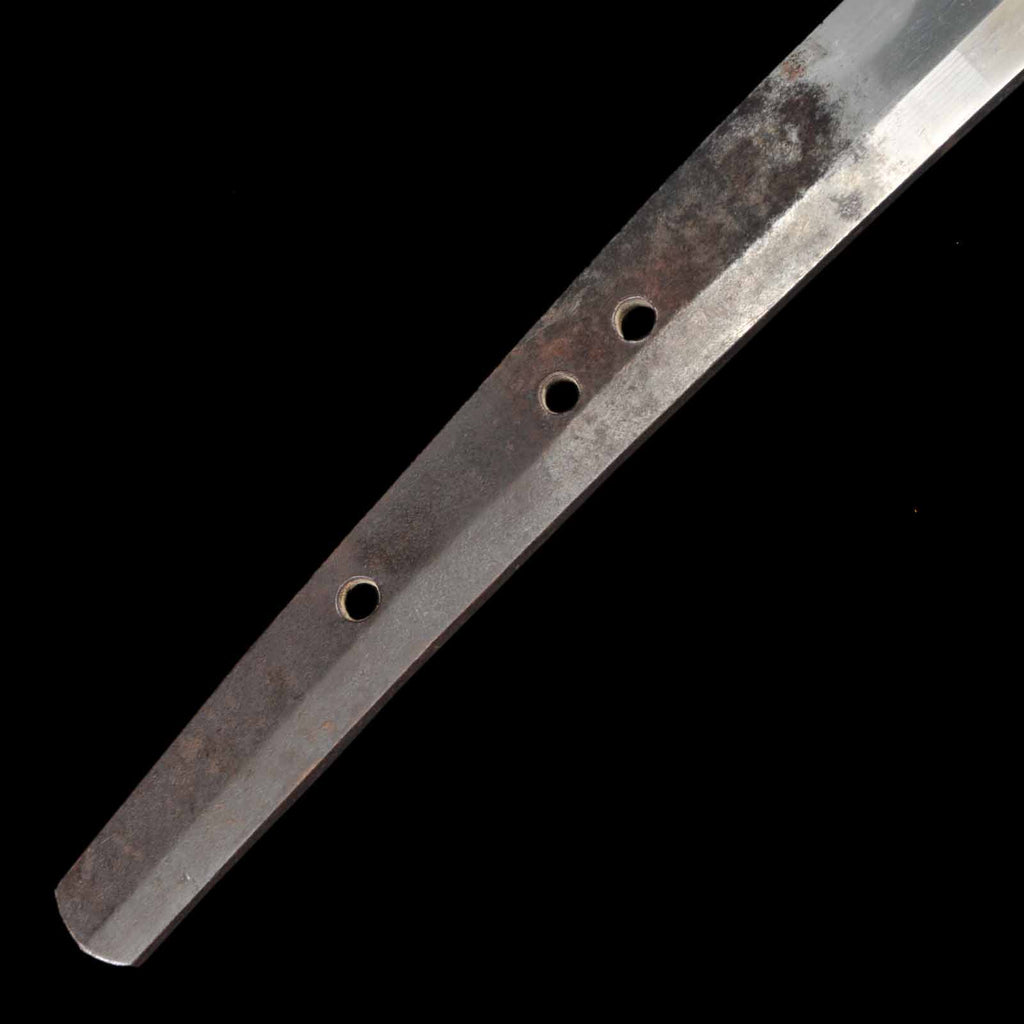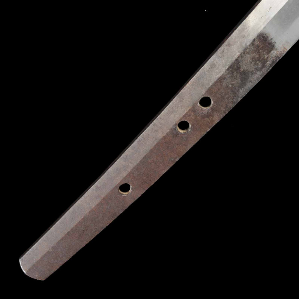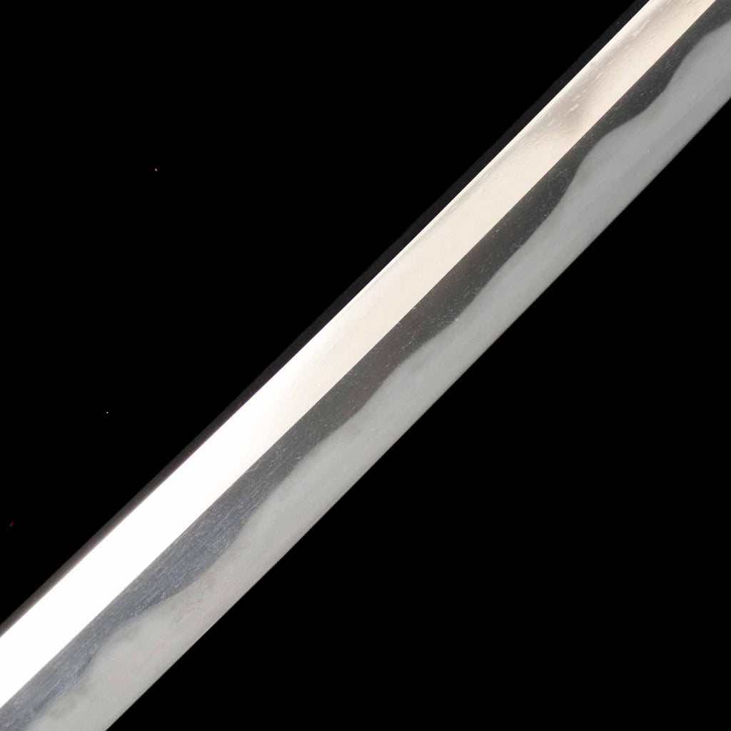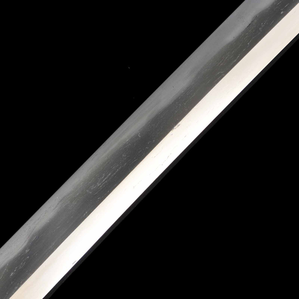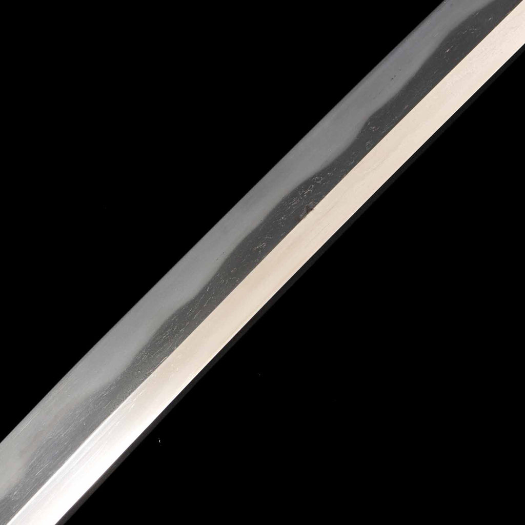 The overall condition of the blade is well sharpened, but there are a few flaws. On the sashiomote side, there is a layer of forging visible on the hiraji about 29.5 cm from the munemachi. There is also rust of about 3 mm on the shinogisuji, about 22 cm from the kissaki. On the sashiura side, there is a visible 5mm forge defect and accompanying visible line at the jien (border between hamon and hiraji) about 18cm from munemachi. There is also rust on the mine.