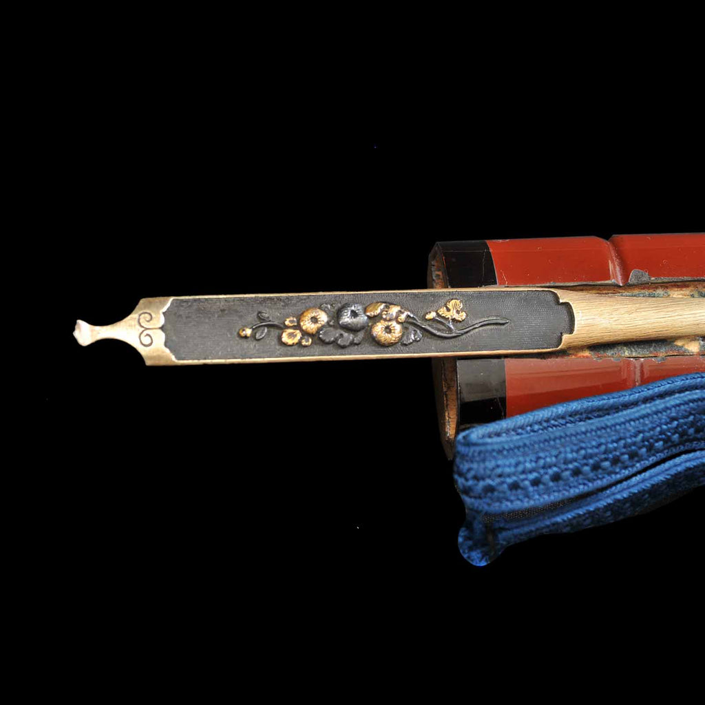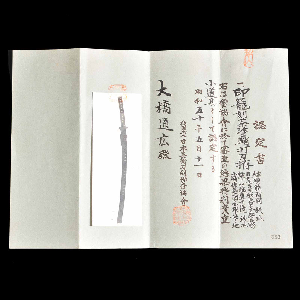 The koshirae has a reddish brown lacquered scabbard with kizami and a tsukaito made of pure silk neatly wrapped in a tsumami-maki style, and the metal fittings are of the period. The scabbard is also equipped with a kogai, making it a full package. The Society for Preservation of Japanese Art Swords also certified the uchigatana koshirae as tokubetsu kicho at the same time as the blade itself, making this a rare piece where both the blade and the koshirae are certified tokubetsu kicho, and although the sword itself has some flaws, both are excellent pieces that are very worthy of being preserved for future generations.