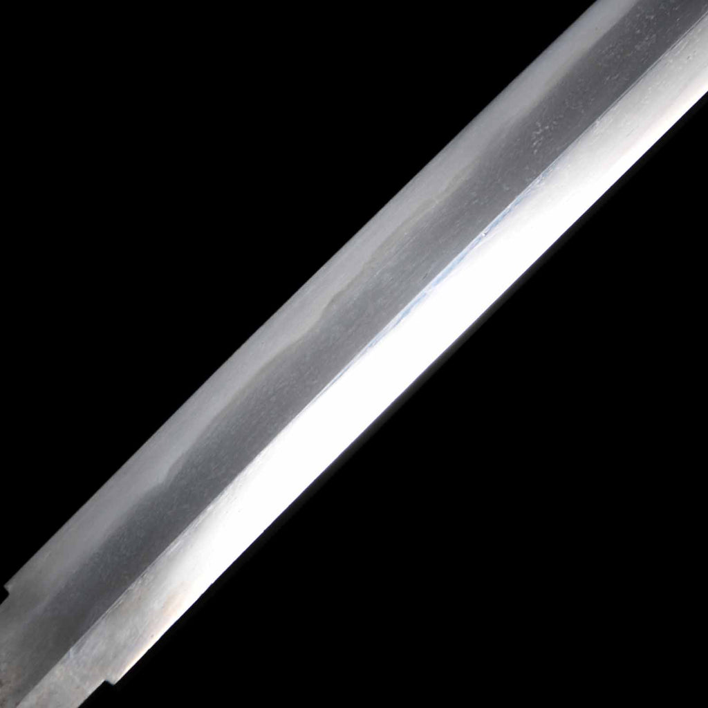 Here is a low-priced katana equipped with uchigatana koshirae, suitable for iai and batto (cutting practice). The katana is a piece from the Shinto period, and the sword blade is shorter than the original due to suriage. The sword itself is in fair condition, but there is a flaw of about 5mm on the sashiura side, about 3cm from the munemachi. There is also a very small dent on the blade about 32 cm from the kisaki that looks like it was struck. Hada has itame mixed with mokume in places, and hataraki such as chikei and yubashiri can be seen everywhere. Hamon is suguha mixed with notare and niedeki. Among the ha are kinsen and aranie, which are active. The tsuba are period pieces from that time, but the fuchikashira, menuki, and kojiri are modern fittings. For some of the flaws, the price has been lowered significantly, making it easier to buy.