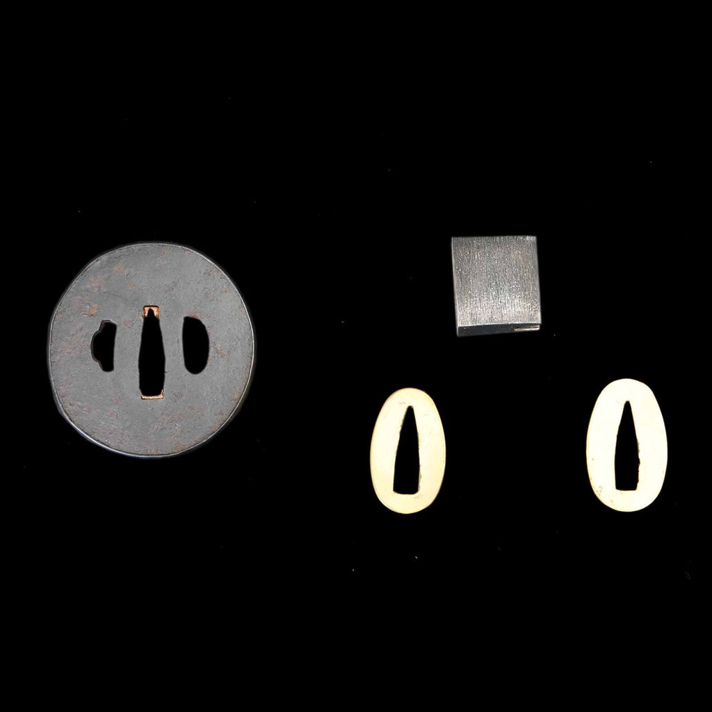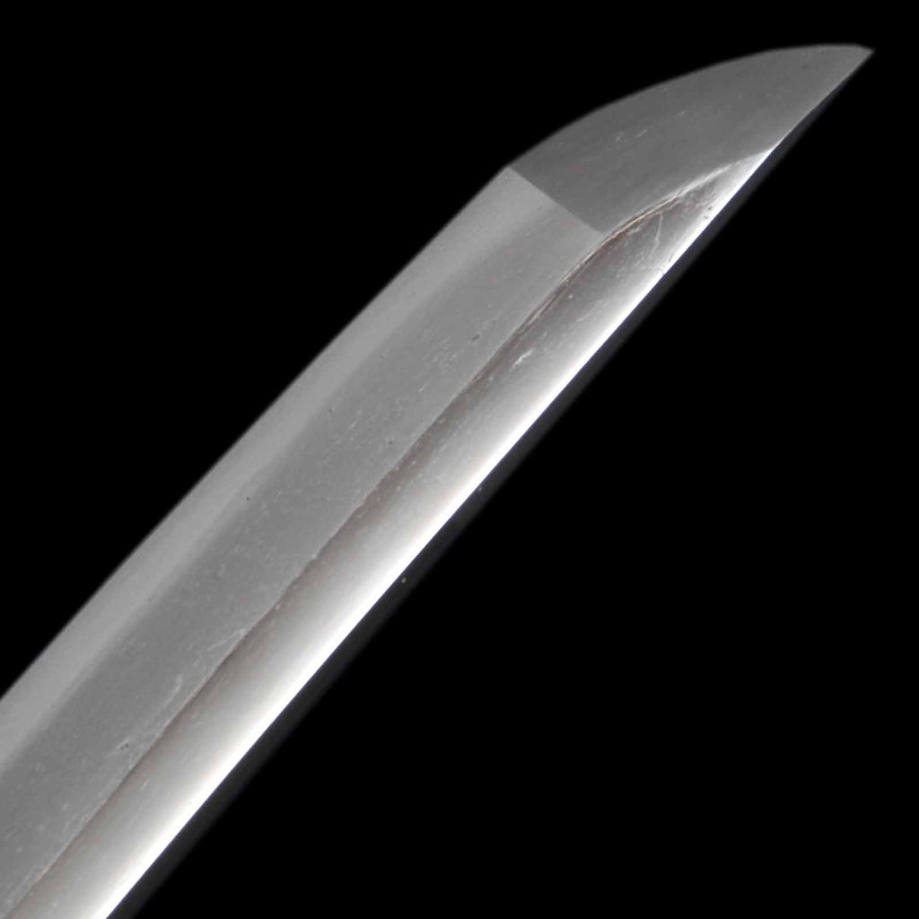 Although this sword has a few kitae flaws, overall it is well preserved and is recommended for iai and batto use at length, weight, and balance. The Hoso-suguha hamon is very visible. The tsukagashira, made of buffalo horn in the Tensho style, is original, and the menuki are of a running horse motif. The plain and round-shaped tsuba is original. The fuchigane was made in recent years, but has an overall orthodox finish without disturbing the taste of the original. The kuroro scabbard is attached with a cotton sageo. Considering the length, balance, and preservation condition, it is a very reasonably priced sword suitable for Iai and batto.