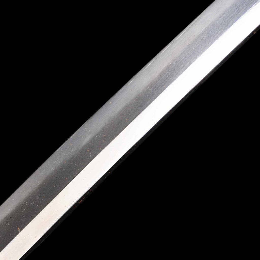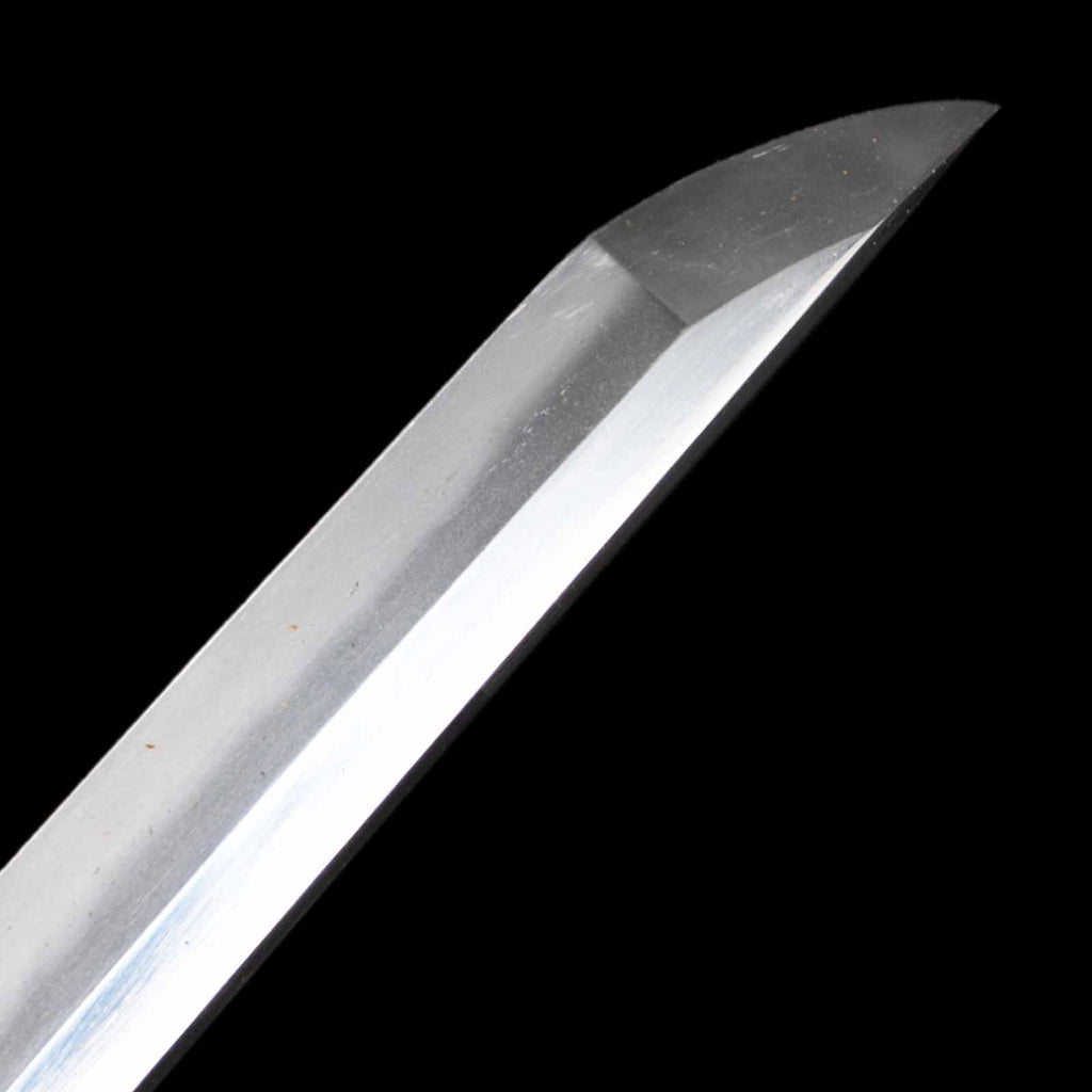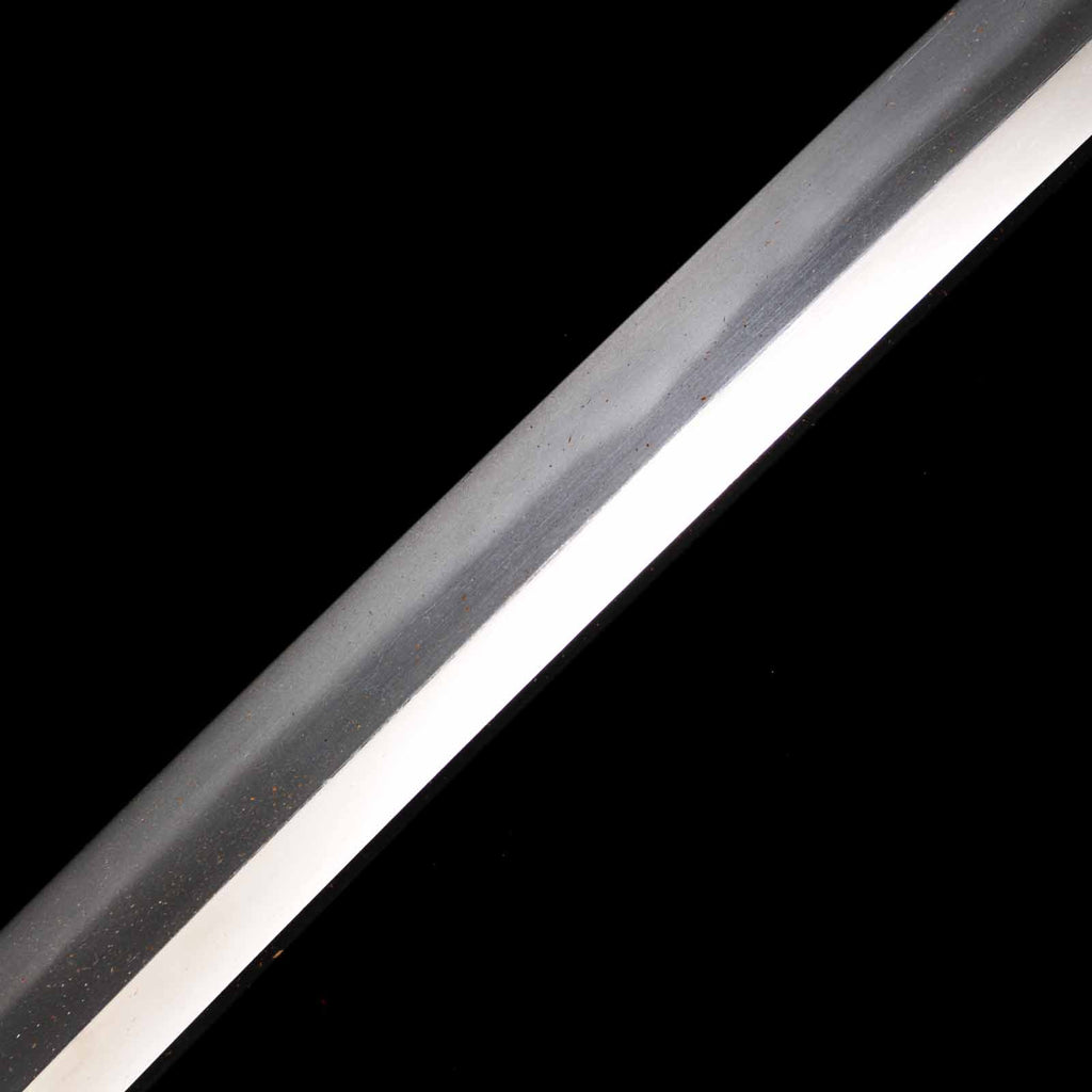 There are no forging flaws, chips, or dents on the blade, and overall the sword is very clean, but there is one dot on the sashi-ura side and two small ones on the mune. The jigane is well packed itame, and the hamon has notare with some wide gunome mixed in. Nie is well attached to hamon, and active ashi can be seen in ha.