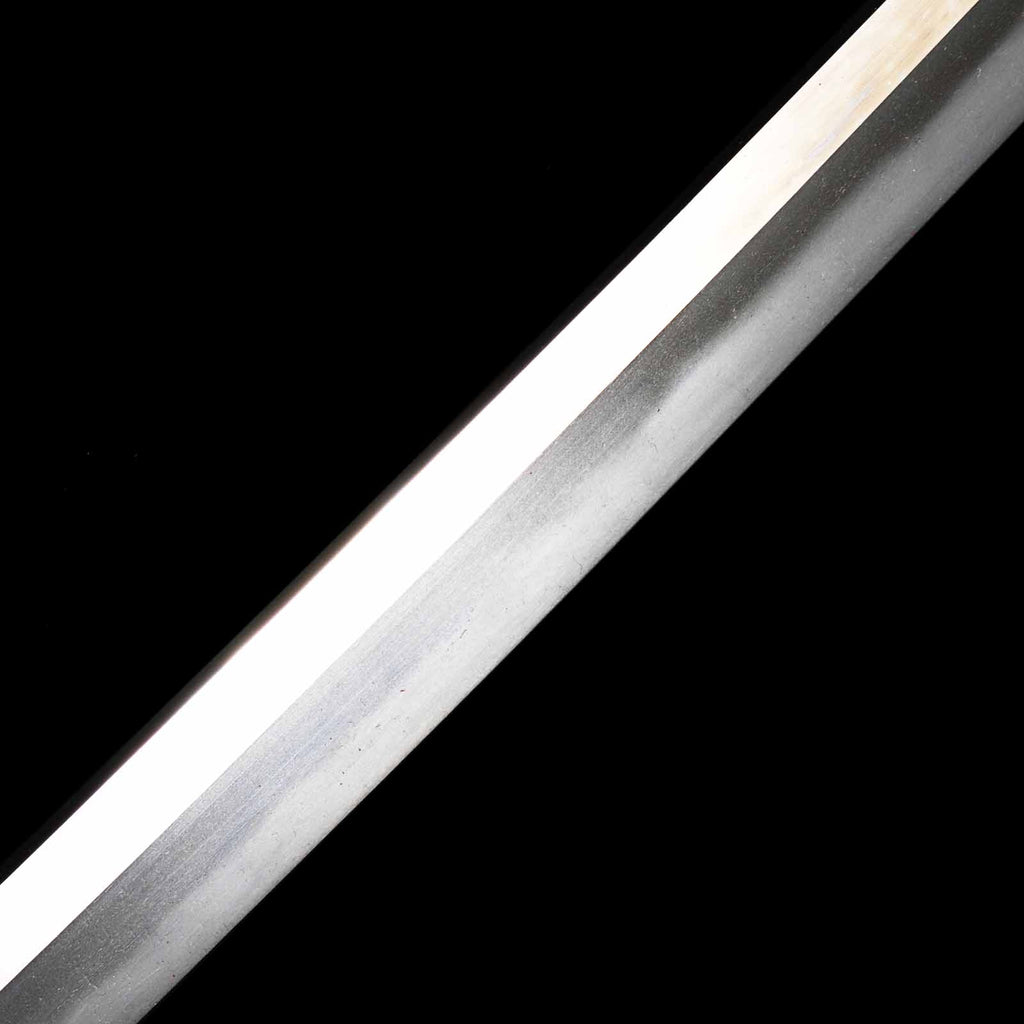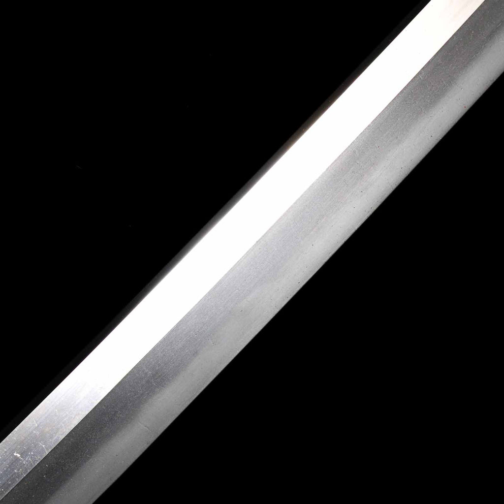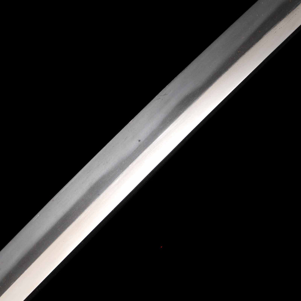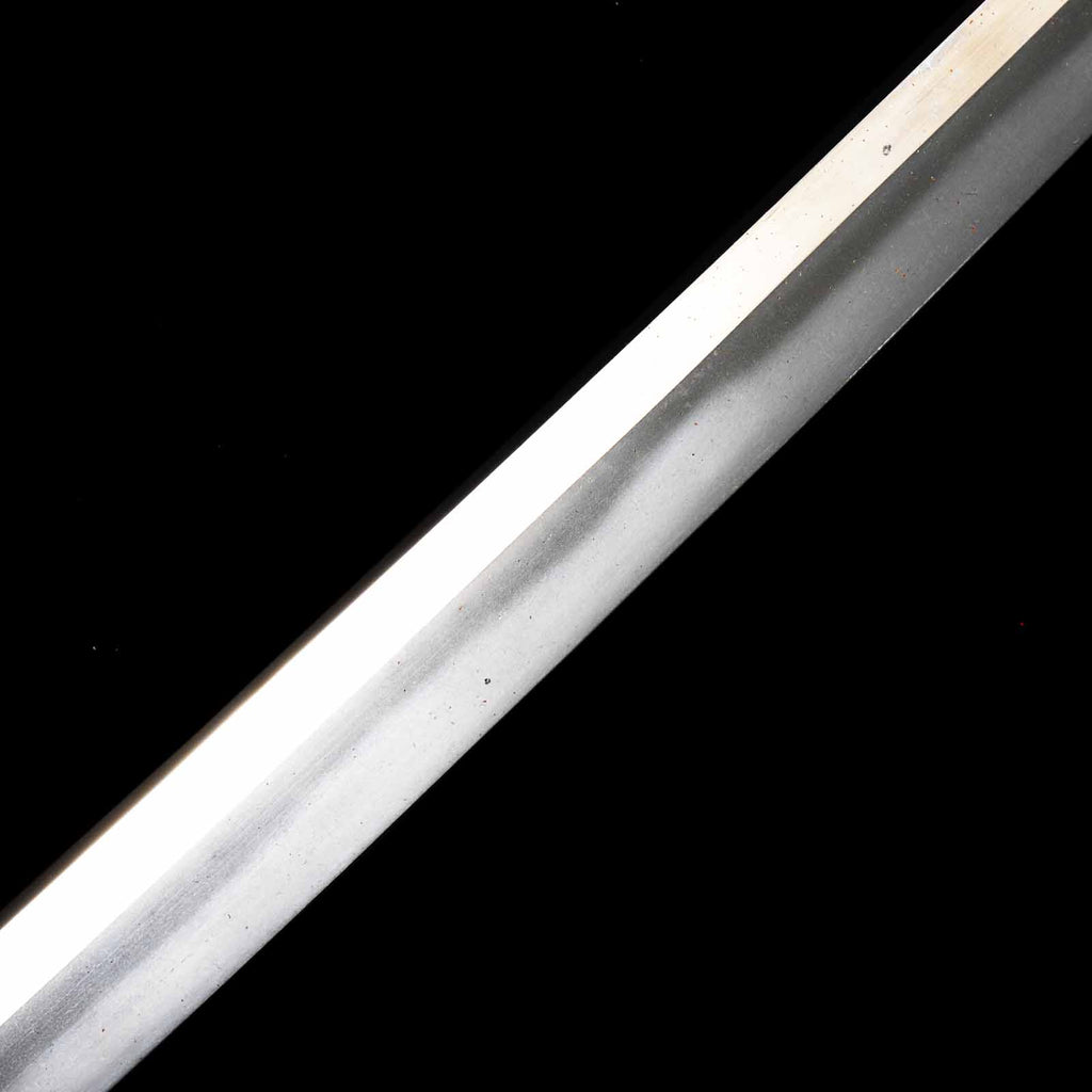 There are no forging flaws, chips, or dents on the blade, and overall the sword is very clean, but there is one dot on the sashi-ura side and two small ones on the mune. The jigane is well packed itame, and the hamon has notare with some wide gunome mixed in. Nie is well attached to hamon, and active ashi can be seen in ha.