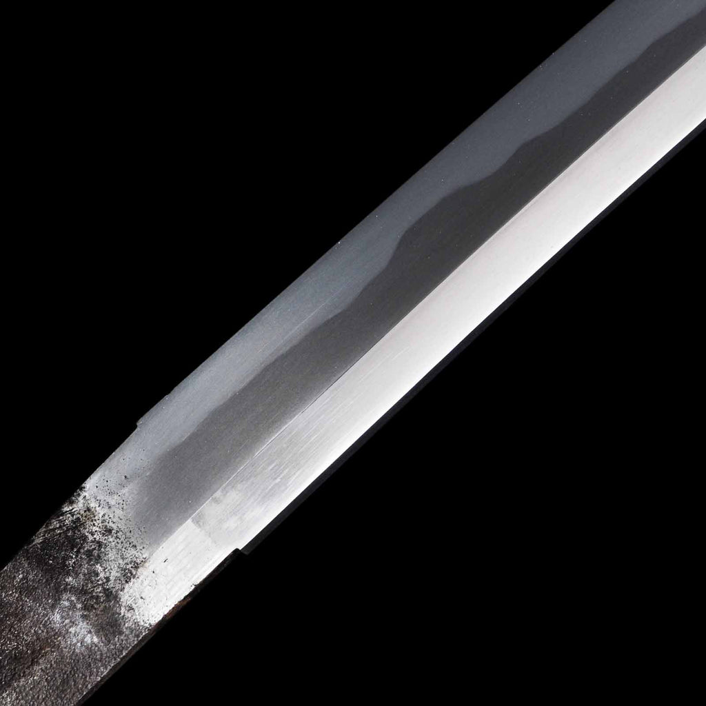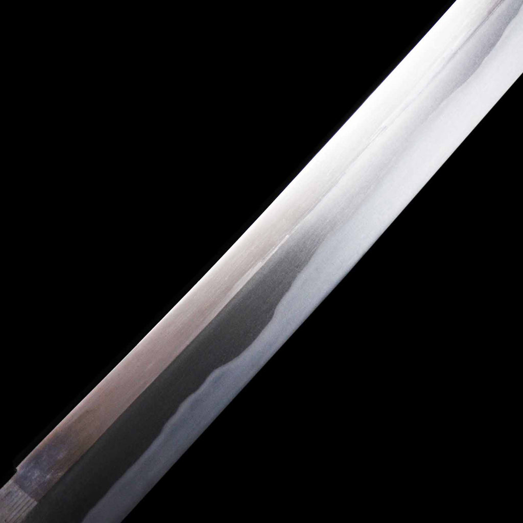 The sword is estimated to have been made in the Shinto period, but it is very well preserved, with no flaws, dents, or chips in the blade, and the only defects are a few light cloudiness on the ridge of the blade due to age. Itame-hada is well packed and the notare style midare hamon shines well. The nie is very tight. There is a barely legible engraving on the nakago, but since it is unclear, it is treated as unsigned on the registration certificate. The tsuba is very exquisitely crafted, but the fuchi-kashira and menuki are not consistent and were installed at a later date. The tsuka has recently been wrapped in black leather, but the wrapping technique is not very good. If you wish, we can offer rewrapping in pure silk for an additional fee of 10,000 JPY. If you would like this option, please note that in the comments section during checkout and we will send you a separate invoice. The main feature of the exterior of this sword is that sharkskin is wrapped around the entire scabbard, even the kurigata is covered in sharkskin. From the koiguchi to about 18 cm, the scabbard also has a carving called kizami, over which the sharkskin is wrapped, which is a highly sophisticated technique. These swords are ideal for iai and batto, and with their luxurious exteriors, they are recommended for all fans of Japanese swords.