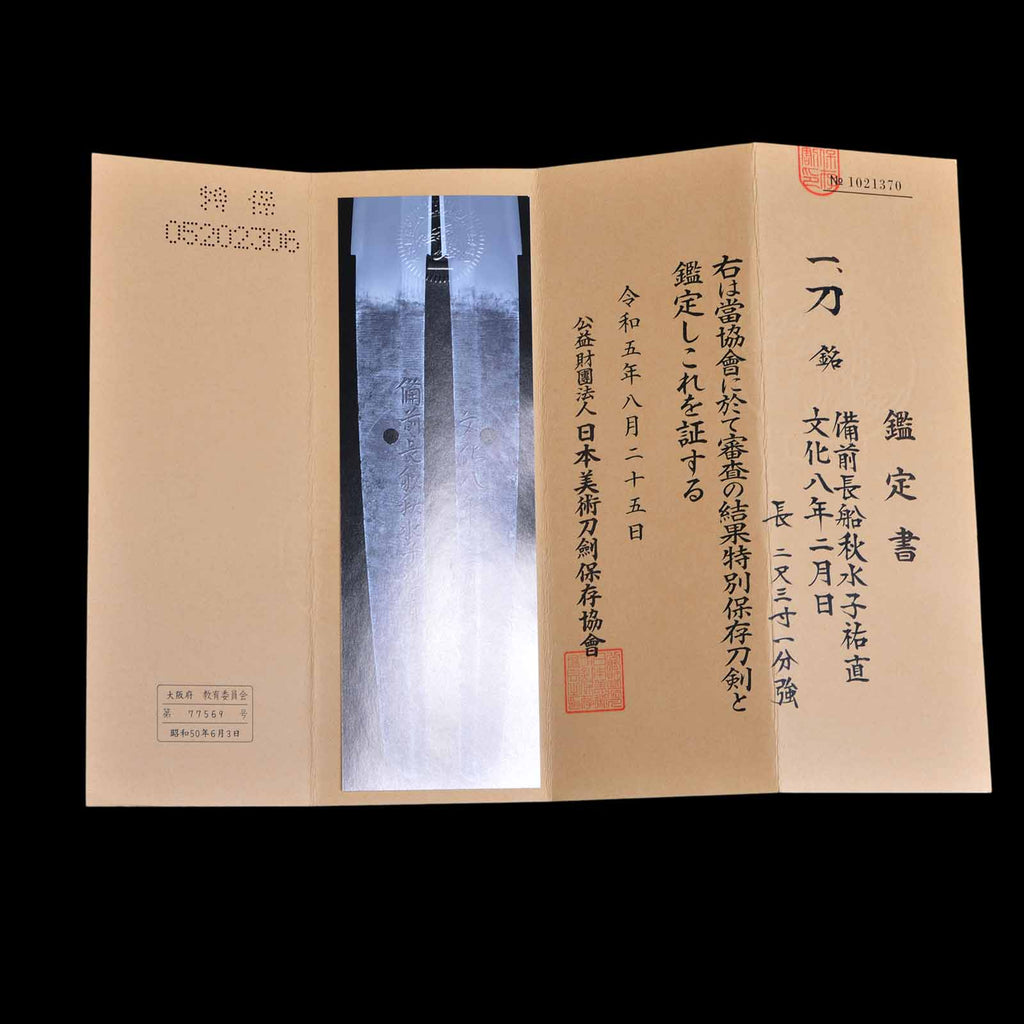 - Signature: Bizen Osafune Shusuishi Sukenaga(front), Bunka Hachinen Nigatsu-bi(back)