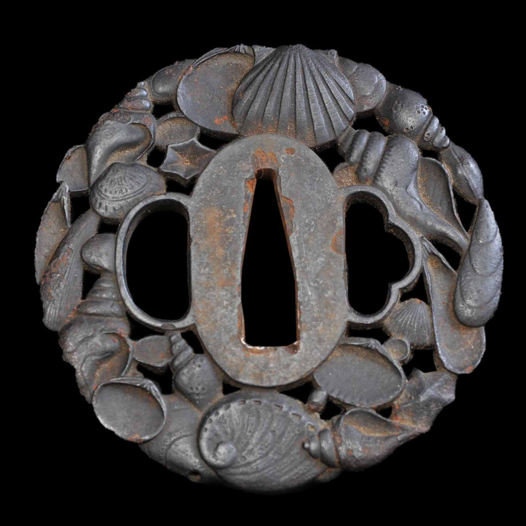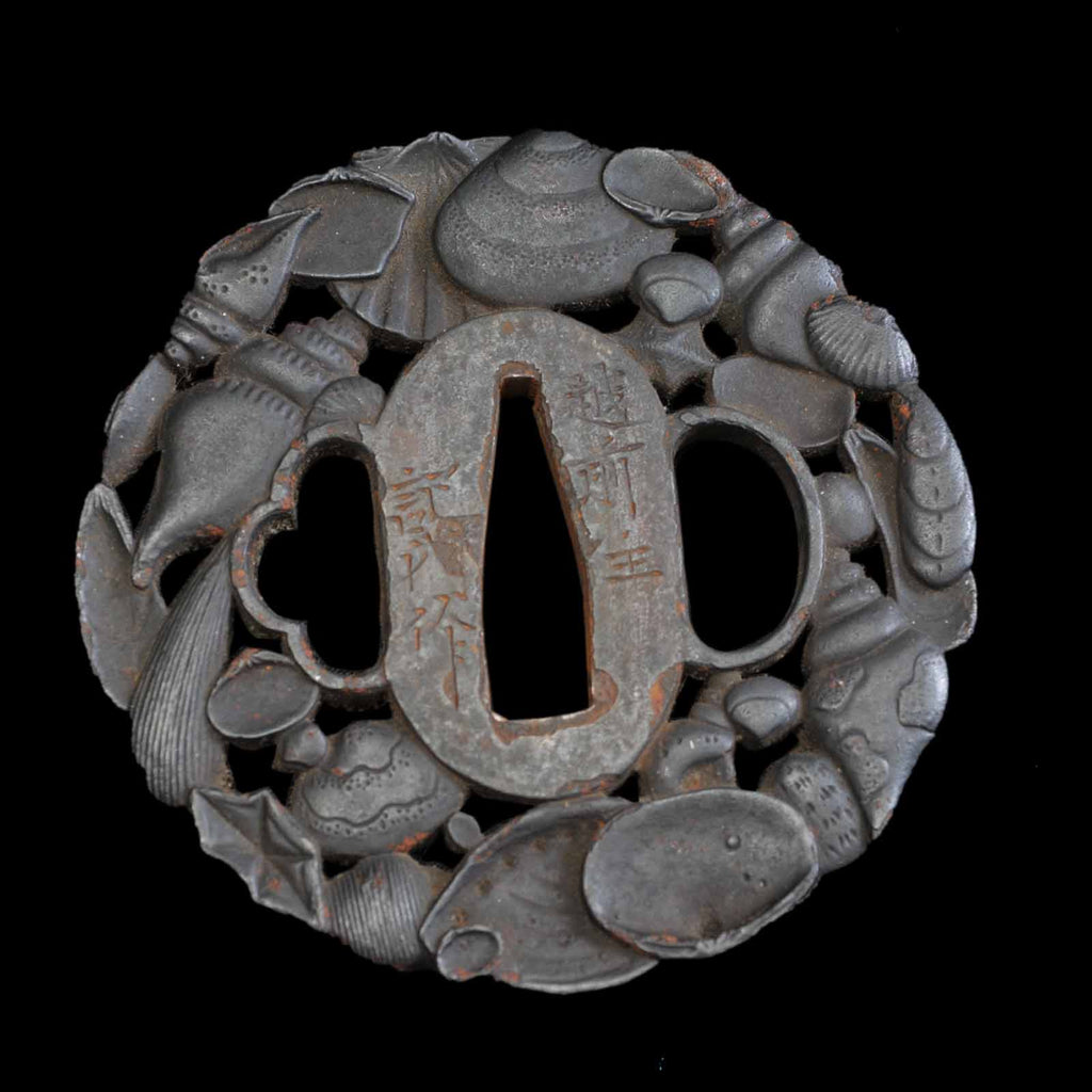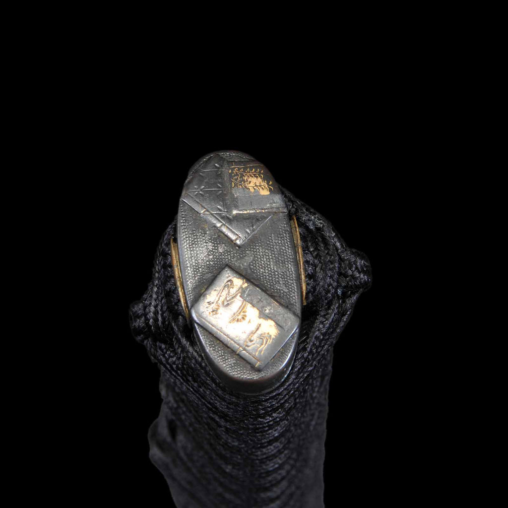 All of Koshirae's fittings are from that period, and the tsuba is engraved with the names Echizen Ju Kinai Saku. The Kinai school made many magnificent tsuba, but the engraving of the name on this tsuba is characteristic of the master Iri Kinai.