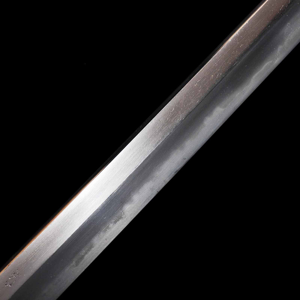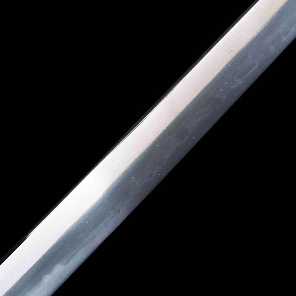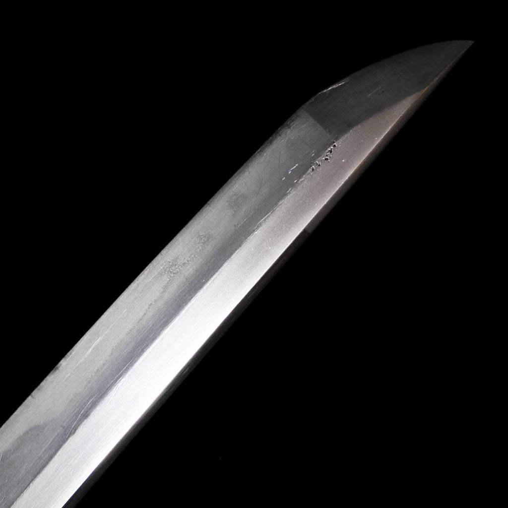 This sword blade is itame hada with jinie. The hamon is a gnome in konye style, with a high and low gnome. In addition, within the ha, you can also enjoy seeing hataraki such as chojiashi and sunagashi. And the boshi are returned to nakamaru in midare style. The condition of the sword is relatively good, but there are some flaws in places. There are a few small spots of rust about 10 cm from the munemachi on the sashiomote side. There are also some small dots of rust about 18 cm from the cutting edge. There is a small dent about 18 cm from the hamachi on the sashiura side. And there is a forging flaw at a point about 20 cm away.