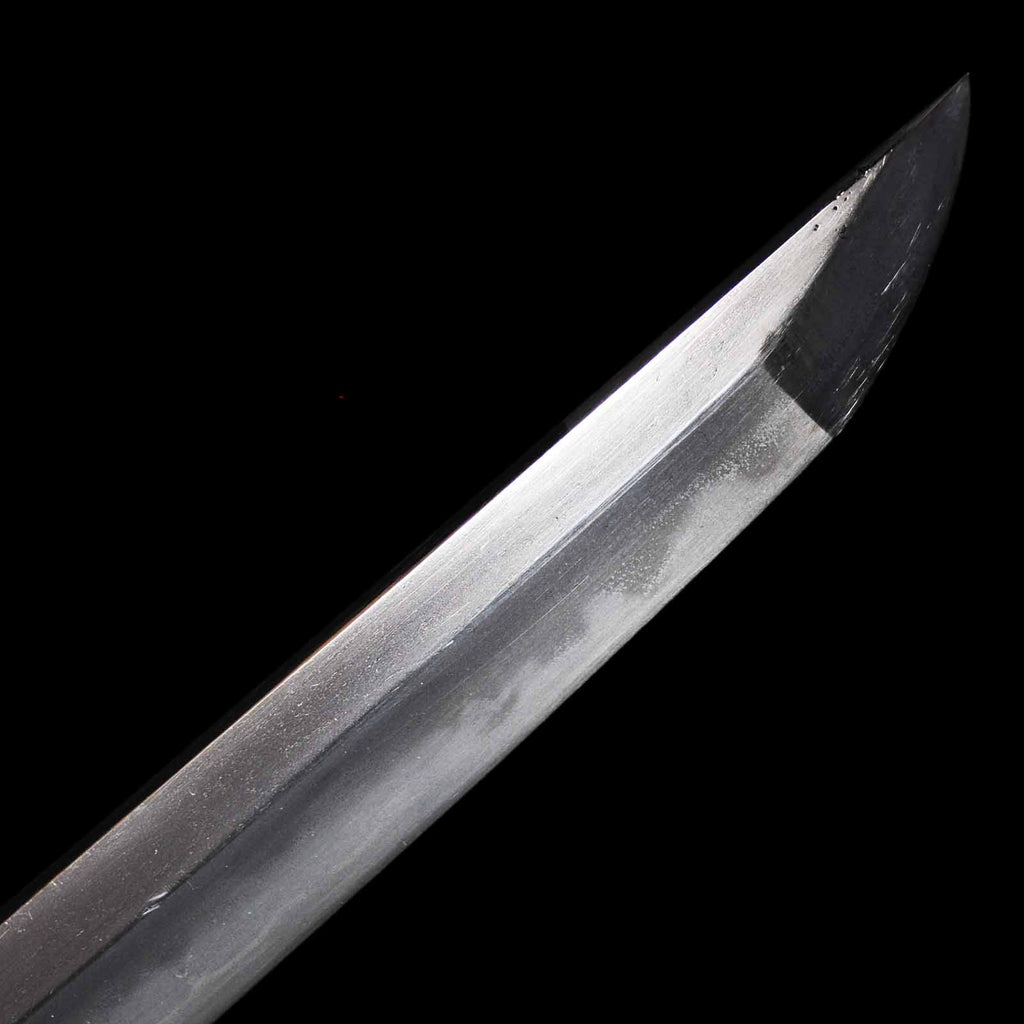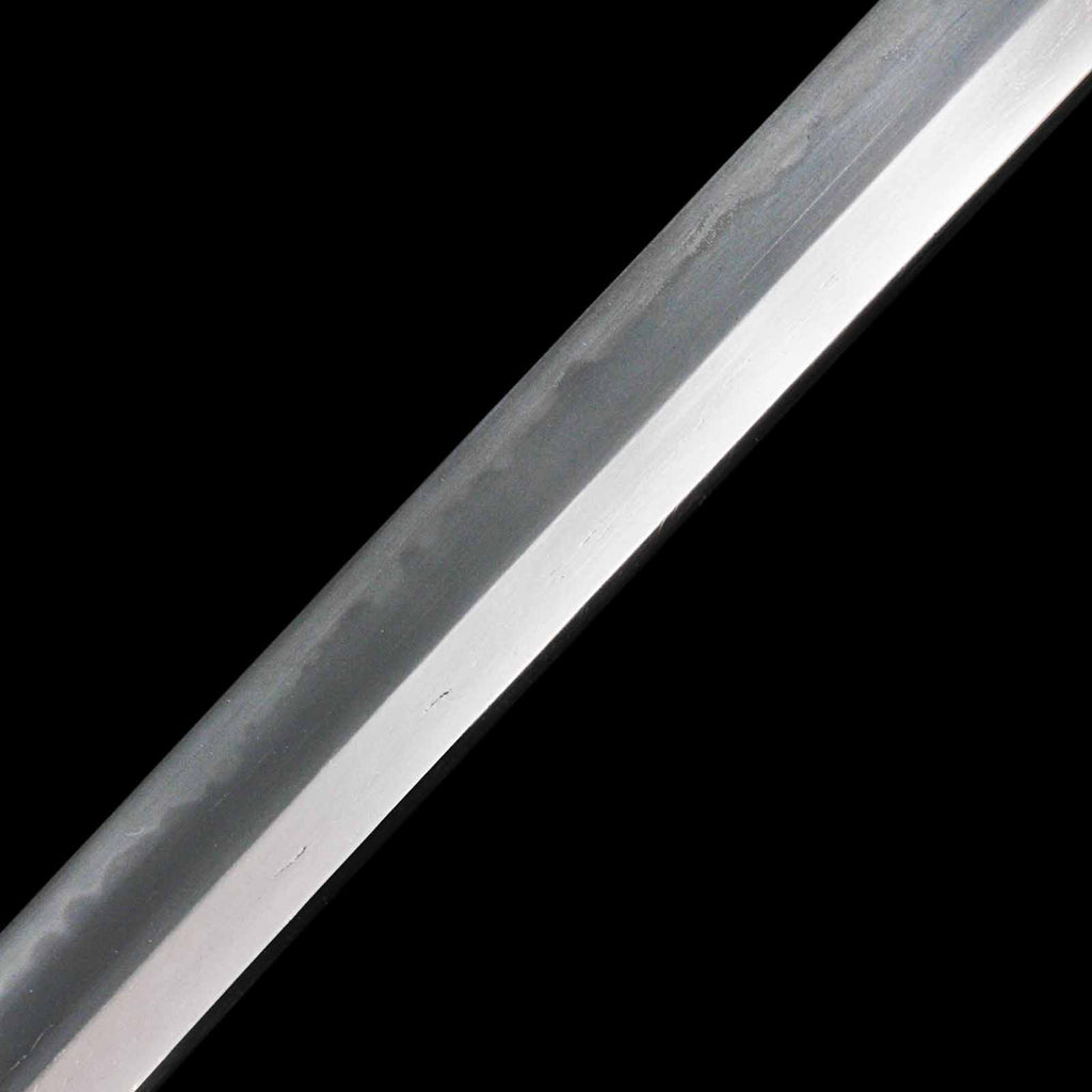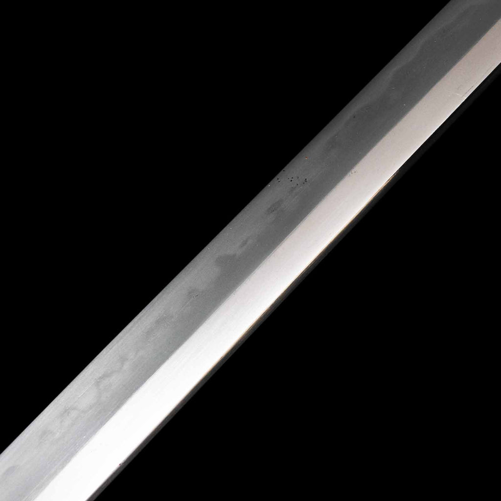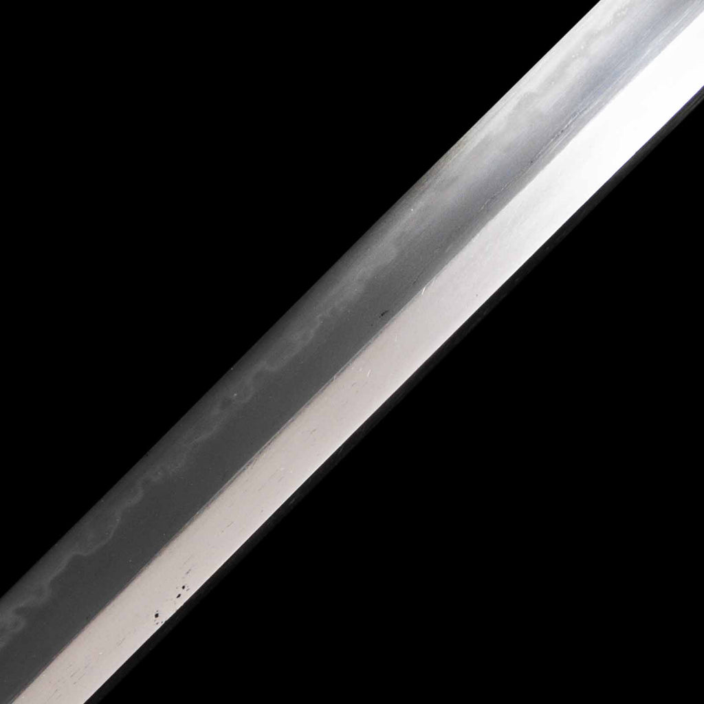 This sword blade is itame hada with jinie. The hamon is a gnome in konye style, with a high and low gnome. In addition, within the ha, you can also enjoy seeing hataraki such as chojiashi and sunagashi. And the boshi are returned to nakamaru in midare style. The condition of the sword is relatively good, but there are some flaws in places. There are a few small spots of rust about 10 cm from the munemachi on the sashiomote side. There are also some small dots of rust about 18 cm from the cutting edge. There is a small dent about 18 cm from the hamachi on the sashiura side. And there is a forging flaw at a point about 20 cm away.