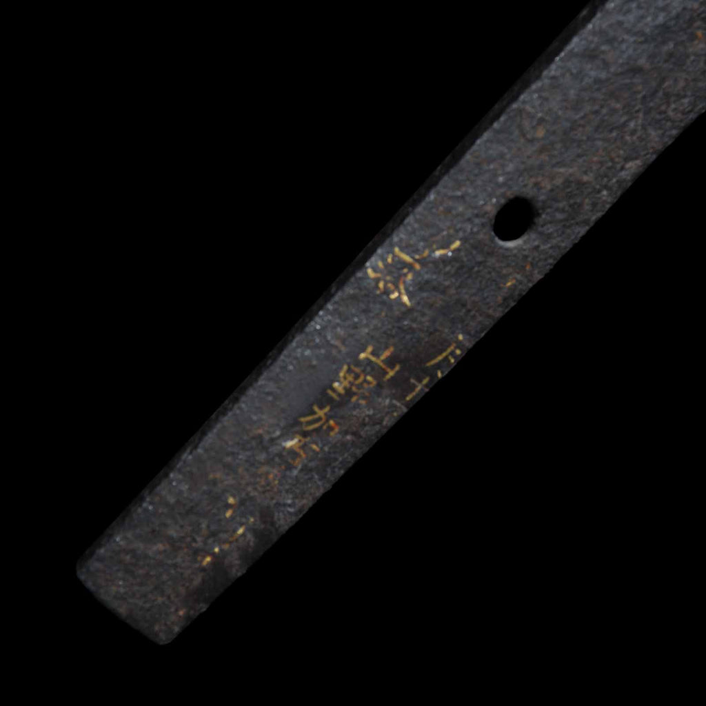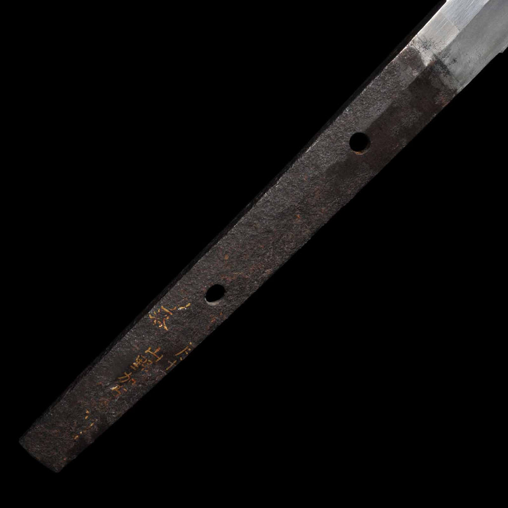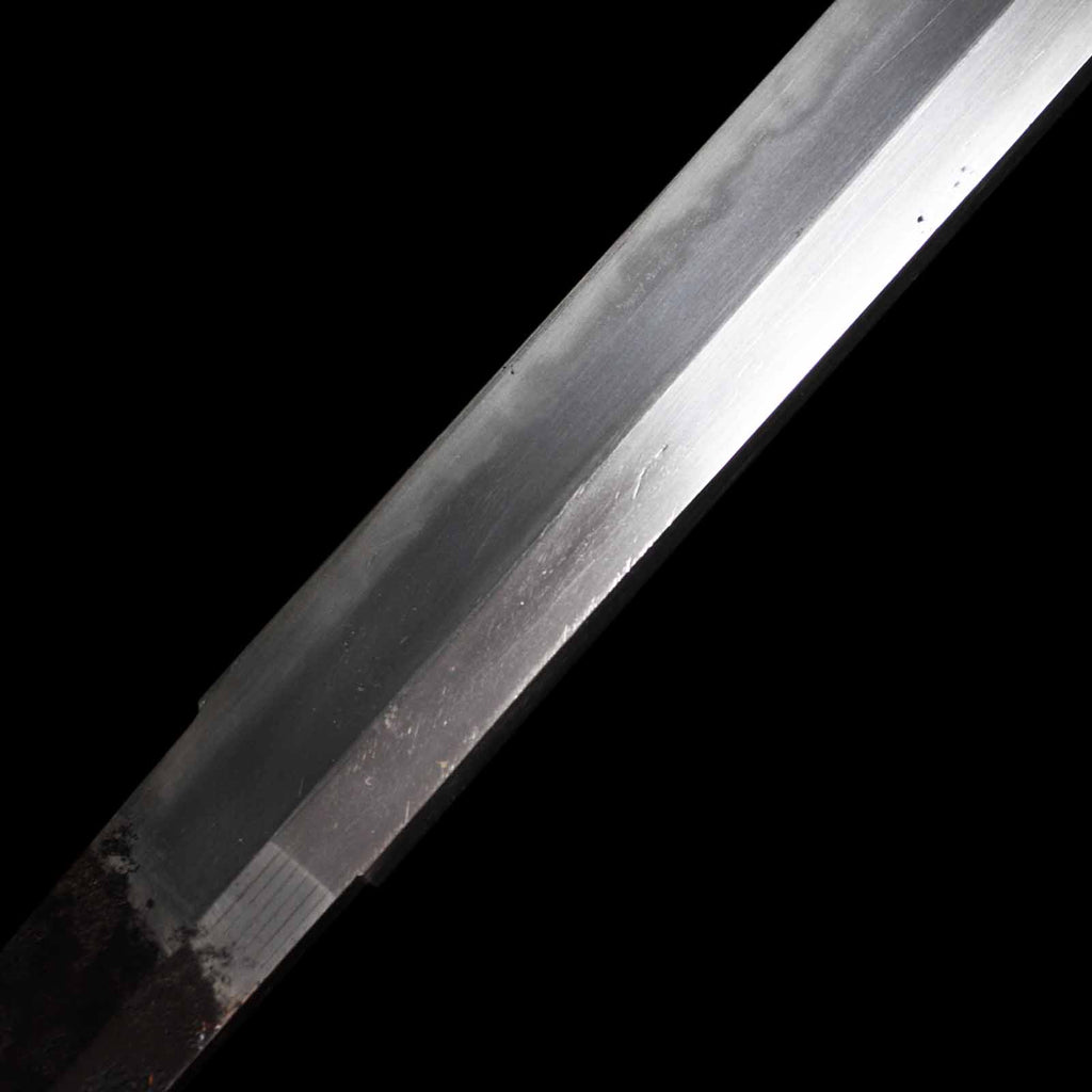Tsuguhiro was a leading swordsmith in the Echizen region (present-day Fukui Prefecture) during the Shinto period and was a pupil of the third Yasutsugu. He was first in Echizen, then moved to Zeze in Omi (present-day Shiga Prefecture), and finally to Edo (present-day Tokyo). Echizen shinto katanas were used by samurai as very practical swords with excellent cutting ability, and were very popular during the Edo period when the Tokugawa family ruled. This katana bears evidence of having been measured for sharpness and strength by Yamano Kaemon Nagahisa, and his name is engraved on the Nakago. Yamano was the founder of the Yamano school of test swordsmanship, which was active from the Kan'ei to Kan'bun periods. Originally, the sword was inscribed with gold inlays, but some of the inlays have peeled off due to age. Also, the name of Tsuguhiro has been cut off in the middle of the blade due to the shortened length of the sword.