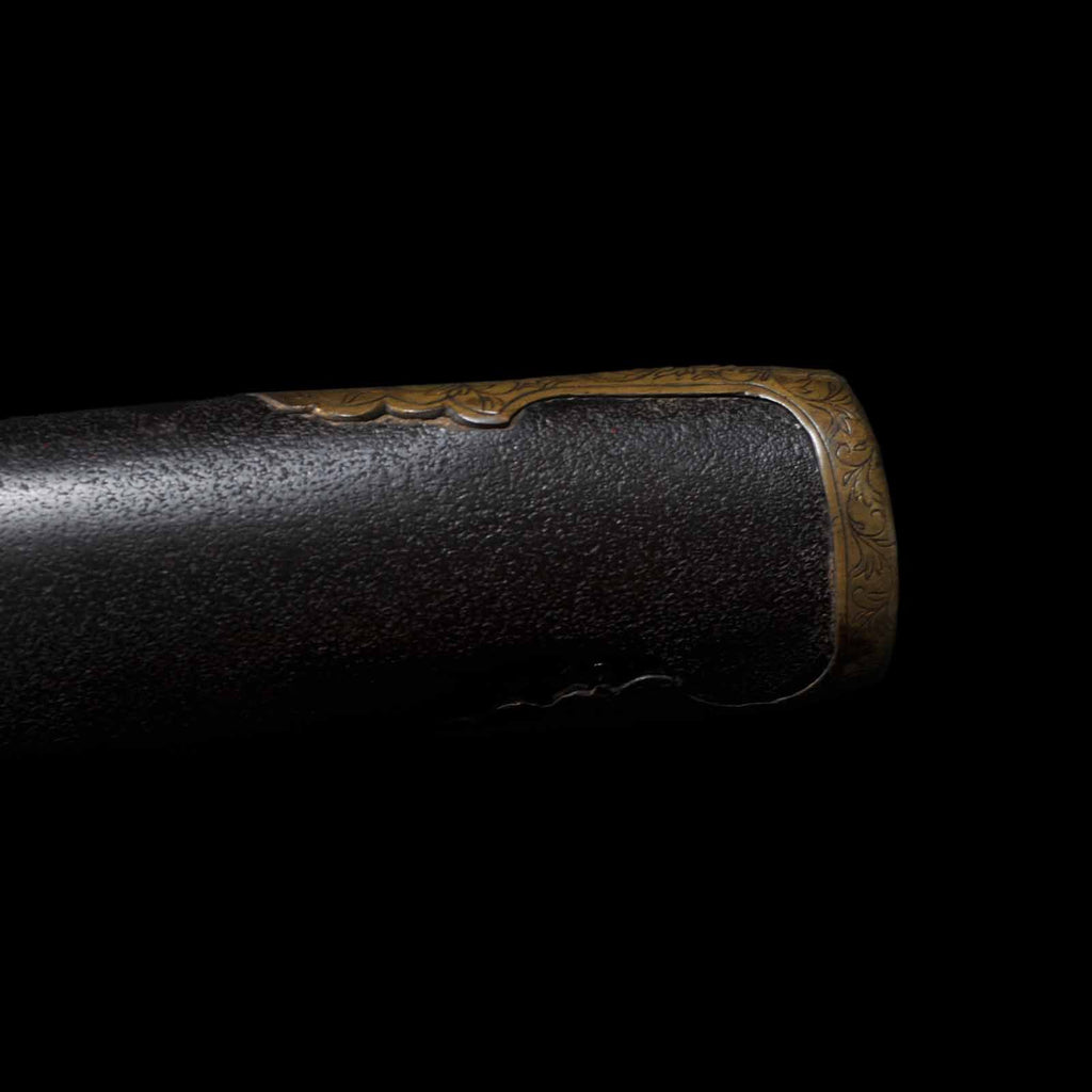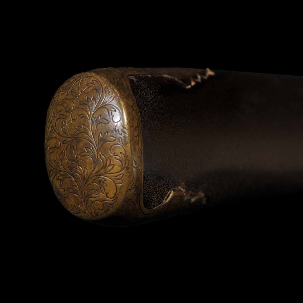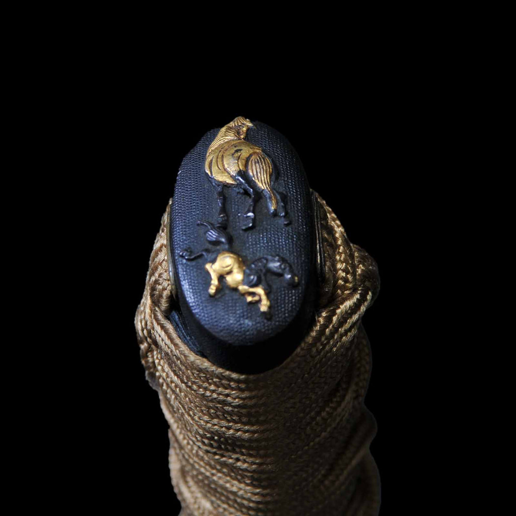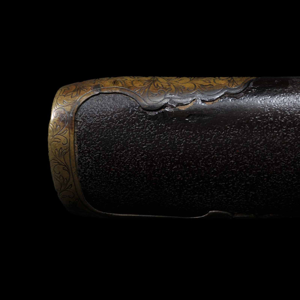 The koshirae is made of metal fittings of the period, but only the menuki on the sashiomote seems to have been replaced with another one in later periods. The scabbard is dark brown Kanshitsu-nuri with a kuwagata-shaped o-jiri attached to the butt of the scabbard. The middle of the scabbard does not have Kanshitsu-nuri, so perhaps the scabbard was originally equipped with metal fittings at this point.