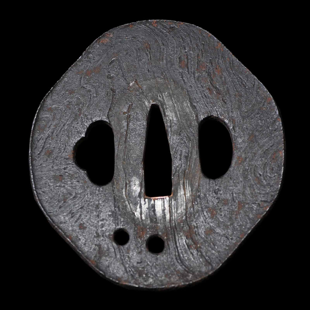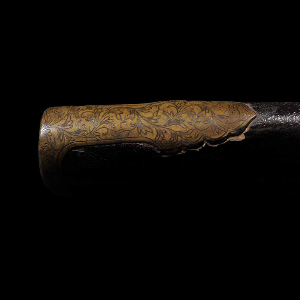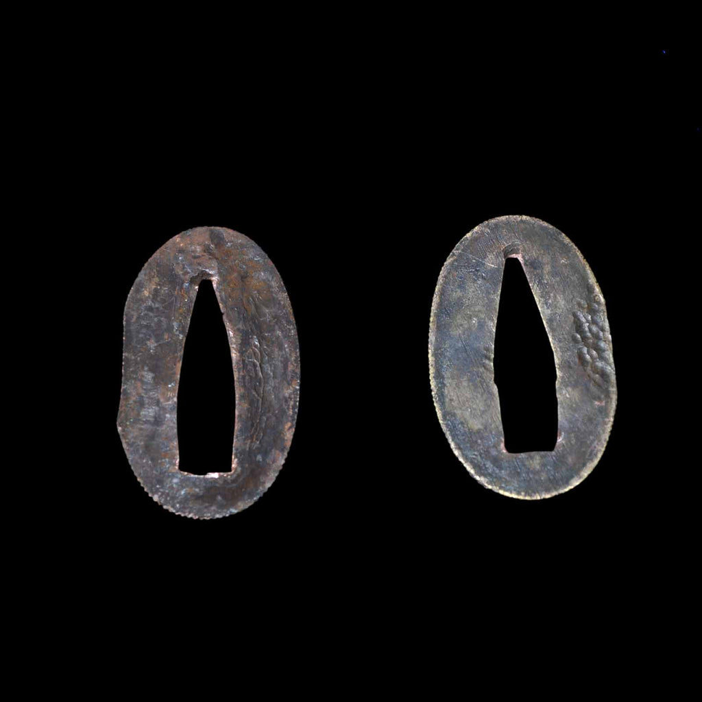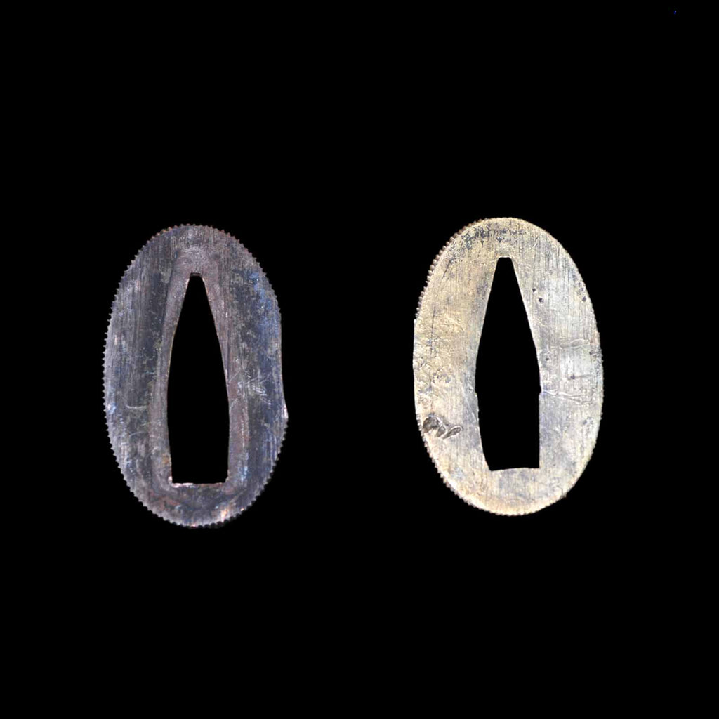 The koshirae is made of metal fittings of the period, but only the menuki on the sashiomote seems to have been replaced with another one in later periods. The scabbard is dark brown Kanshitsu-nuri with a kuwagata-shaped o-jiri attached to the butt of the scabbard. The middle of the scabbard does not have Kanshitsu-nuri, so perhaps the scabbard was originally equipped with metal fittings at this point.
