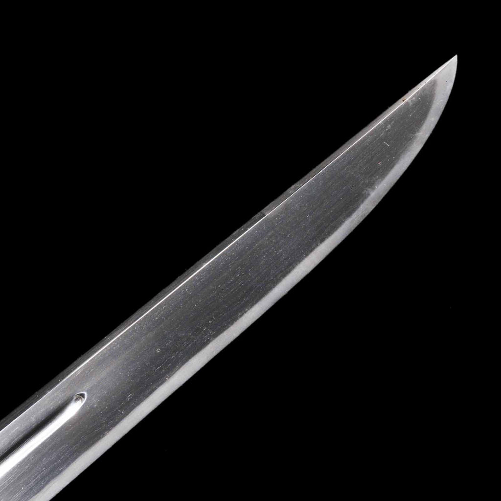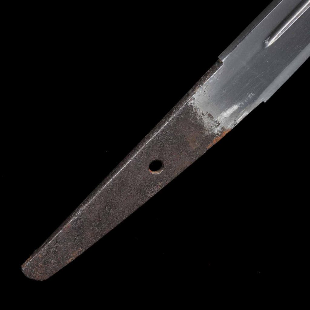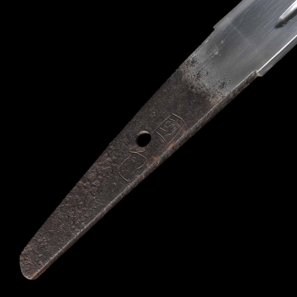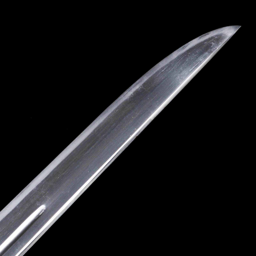 The sword is in excellent condition with no flaws, rust, or chips and is kenzen ( healthy). The jigane is itame hada with yubashiri. The hamon is a thin suguha, with a slight tendency to be notare in some places. Kunikane's name is engraved on the nakago.