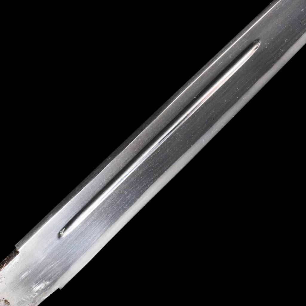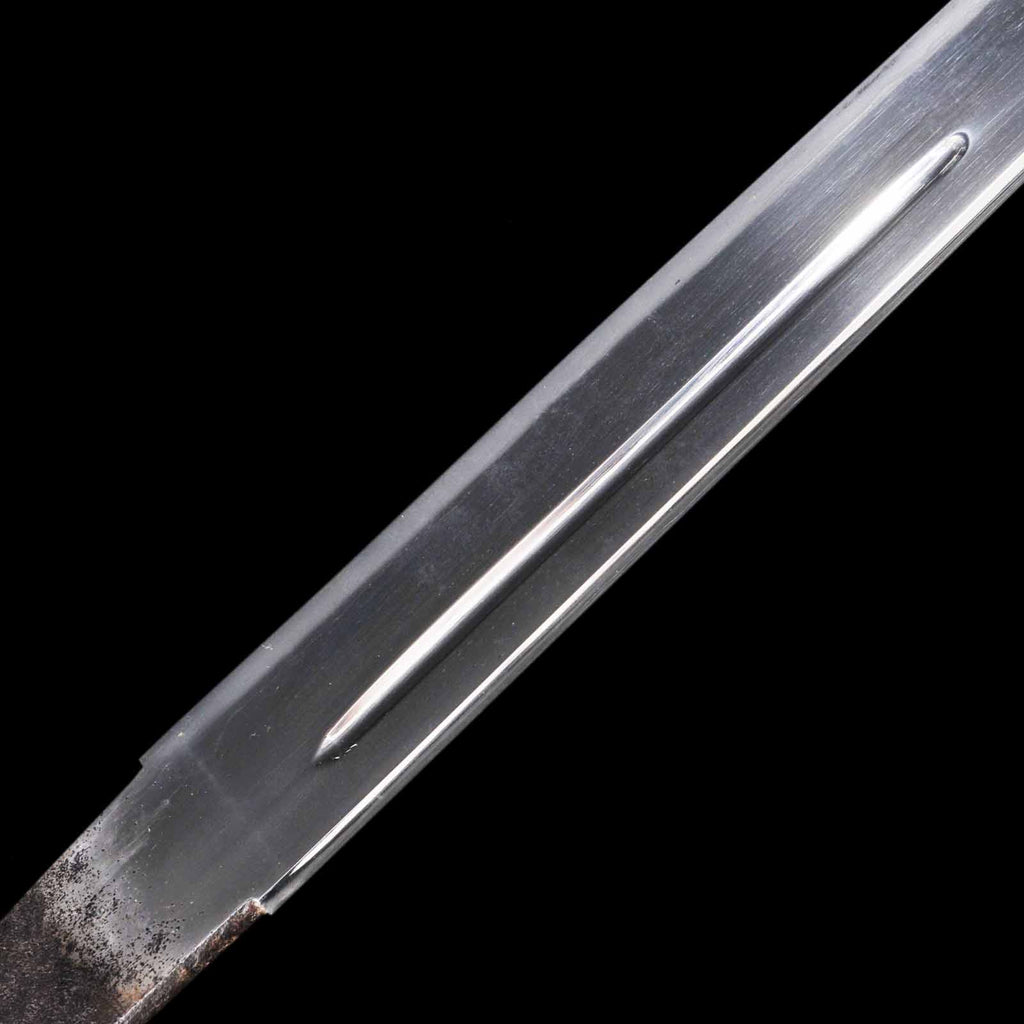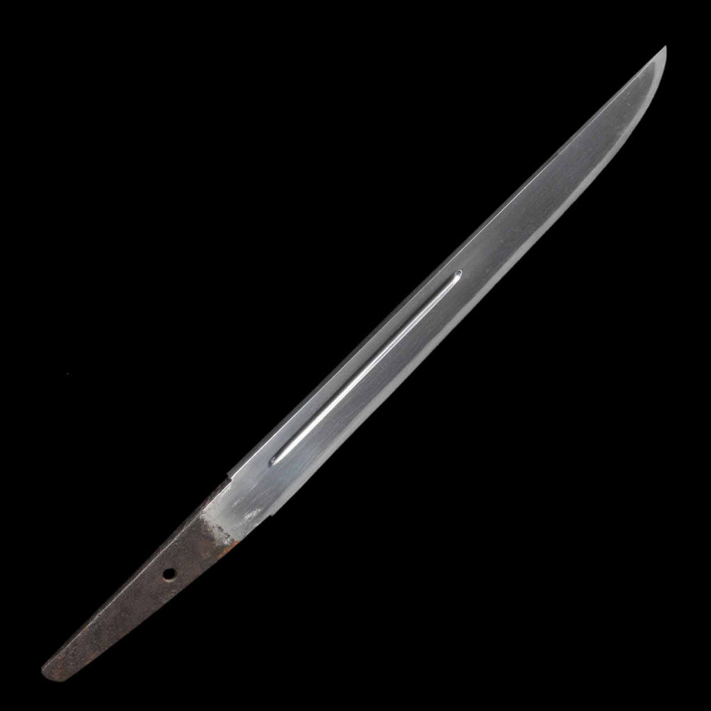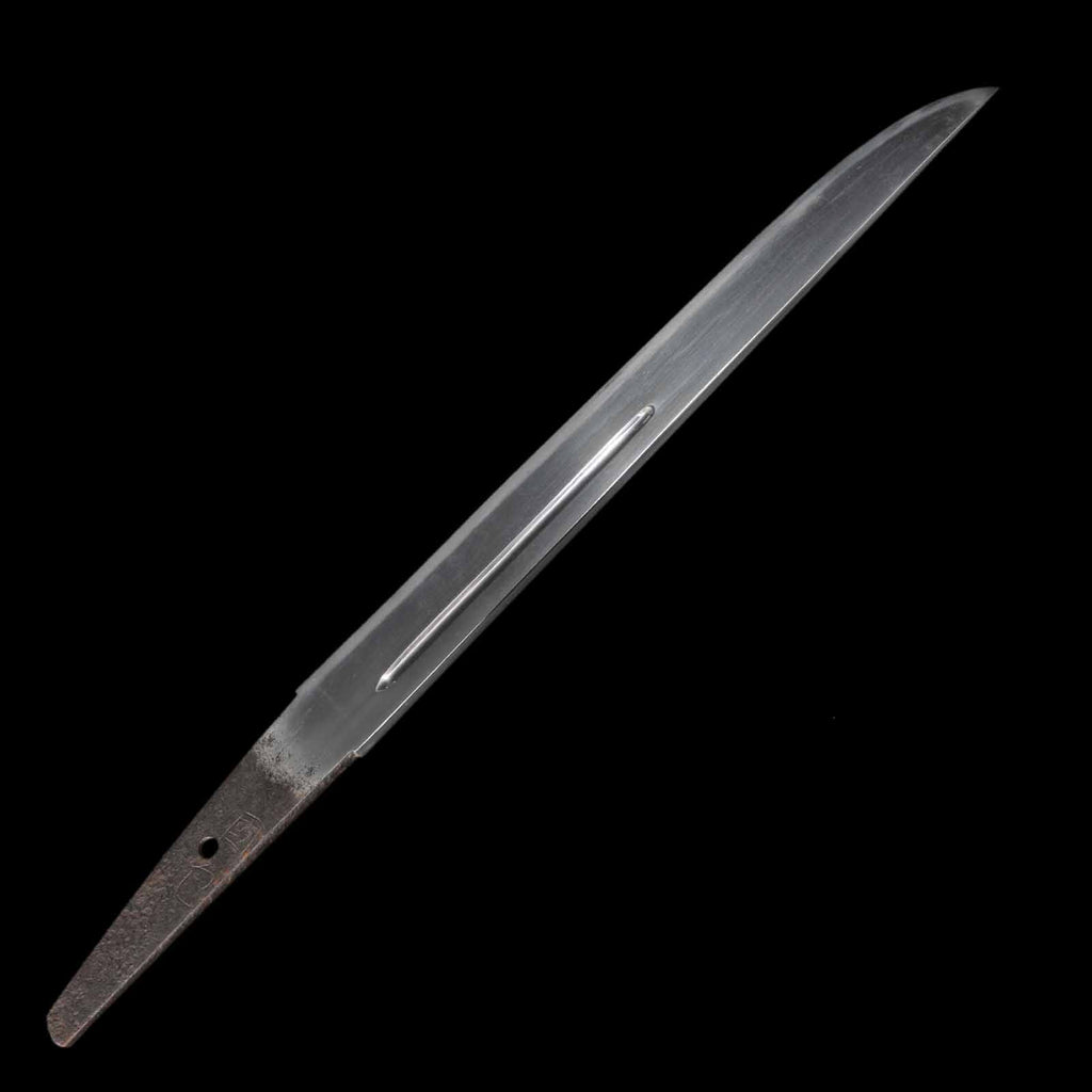 The sword is in excellent condition with no flaws, rust, or chips and is kenzen ( healthy). The jigane is itame hada with yubashiri. The hamon is a thin suguha, with a slight tendency to be notare in some places. Kunikane's name is engraved on the nakago.
