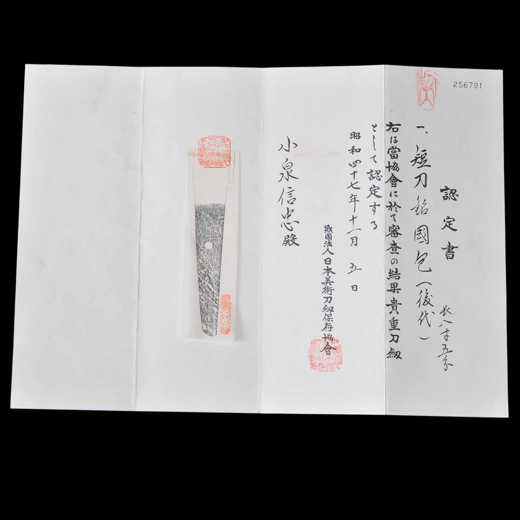 Kunikane, whose real name was Hongo Genzo, was a renowned swordsmith recognized by the Sendai clan. Since then, the name has been passed down through the Edo period over difficult issues. In November 1972, the Society for Preservation of Japanese Art Swords recognized this work as a valuable sword as a late Kunikane work and issued a certificate of authenticity.