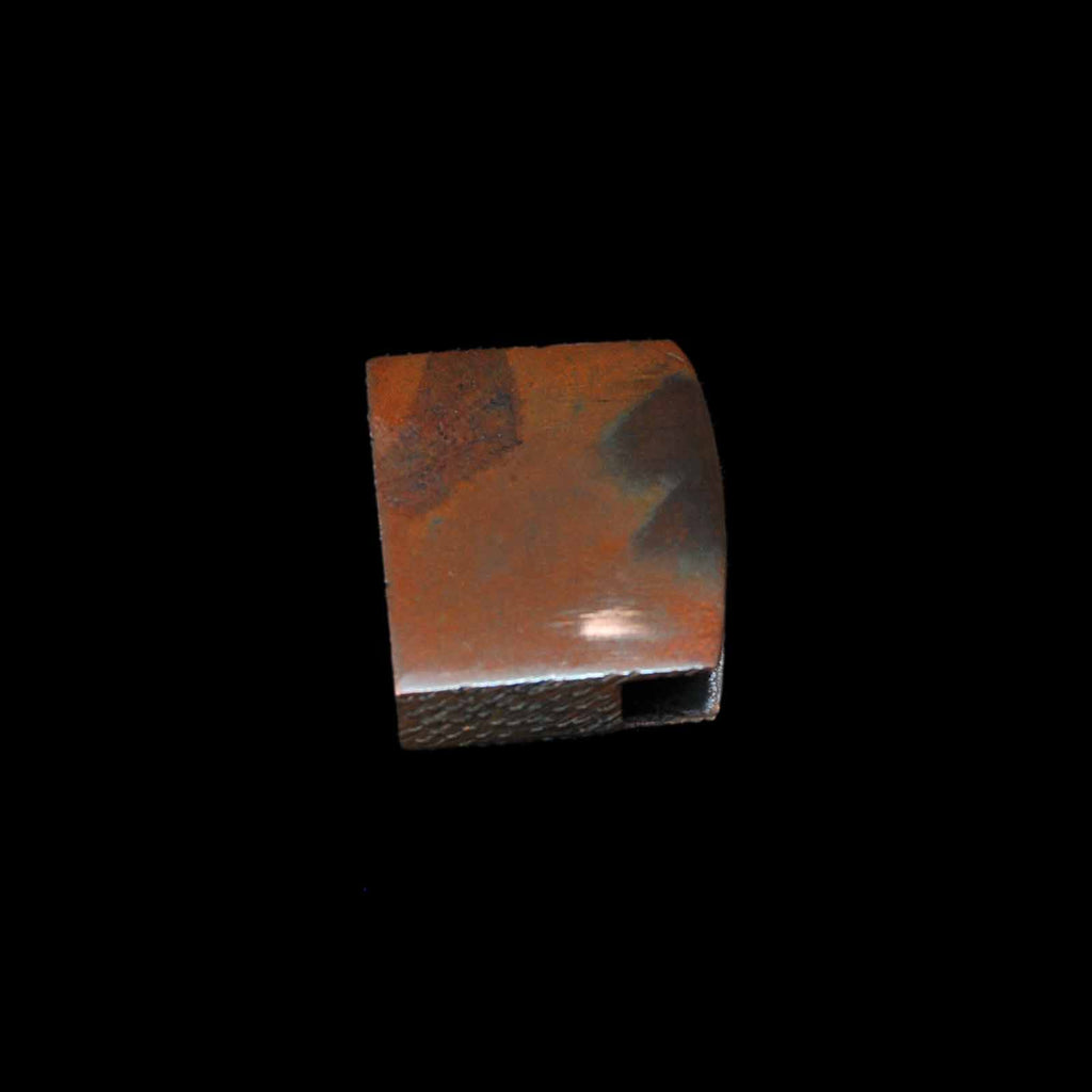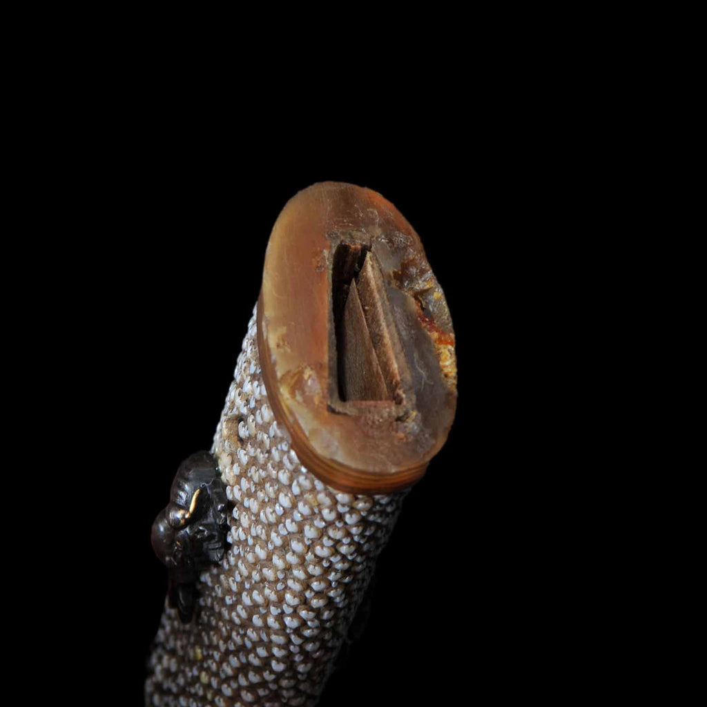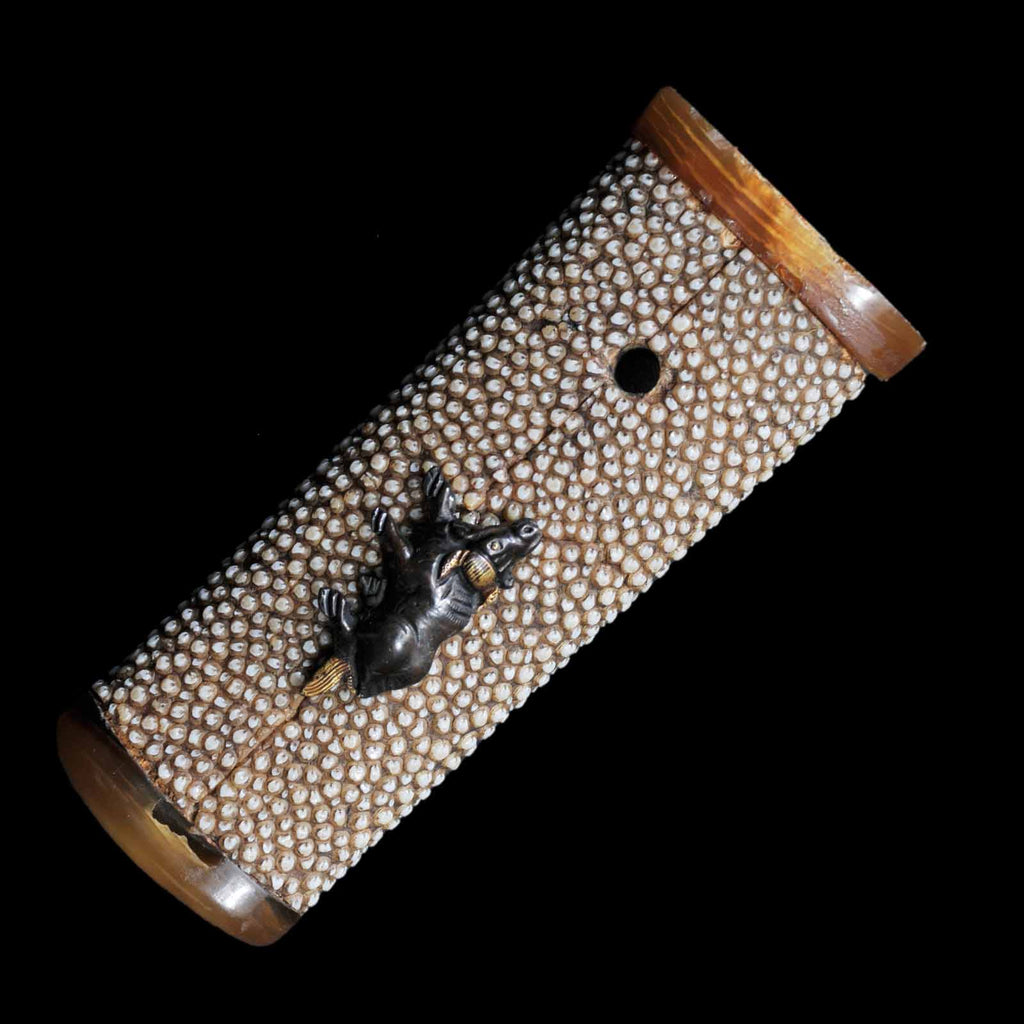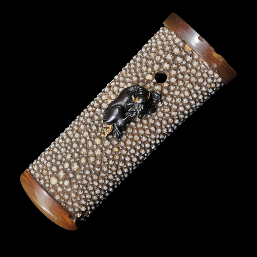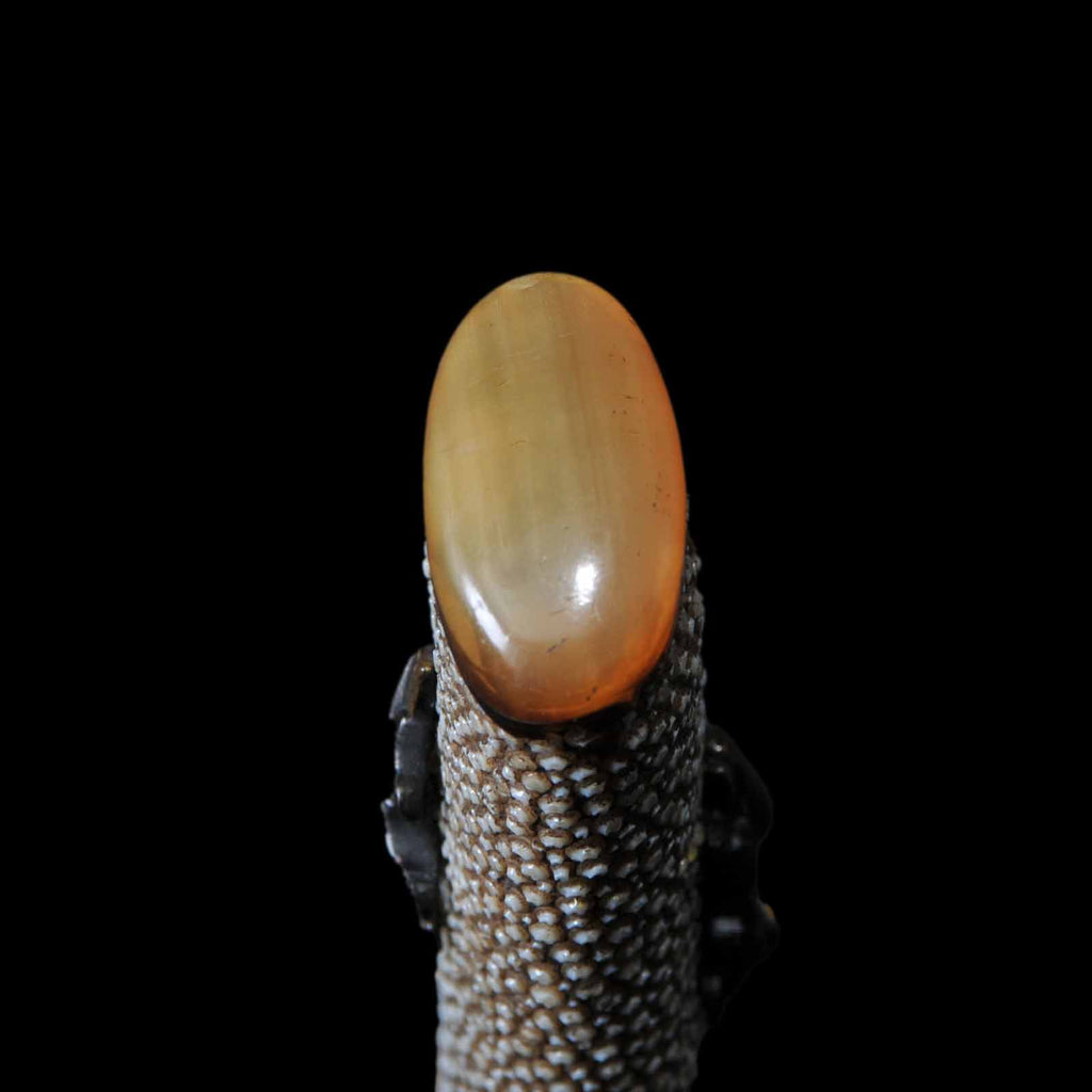 The koshirae is aikuchi style, and the tsuka is dashizame (bare sharkskin) with a cow menuki. For a tanto, it is quite thick and powerful, reminiscent of yoroshidoshi. The fuchikashira, koiguchi and kojiri are made of amber. There are some chips on each of them due to age. The scabbard is decorated with the family crest of Mitsuba Aoi, which is associated with the Tokugawa family.