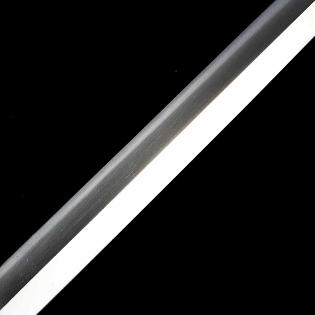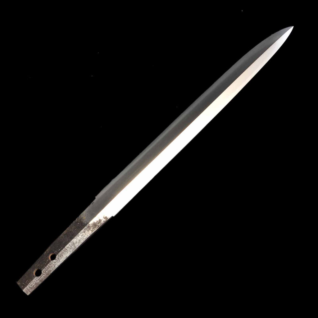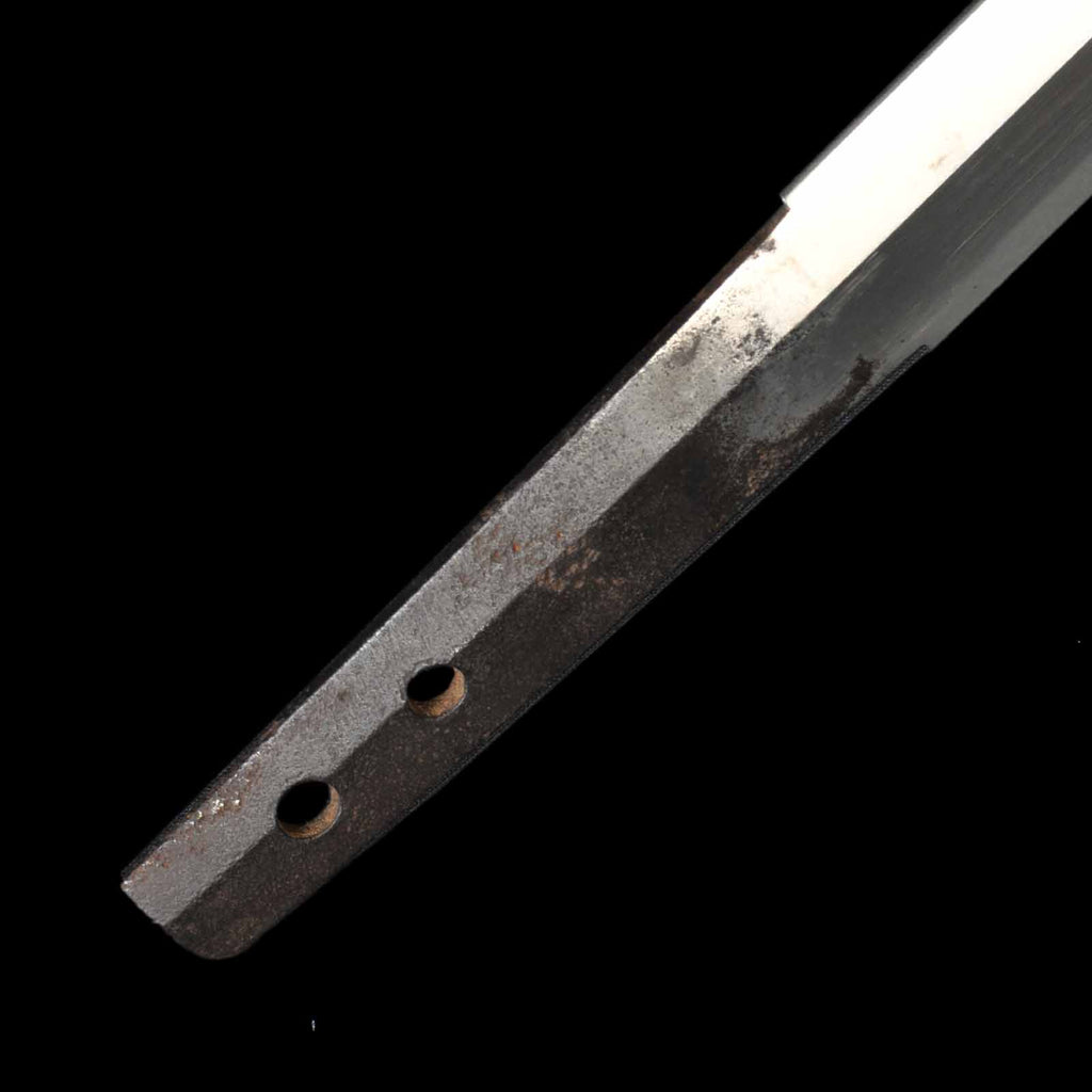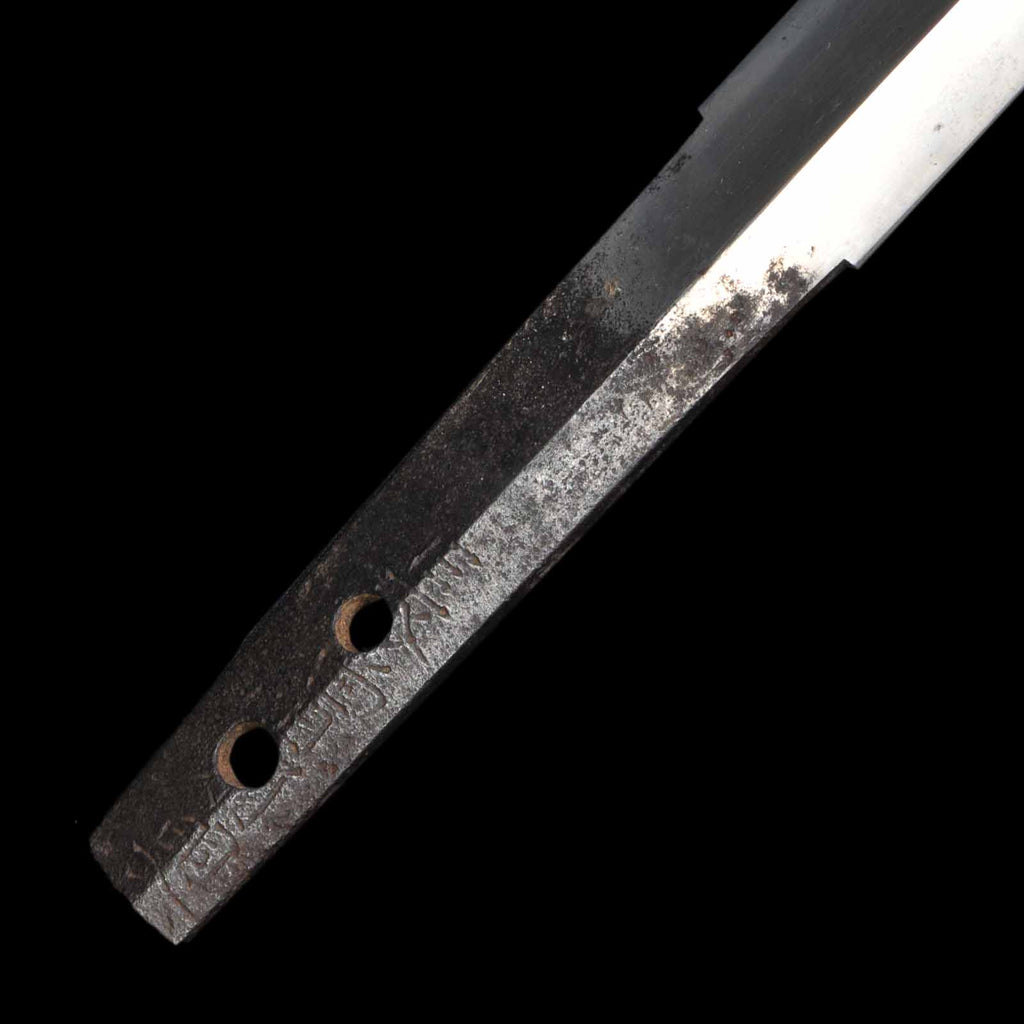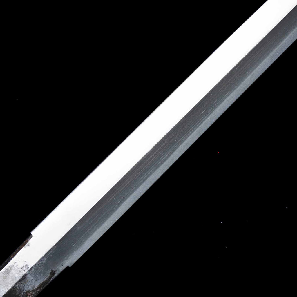The sword is very well preserved with no flaws or chips. The well-packed itame hada is decorated with suguha hamon on one blade and gunome hamon on the other. Both hamon have well-tightened nie. The name "Nagasone Oki" is engraved on the nakago, probably the name of a swordsmith of the Nagasone clan, but it is assumed that the nakago has been shortened by suriage and the name has been cut off in the middle.