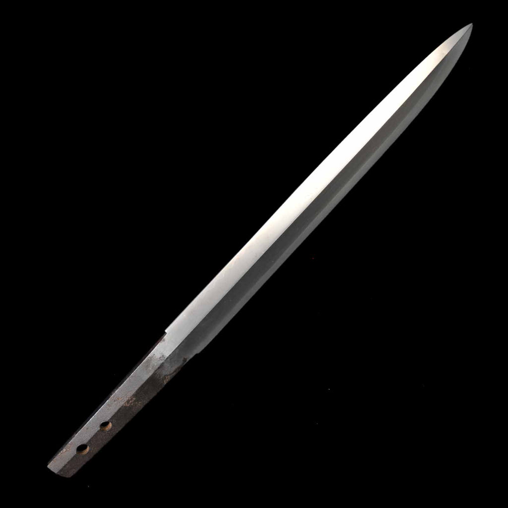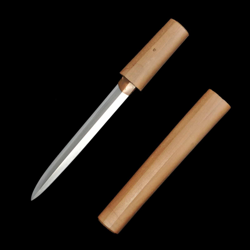 This small dagger has a very unique kogaramaru-zukuri, or kissaki-morohazukuri dagger.