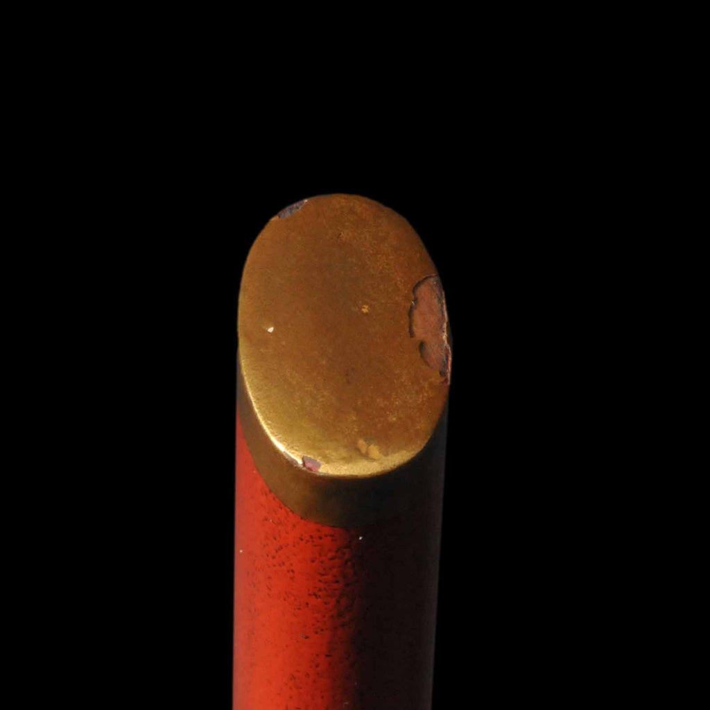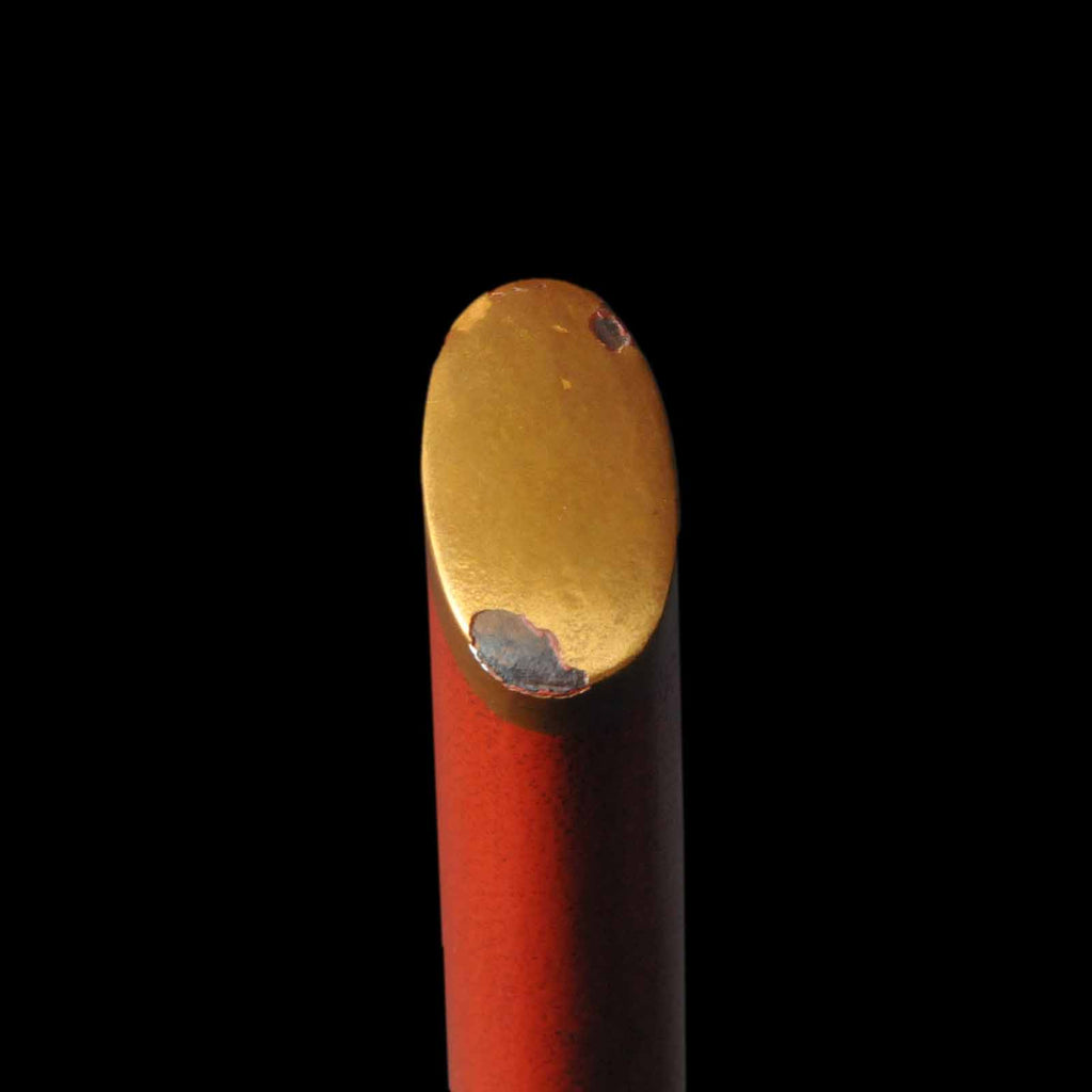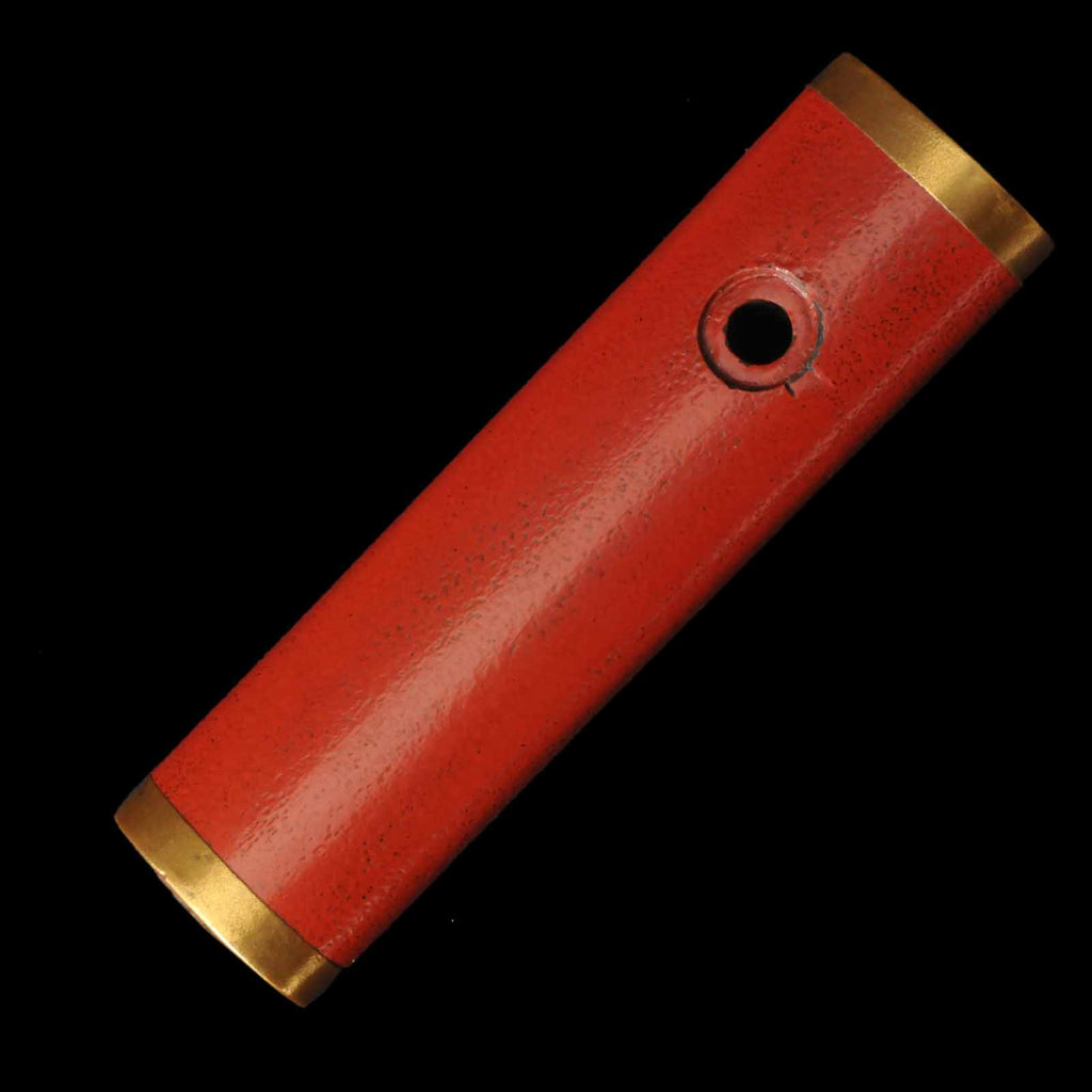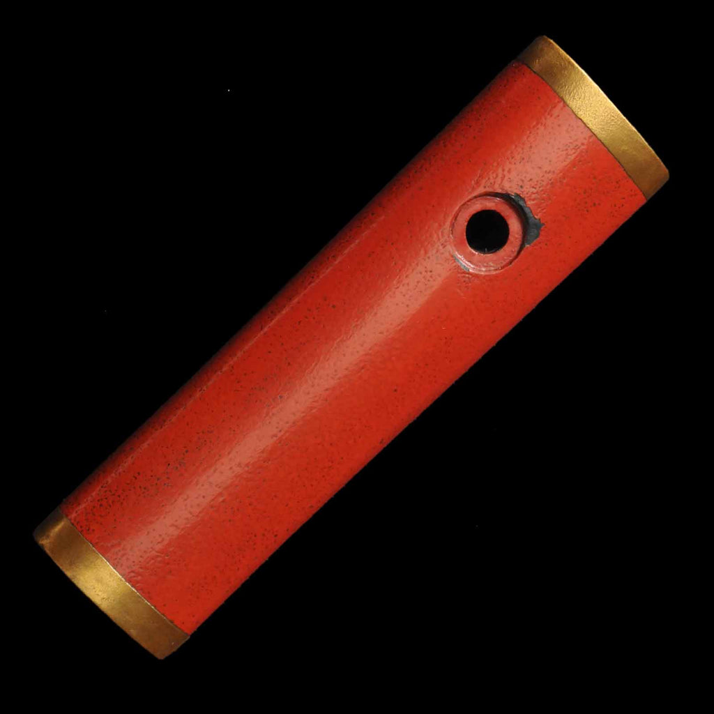 This piece is a shob zukuri pocket sword equipped with a bright vermilion lacquered aikuchi koshirae.