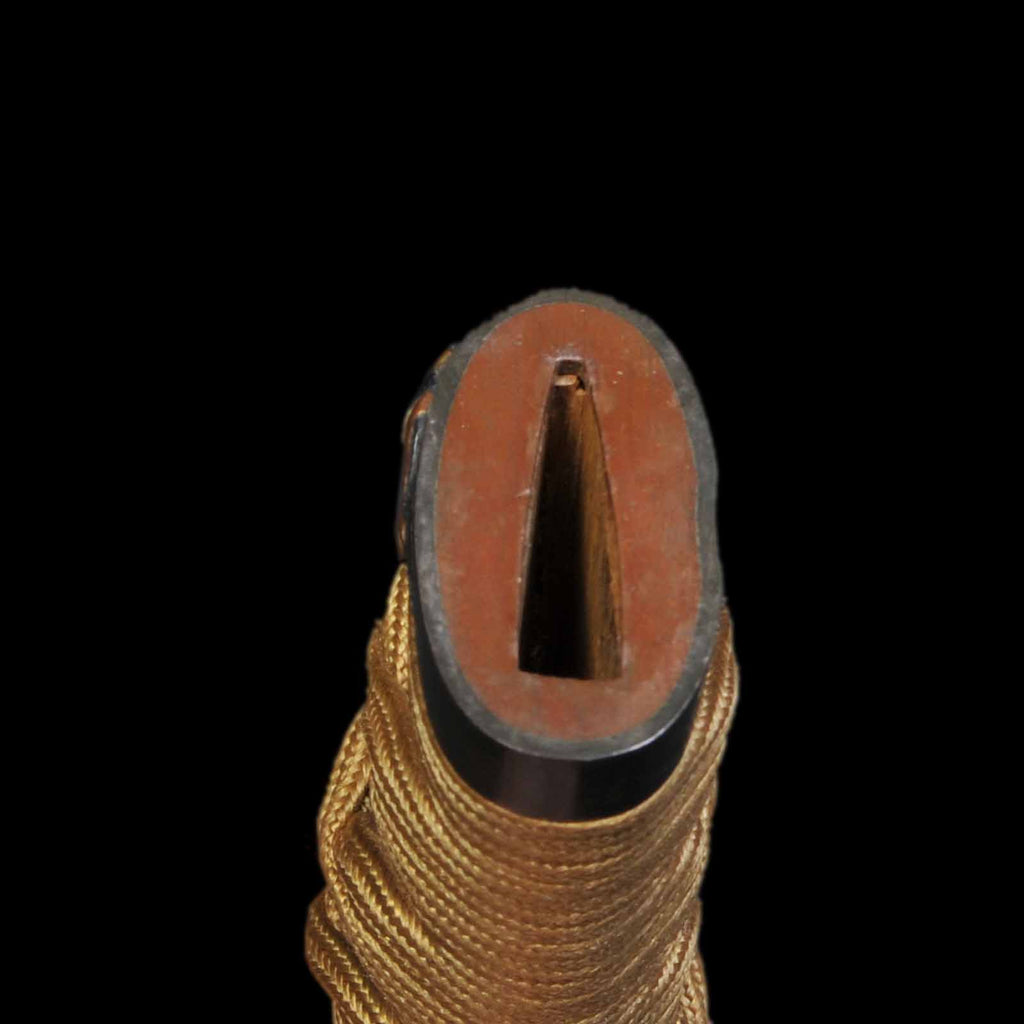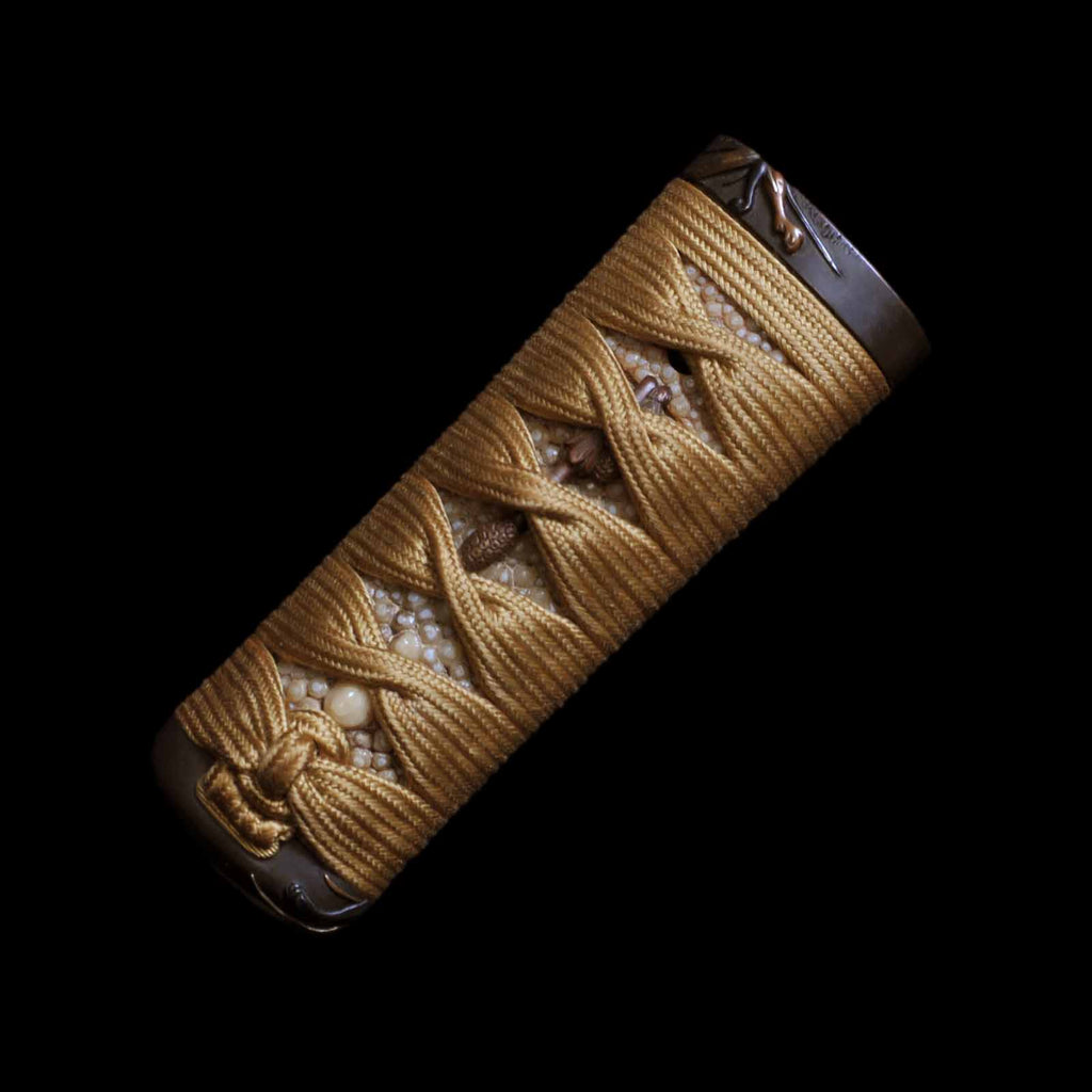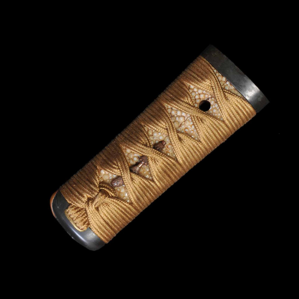 - Koshirae: Golden yellow silk Tsuka Tsumami-maki with dark brown lacquered saya/Shirasaya