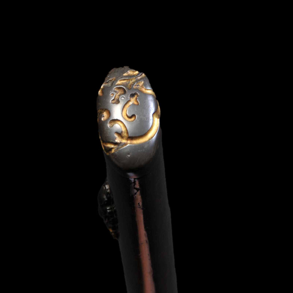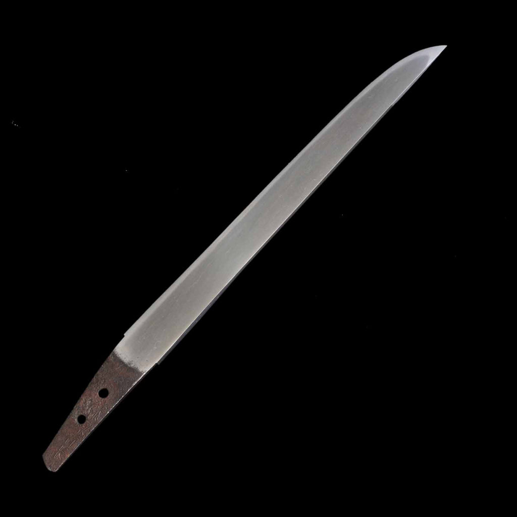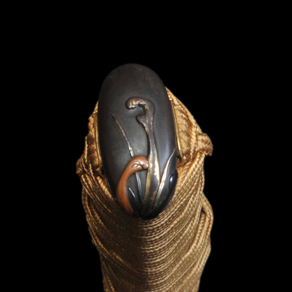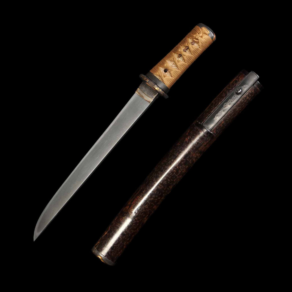 - Koshirae: Golden yellow silk Tsuka Tsumami-maki with dark brown lacquered saya/Shirasaya