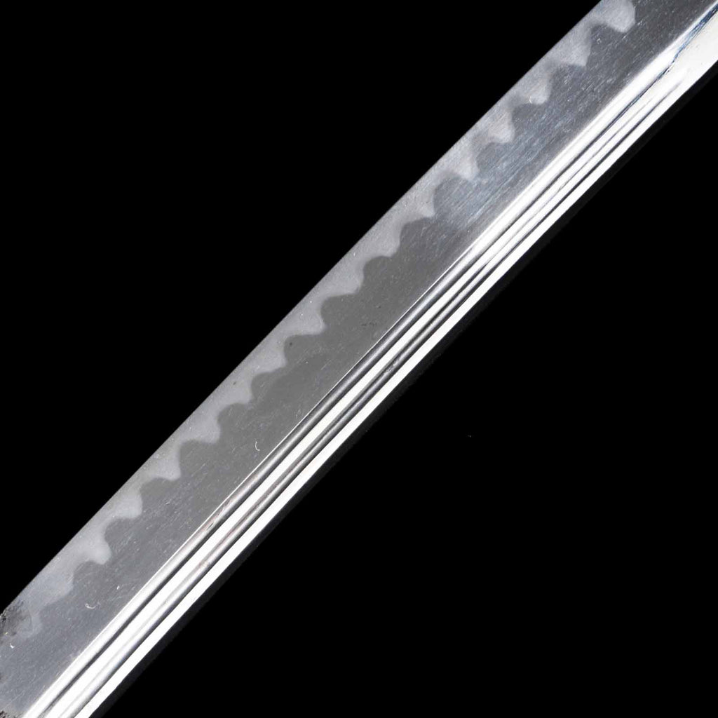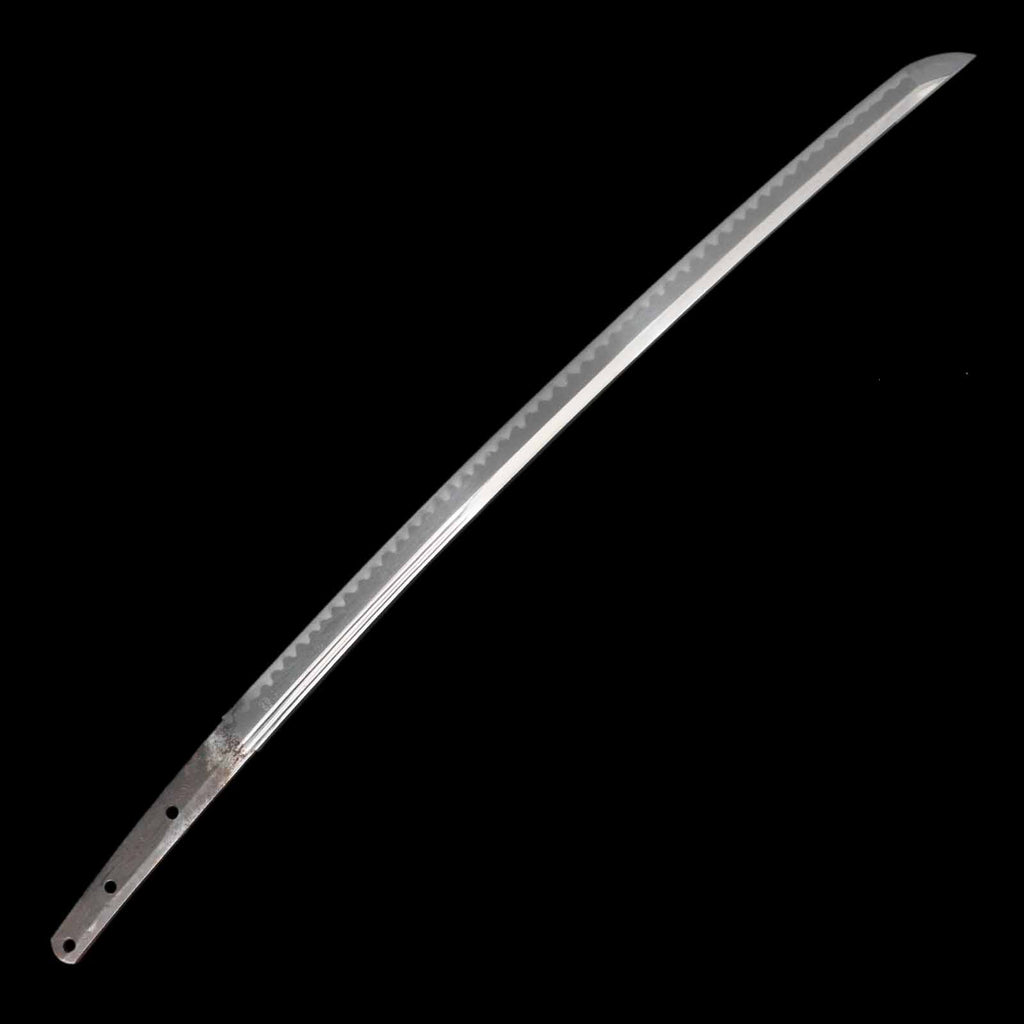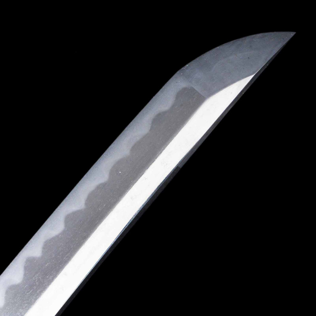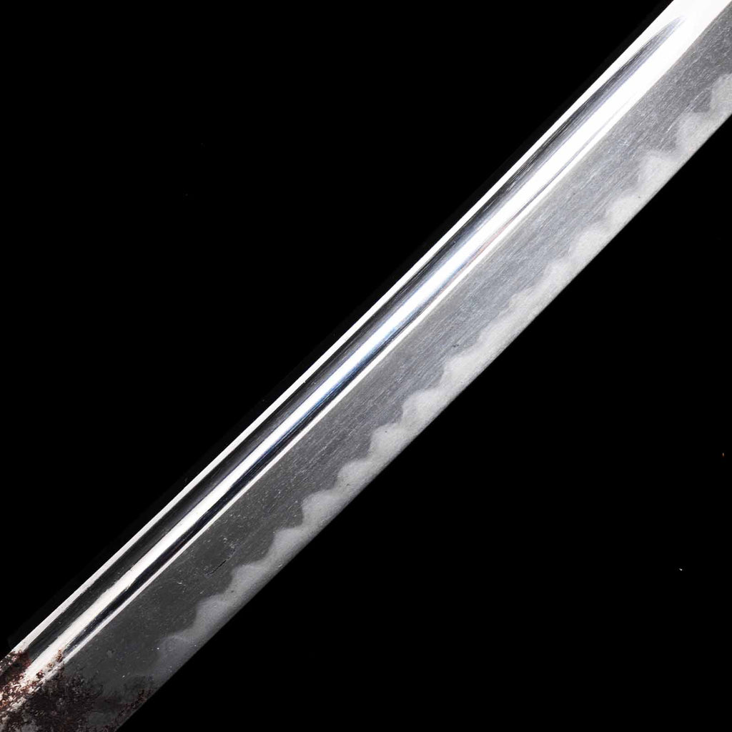 The surface of the sword is slightly cloudy due to friction from pulling the sword into and out of the scabbard, but overall the sword is well polished. There are no flaws, chips, or rust, and both sides are engraved with Hi grooves. The jigane is well packed with itame, and chikei is also visible. The hamon is a well-packed gunome with a strong nie, and has a strong presence.