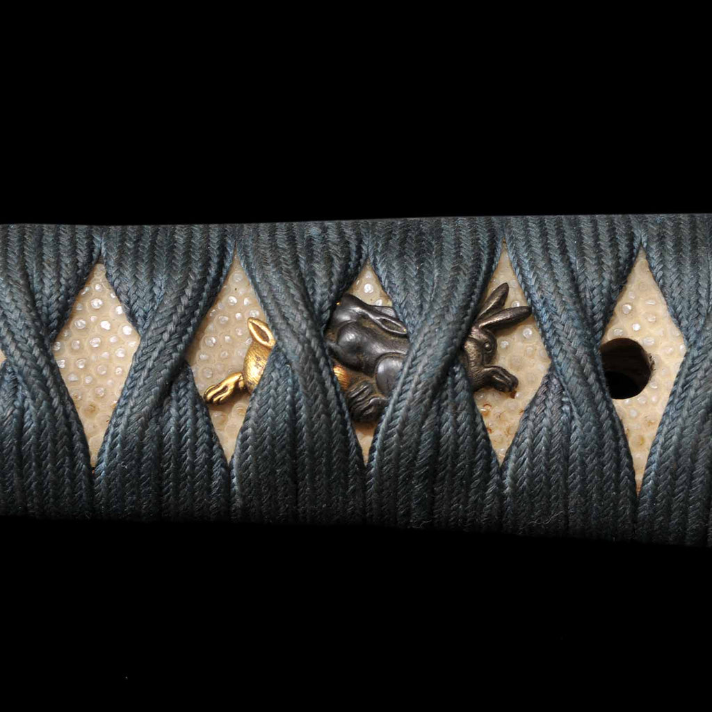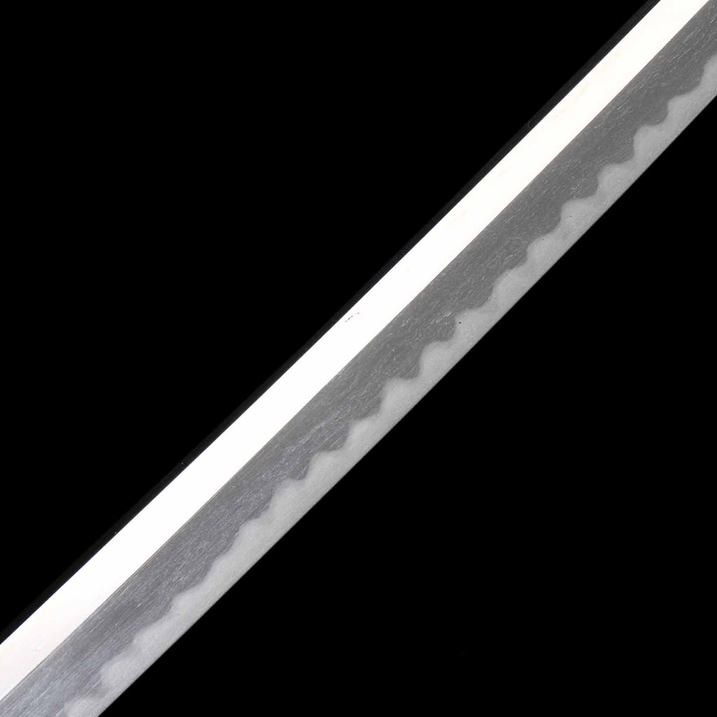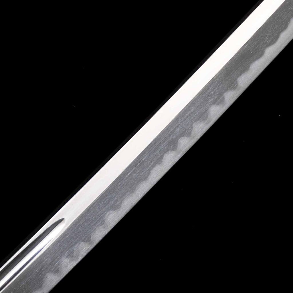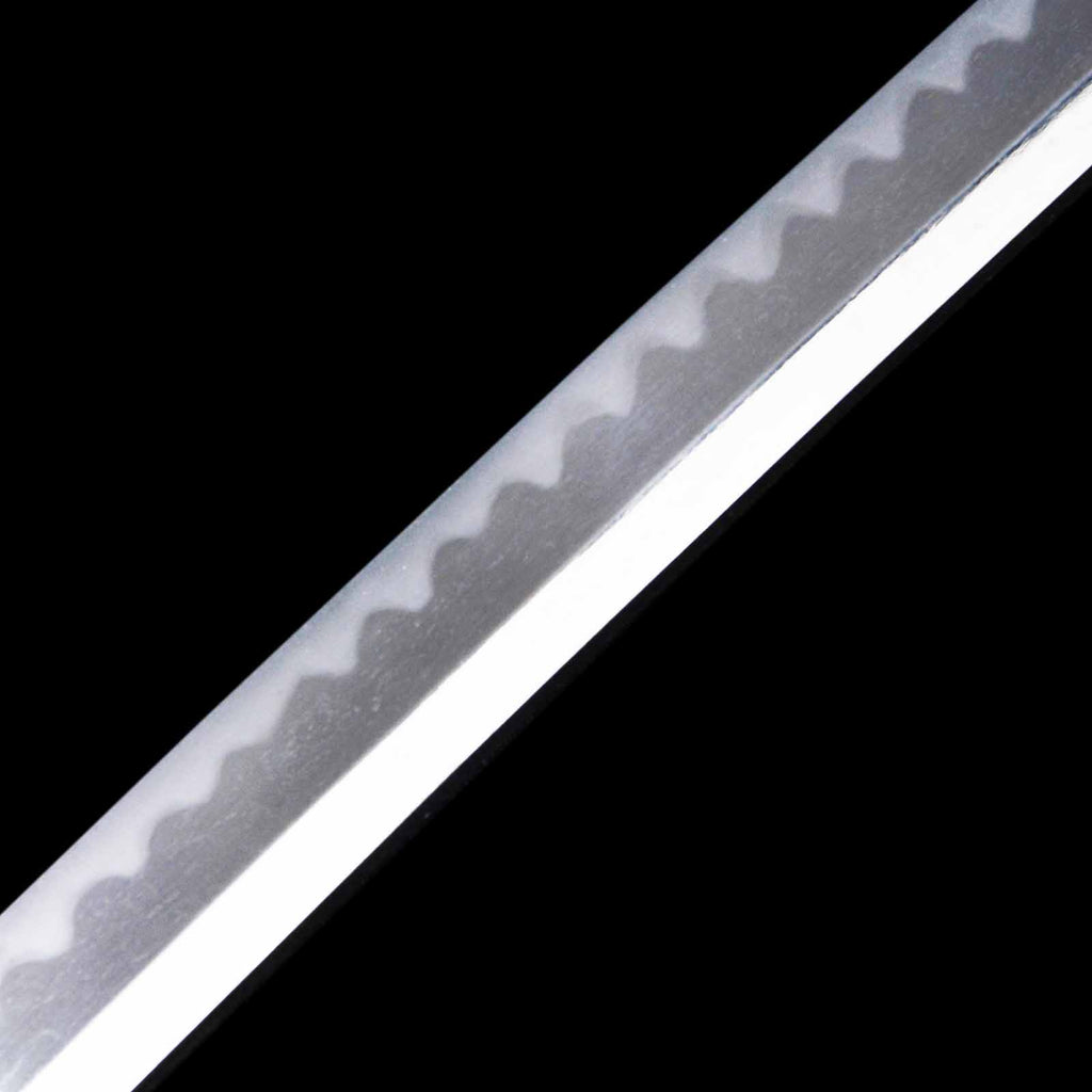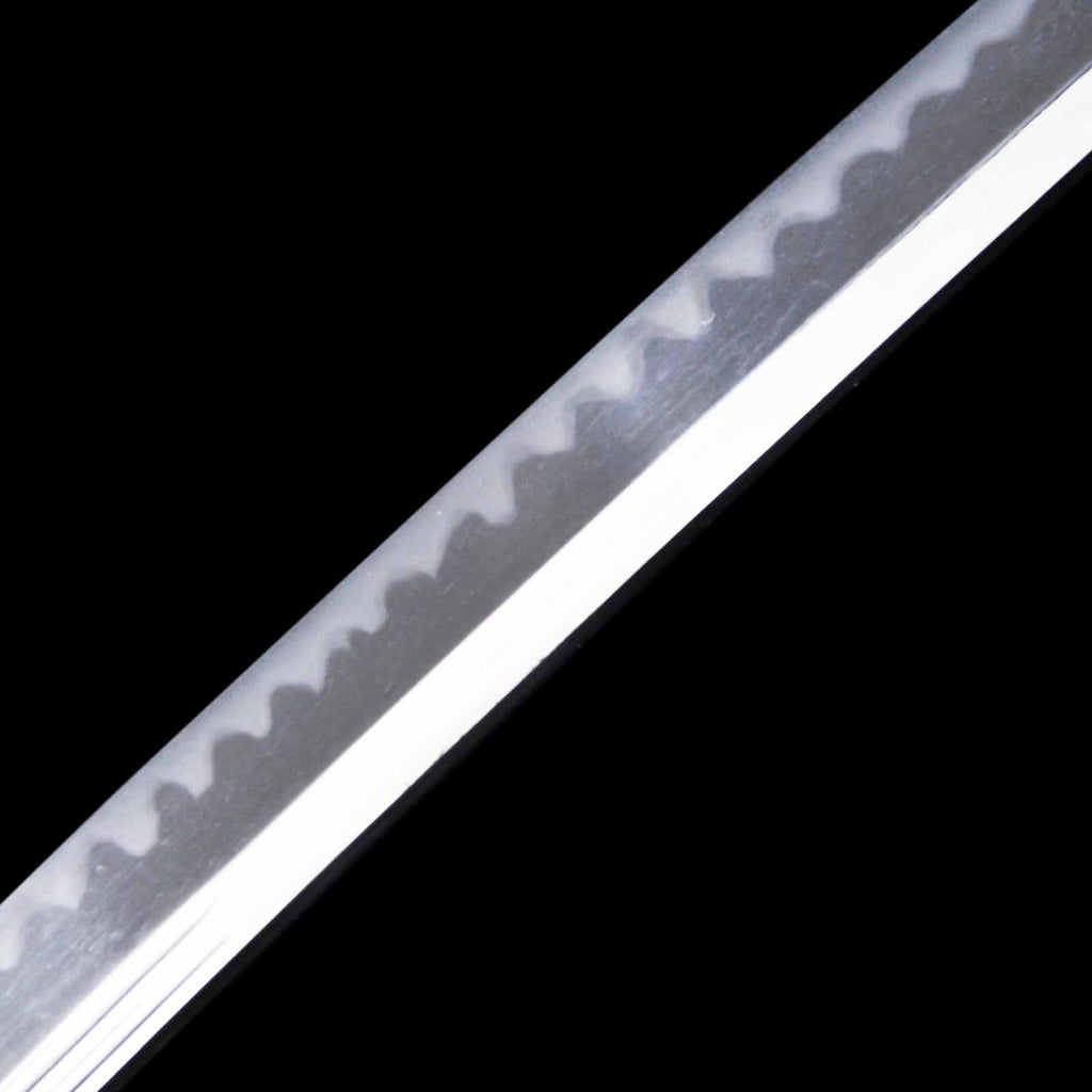 The surface of the sword is slightly cloudy due to friction from pulling the sword into and out of the scabbard, but overall the sword is well polished. There are no flaws, chips, or rust, and both sides are engraved with Hi grooves. The jigane is well packed with itame, and chikei is also visible. The hamon is a well-packed gunome with a strong nie, and has a strong presence.
