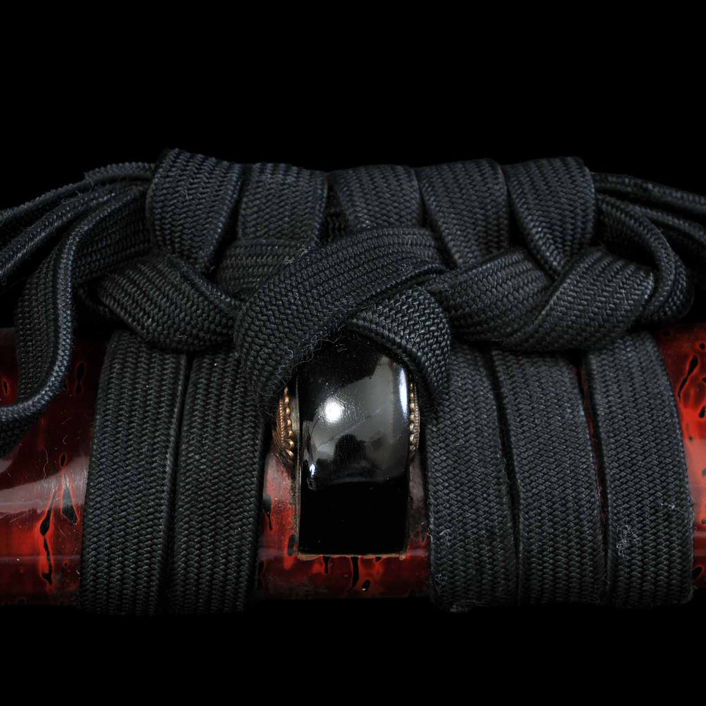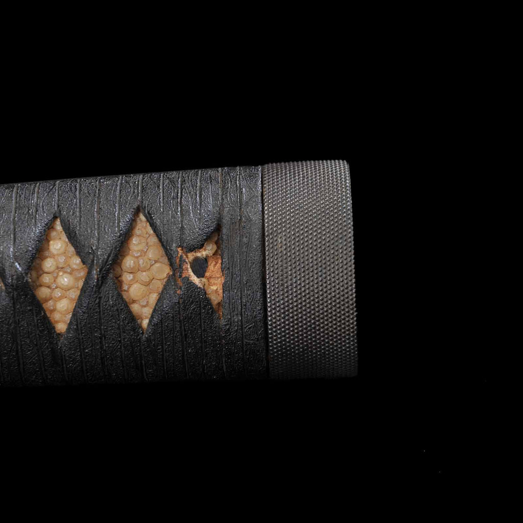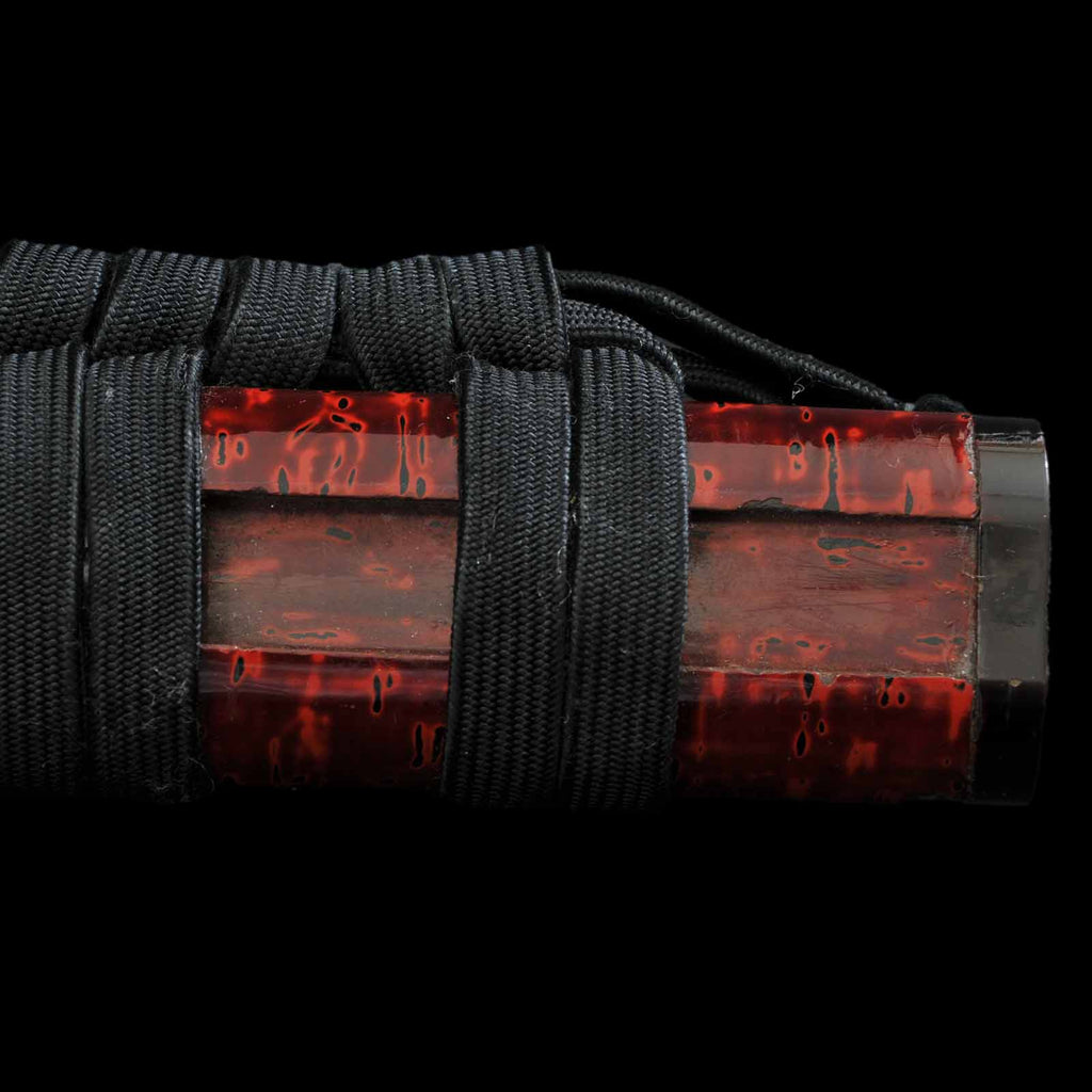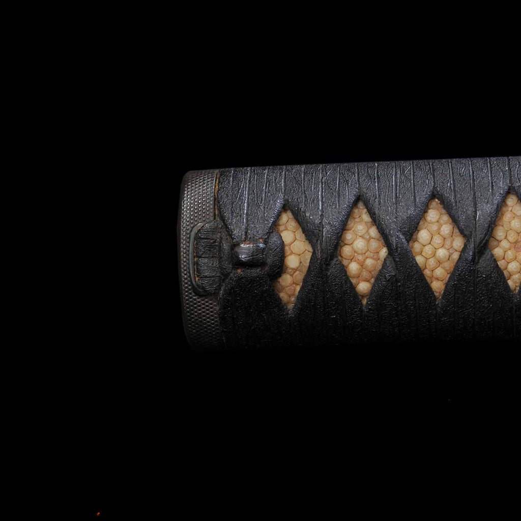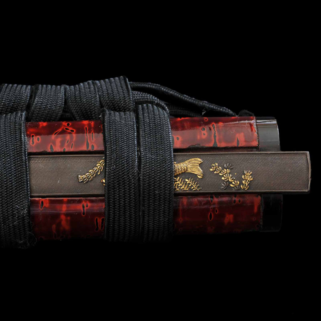 - Koshirae: Black silk Tsuka Tsumami-maki with Sakuragawa lacquered saya, Shirasaya
