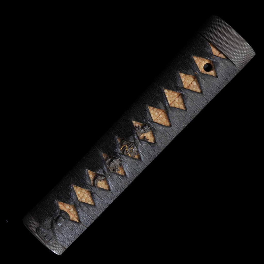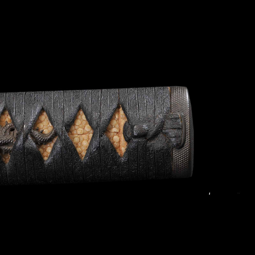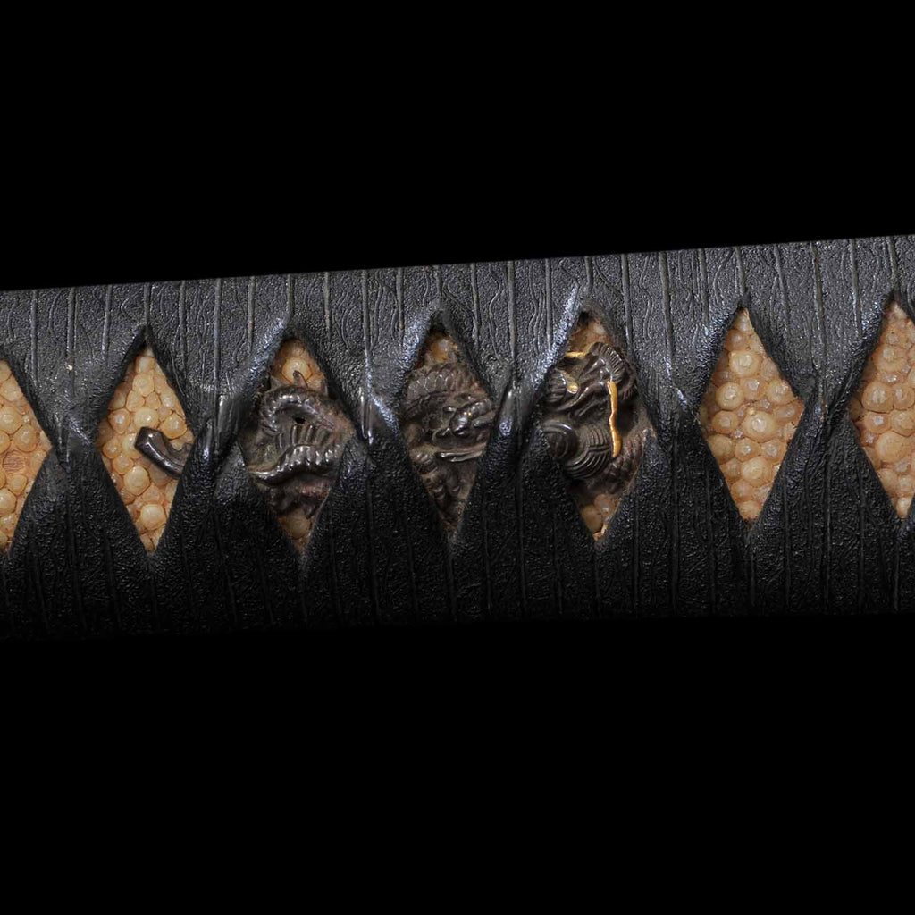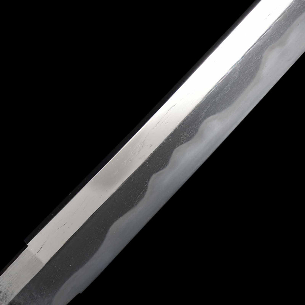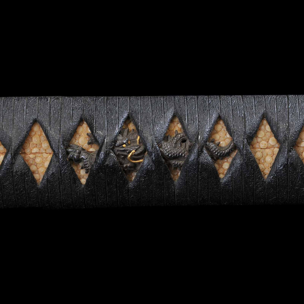 - Koshirae: Black silk Tsuka Tsumami-maki with Sakuragawa lacquered saya, Shirasaya