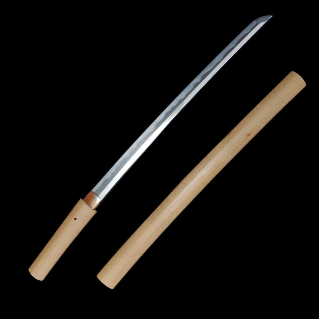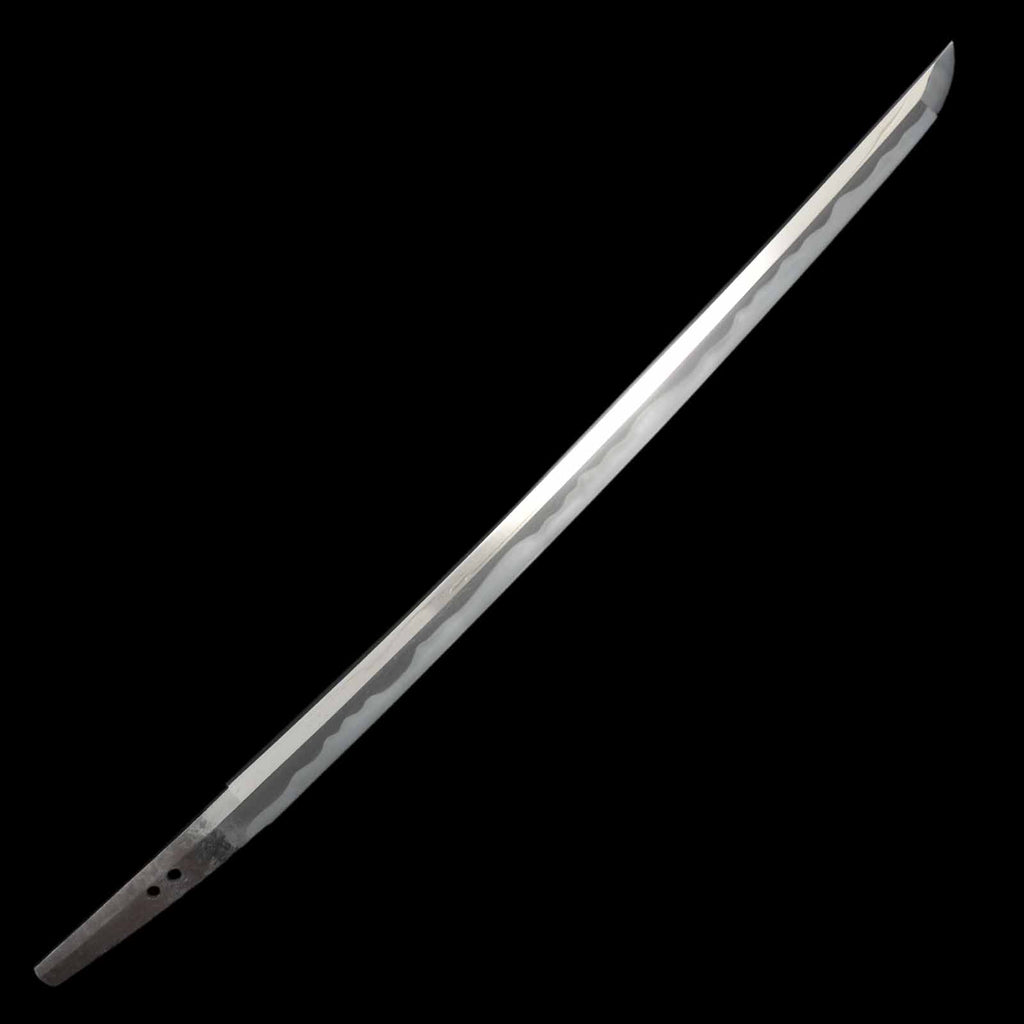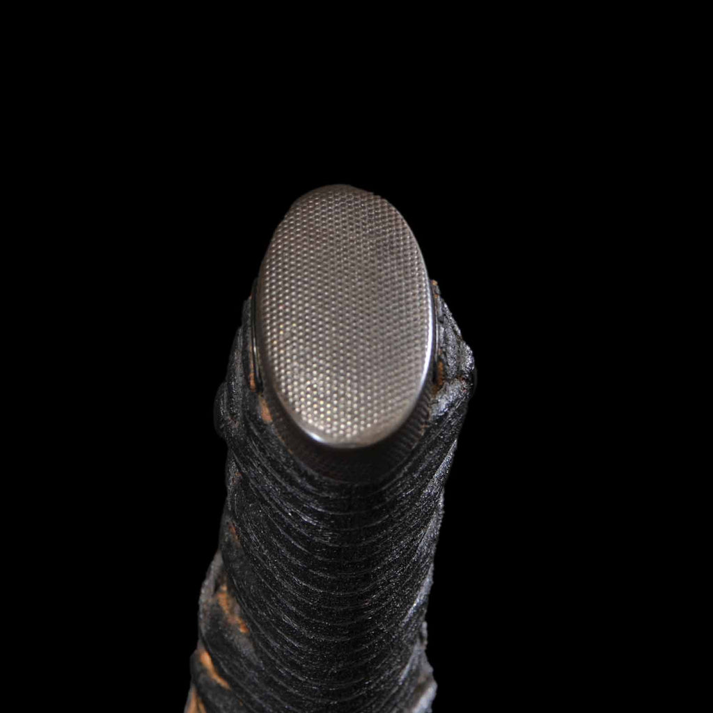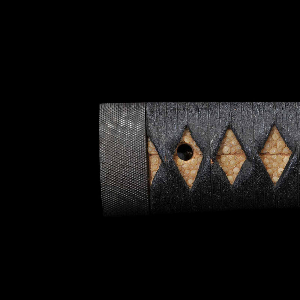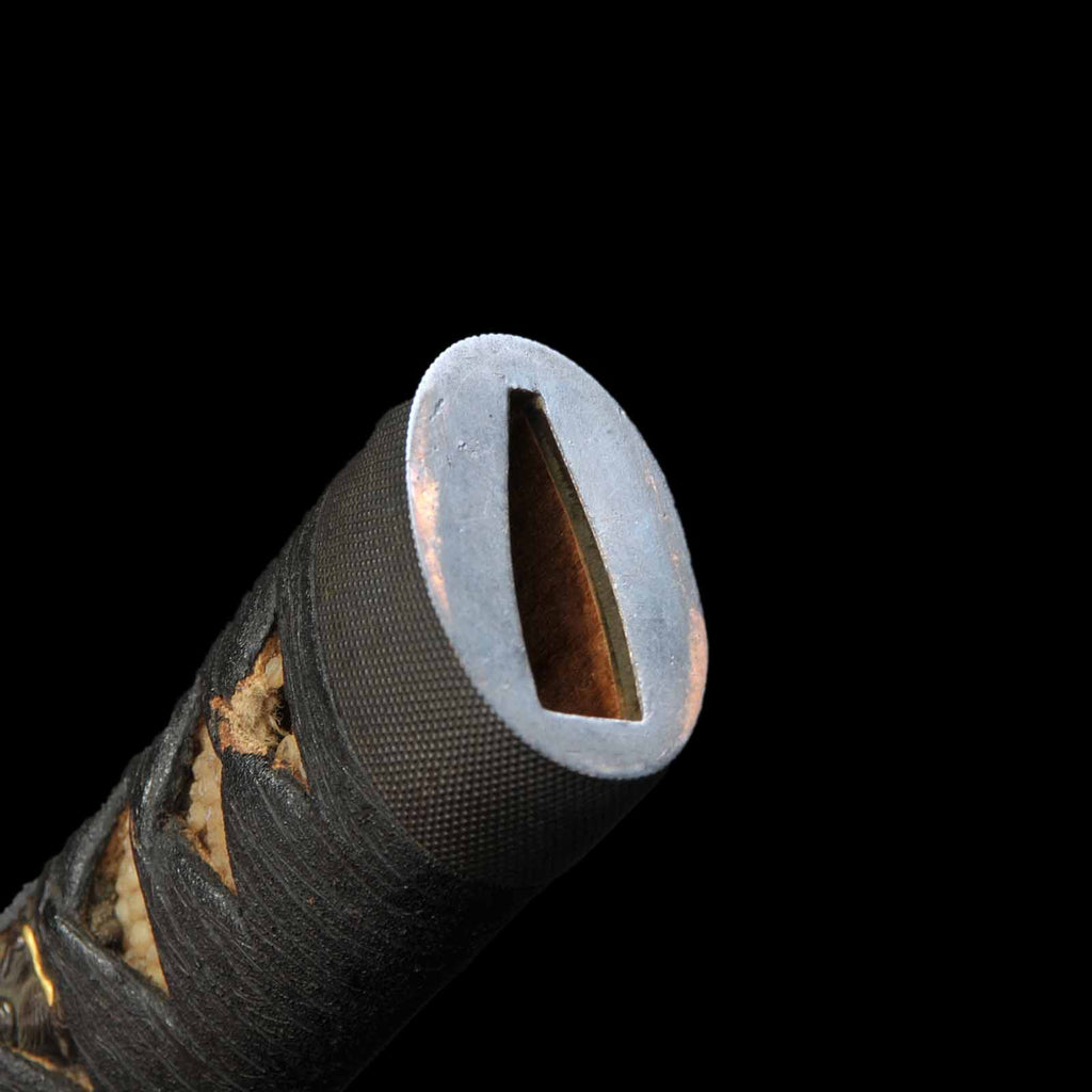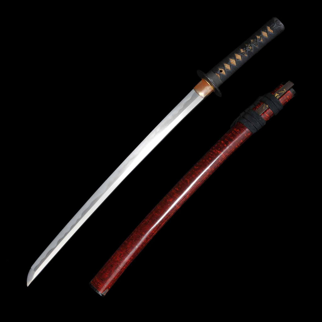 - Koshirae: Black silk Tsuka Tsumami-maki with Sakuragawa lacquered saya, Shirasaya