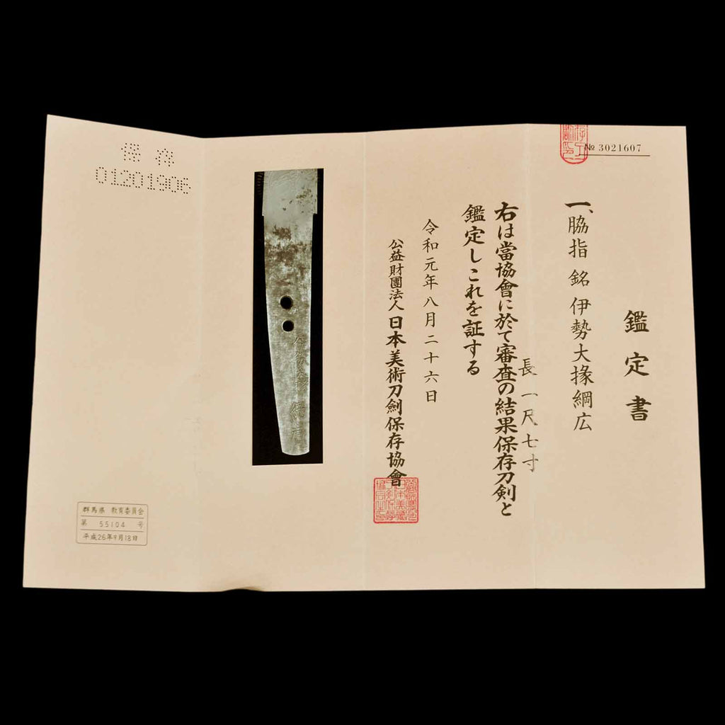The swordsmith named Tsunahiro has been in the family for generations since the Koto period, and Ise Daijo Tsunahiro is the fifth generation to inherit the name. He is known as one of the finest swordsmiths during the Shinto period in Soshu-den and the best swordsmith in the family. He then received Ise Daijo in 1660, and around 1678 Ise-no-Kami. The world-famous Kotetsu is said to have been his apprentice. The name of Tsunahiro then flourished until the fifteenth generation in the Meiji and Taisho periods.