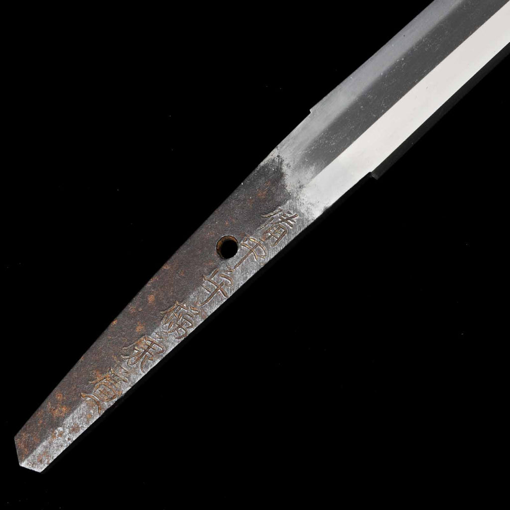 This sword is a large wakizashi made by Yasuhiro Tachibana. Originally from Kii-no-kuni (present-day Wakayama Prefecture), he was born and was the second son of Tosa Tameyasu, the founder of the Kii-ishidou school. He moved to Osaka in 1657 after receiving the bureaucratic name of Bitchunokami.