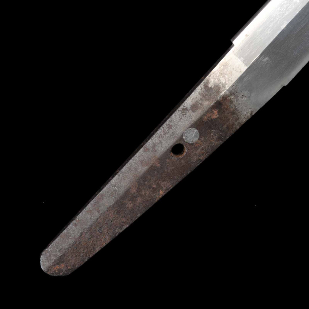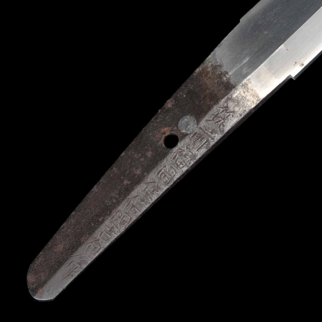 The entire sword blade is a spectacular shobu-zukuri structure that resembles the shape of an iris leaf. The nakago is engraved with an inscription meaning “the work of Nobukuni Yoshikane, a resident of the Fukuoka region in the country of Chikuzen.