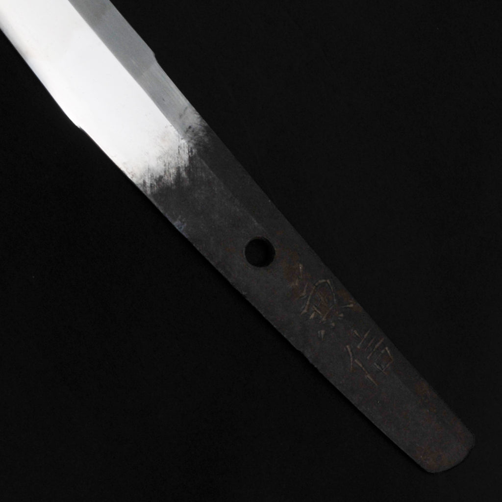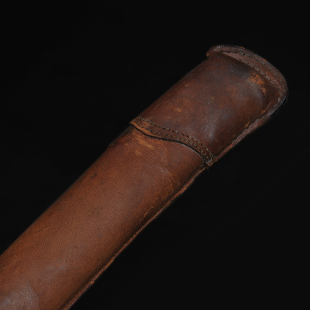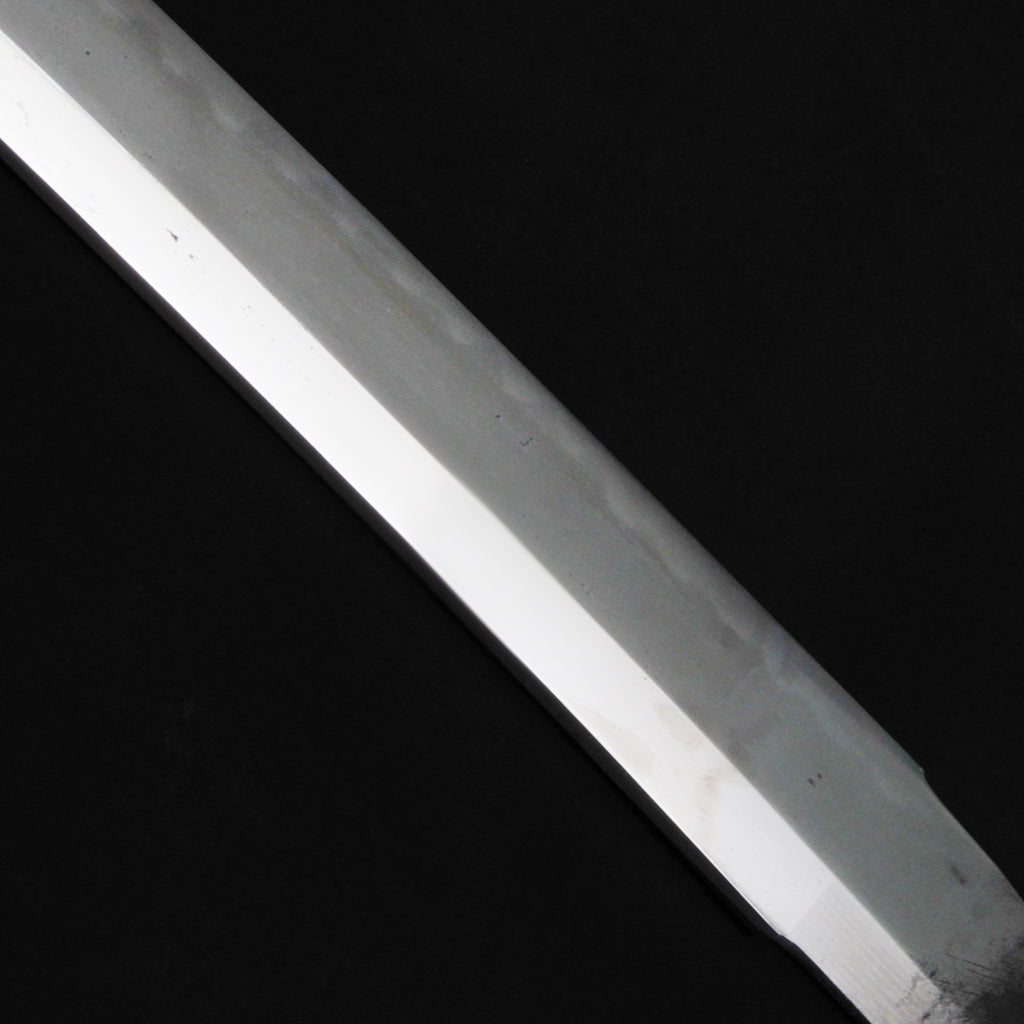 This sword was made by Kanenobu of Mino. The blade is in very sound condition but is slightly dull. There is a 6 cm forging flaw in the center of the blade. One side of the blade is slightly cloudy from the tip to about 25 cm. The hamon pattern is a typical Mino style of choji midare, and the grain is itame. The fitting is of the Uchigatana style with a military (Gunto style) scabbard. A Shirasaya is also included for storage. The tsuba, fuchi/kashira, menuki, and tsukamaki hilt are all original and in good condition. The scabbard was remade for use as a military swords during World War II.