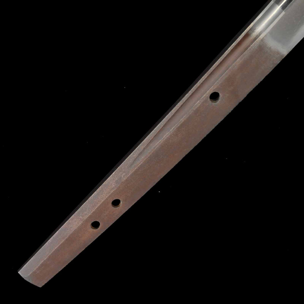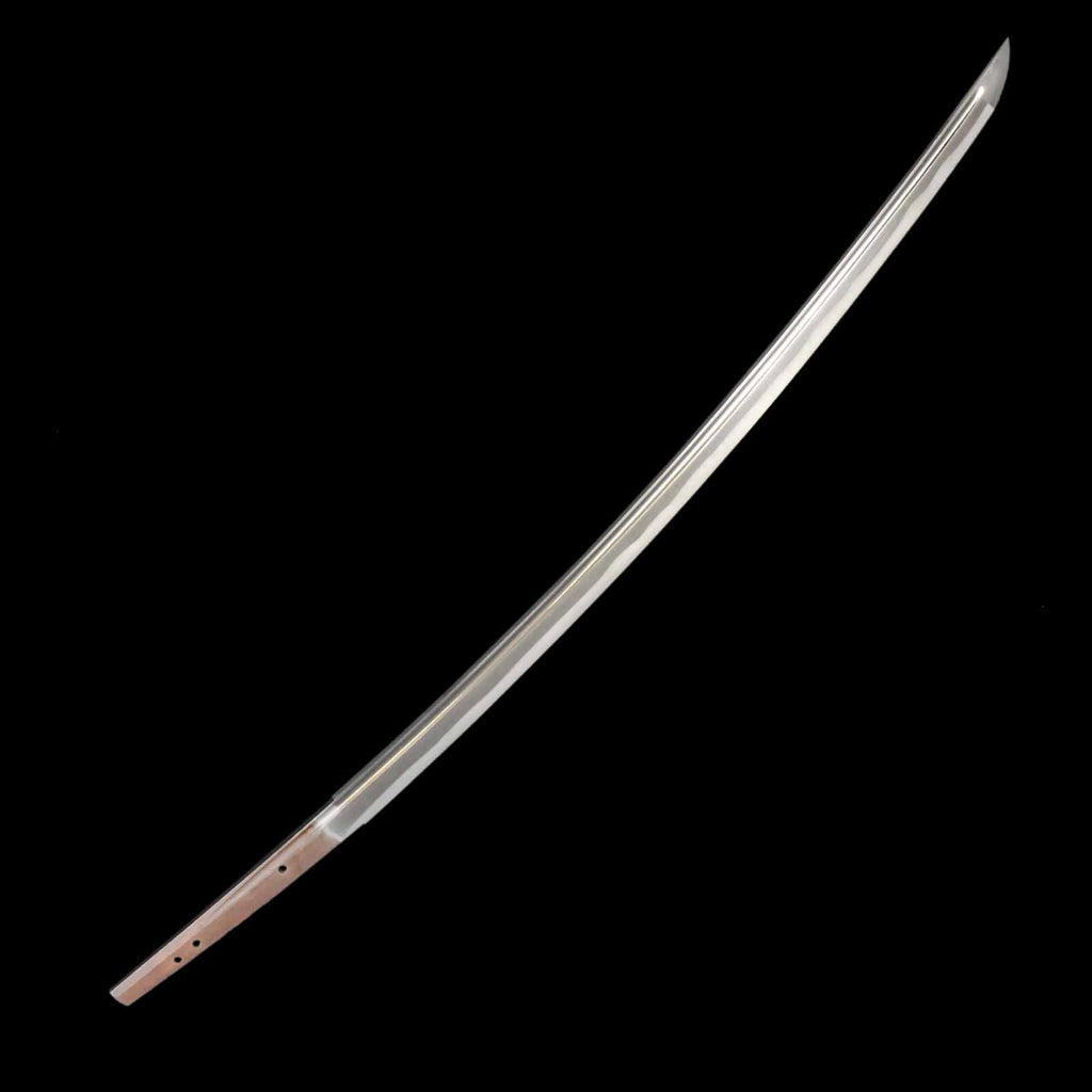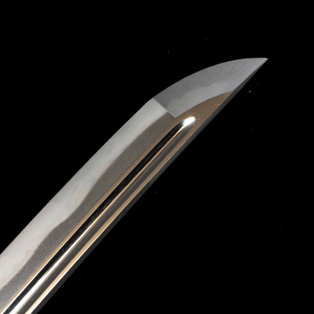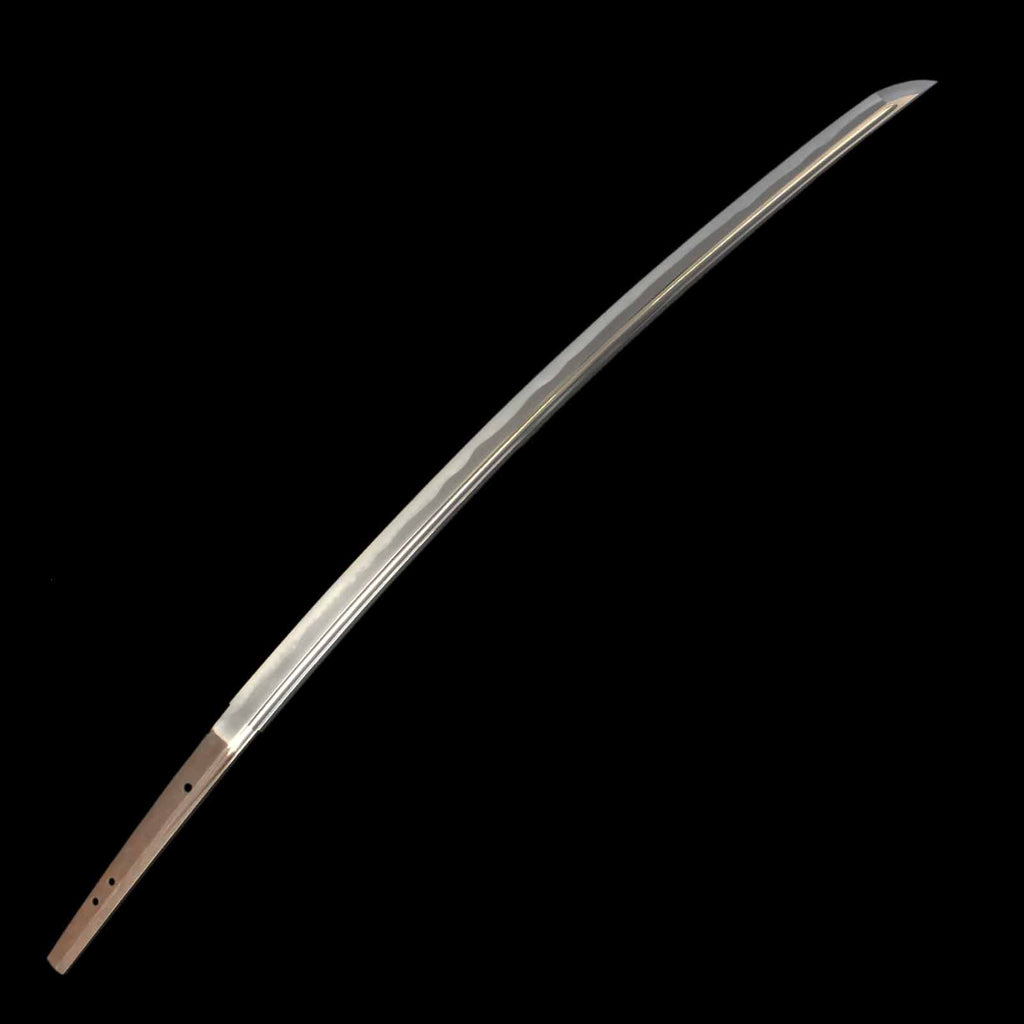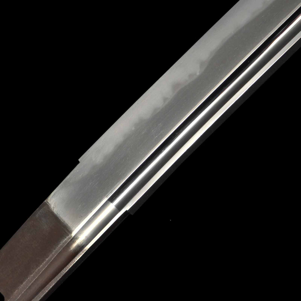 The condition of the sword is excellent considering its age. It is estimated that this sword blade was originally longer as a tachi but has been suriage several times to reach its current length. Hada is itame mixed with mokume and has very active hataraki such as chikei and yubashiri. Hamon is niedeki notare mixed with choji, and yos and kinsen can be seen. The katana is engraved with grooves on both sides of the blade.