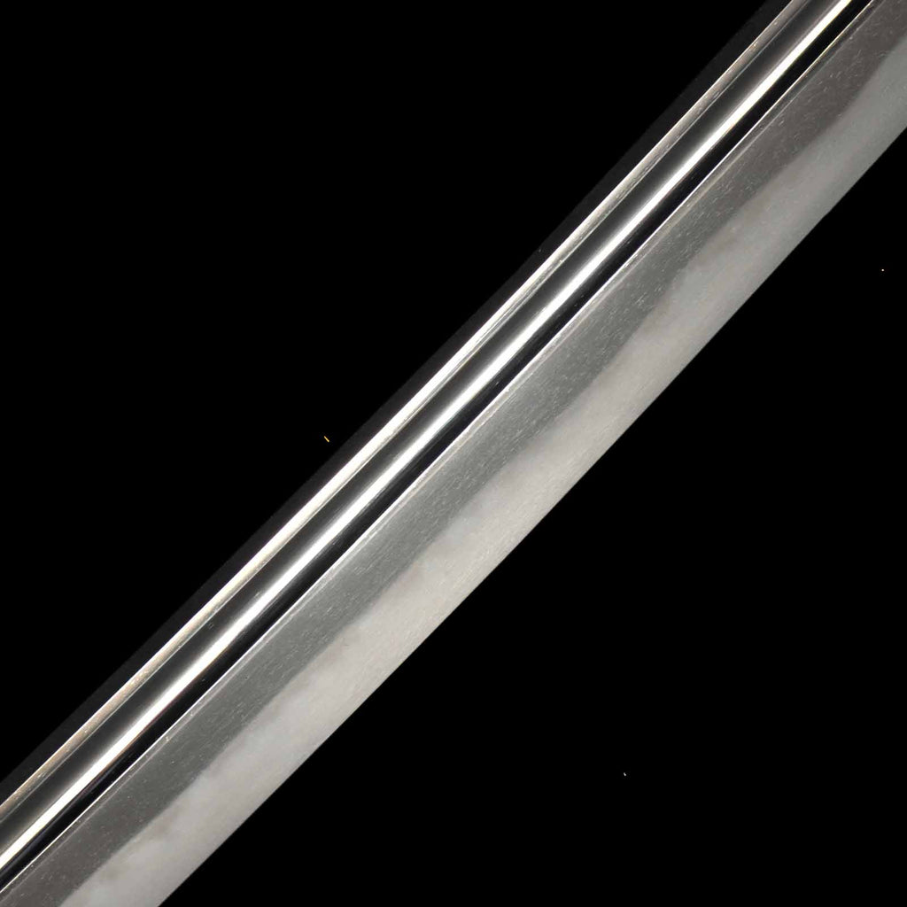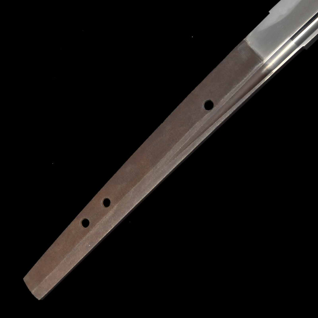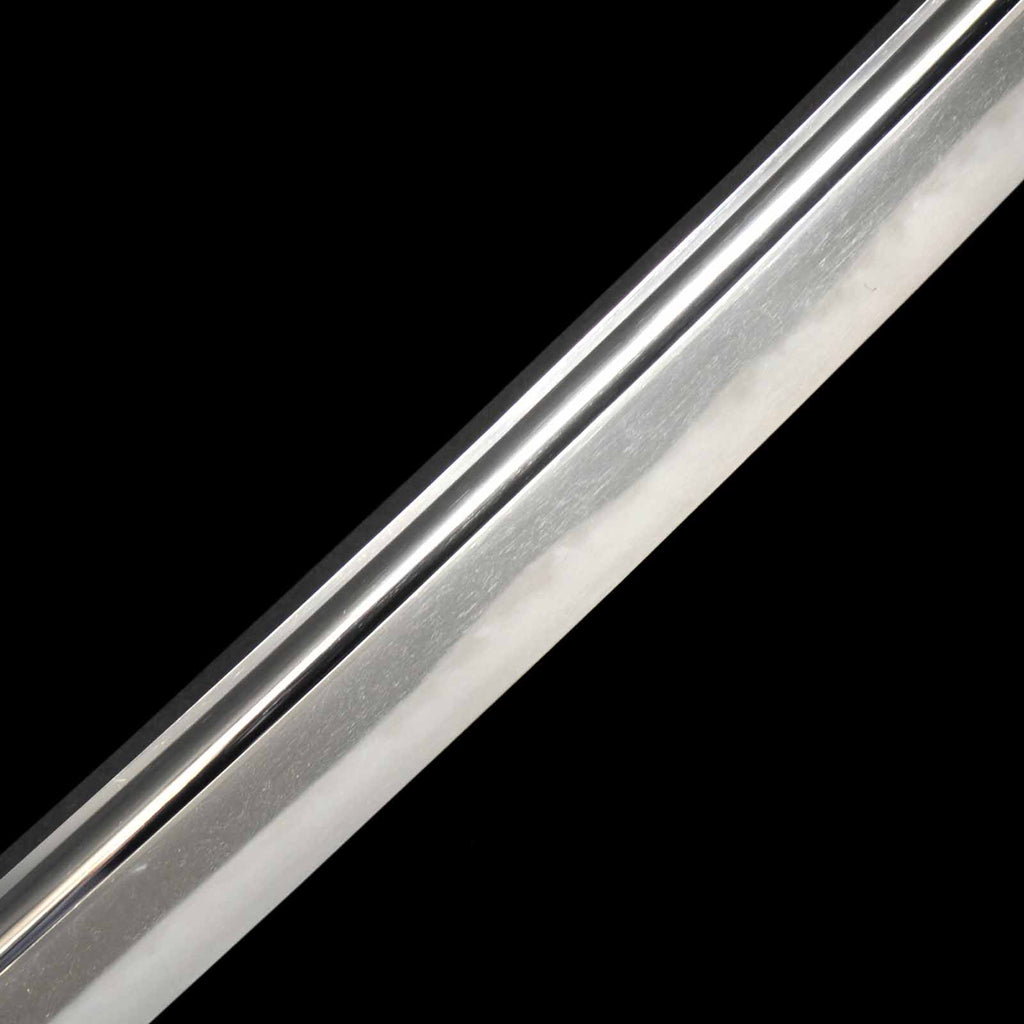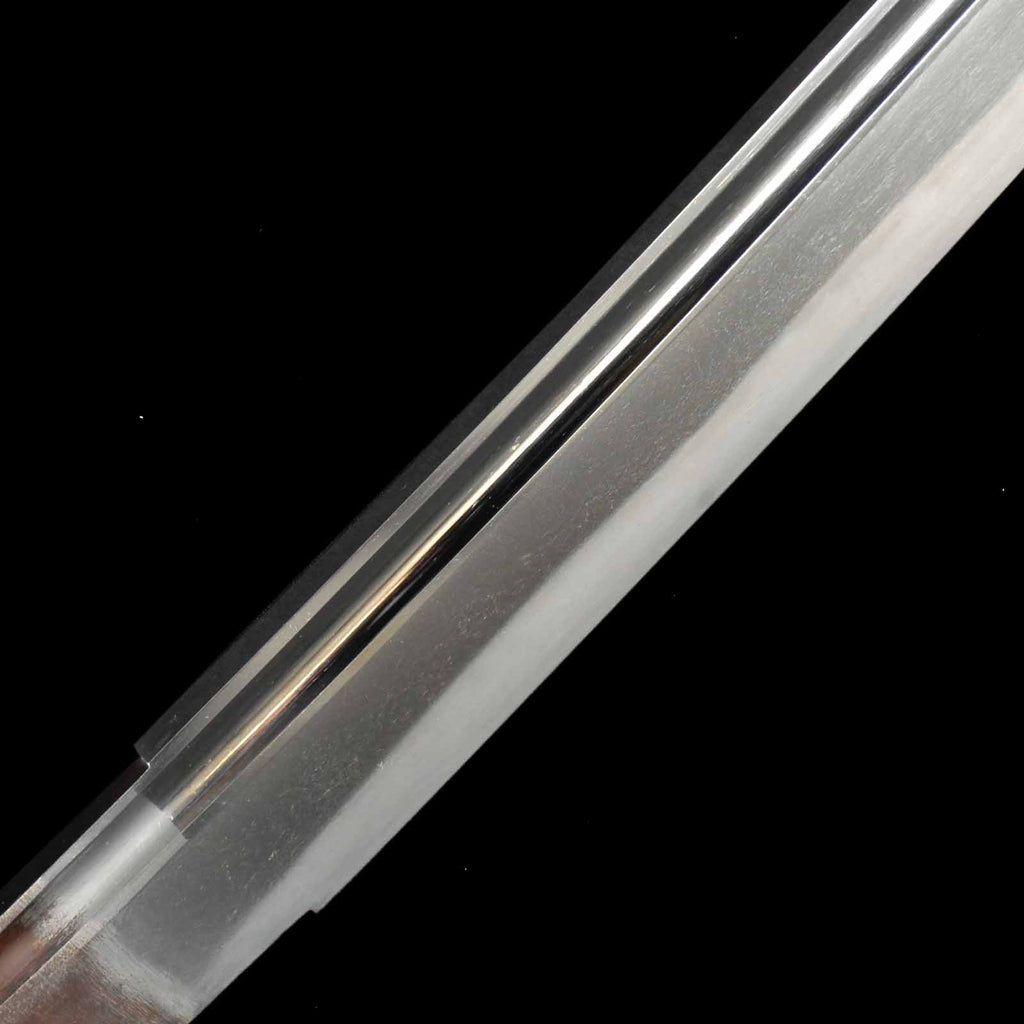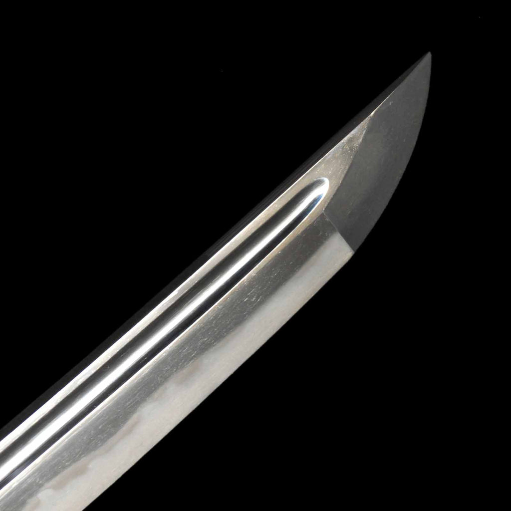 The condition of the sword is excellent considering its age. It is estimated that this sword blade was originally longer as a tachi but has been suriage several times to reach its current length. Hada is itame mixed with mokume and has very active hataraki such as chikei and yubashiri. Hamon is niedeki notare mixed with choji, and yos and kinsen can be seen. The katana is engraved with grooves on both sides of the blade.