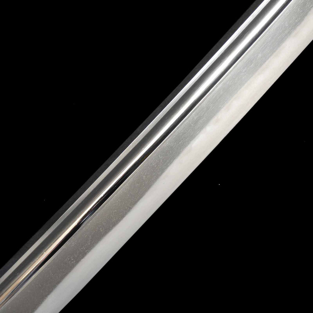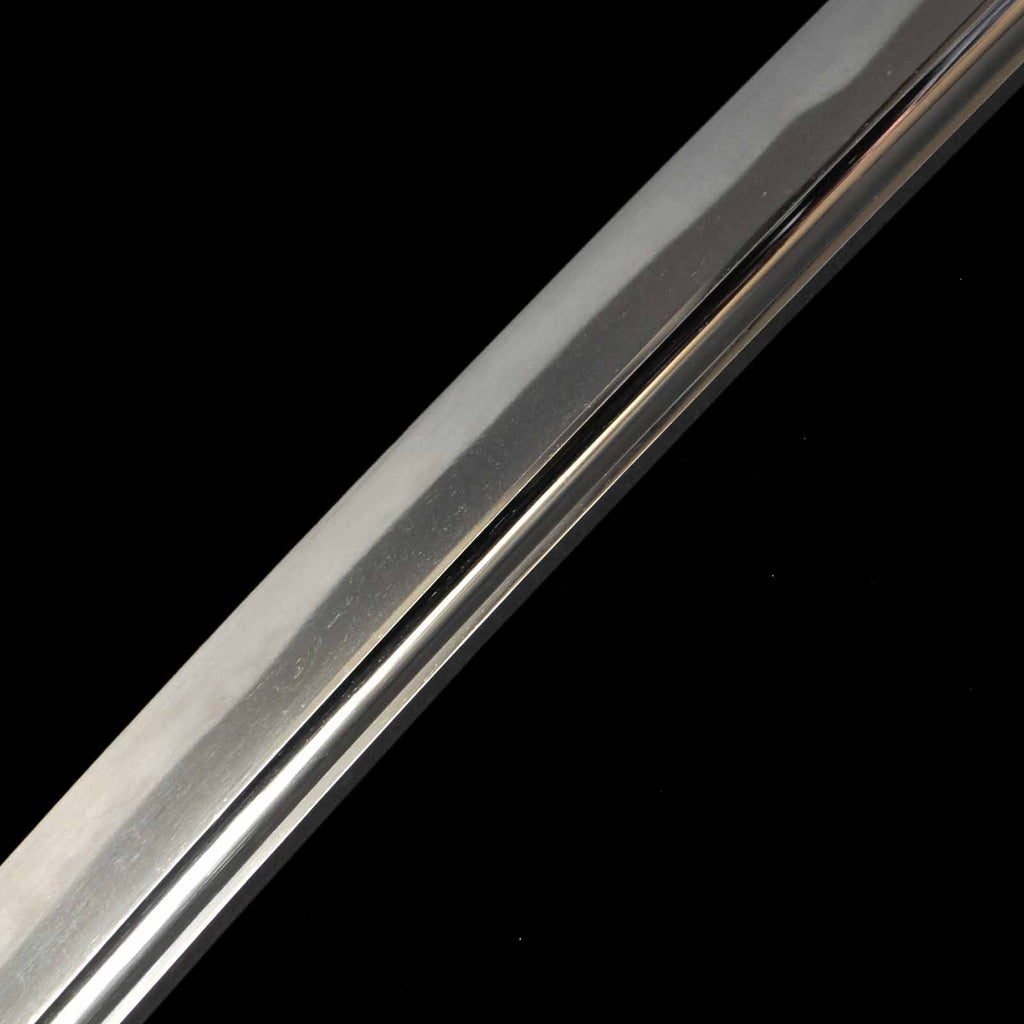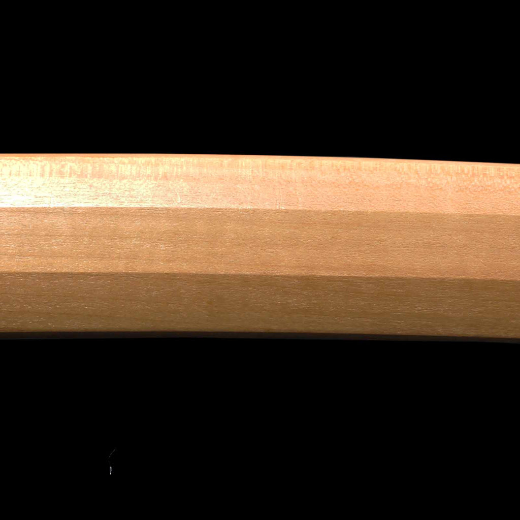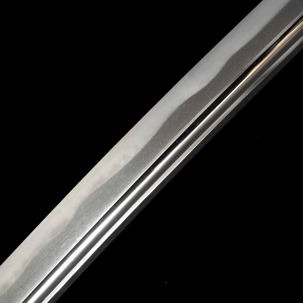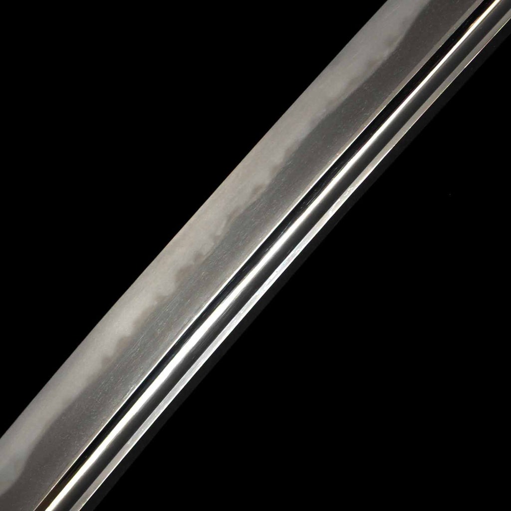 The condition of the sword is excellent considering its age. It is estimated that this sword blade was originally longer as a tachi but has been suriage several times to reach its current length. Hada is itame mixed with mokume and has very active hataraki such as chikei and yubashiri. Hamon is niedeki notare mixed with choji, and yos and kinsen can be seen. The katana is engraved with grooves on both sides of the blade.