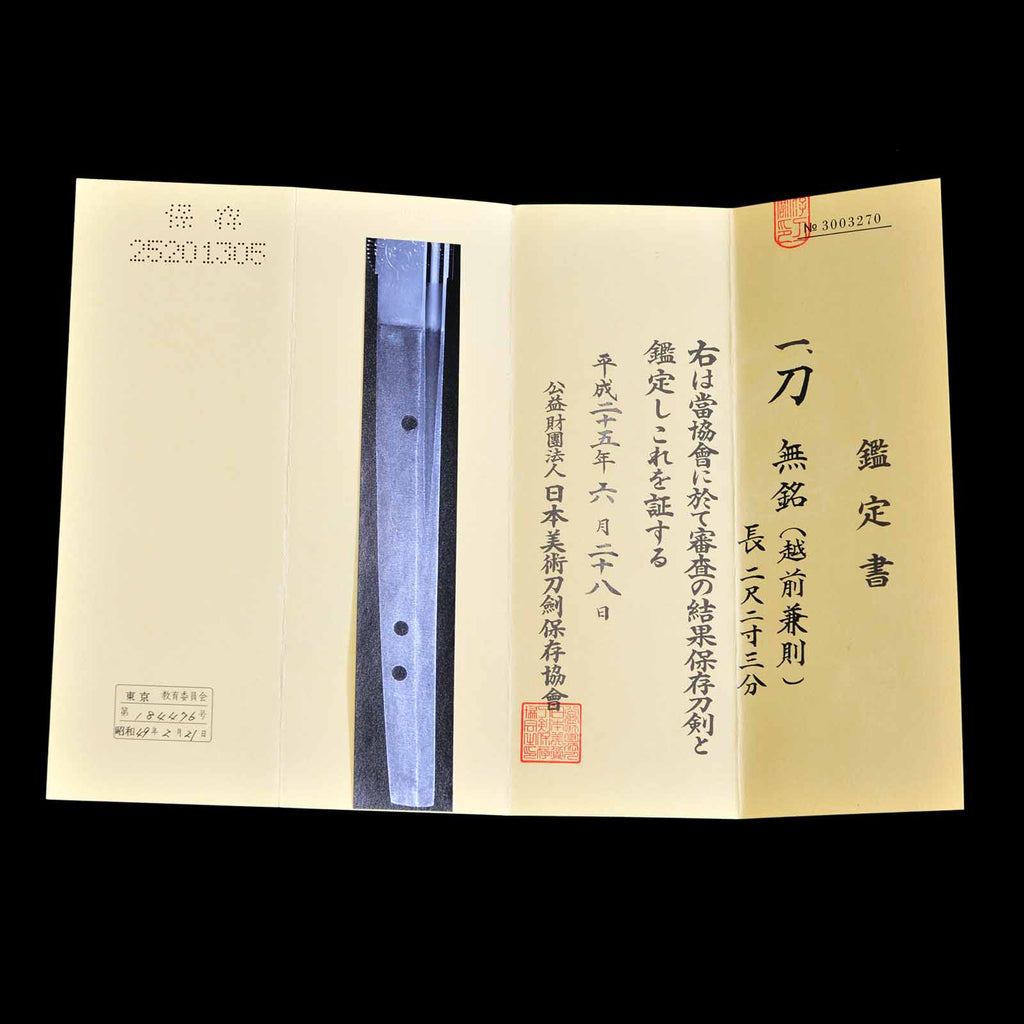 Judging from the state of preservation and value of this katana, the Society for Preservation of Japanese Art Swords has issued a certificate of hozon. If you would like to equip this katana with uchigatana koshirae, we gladly do so for an additional fee (from 200,000 JPY).