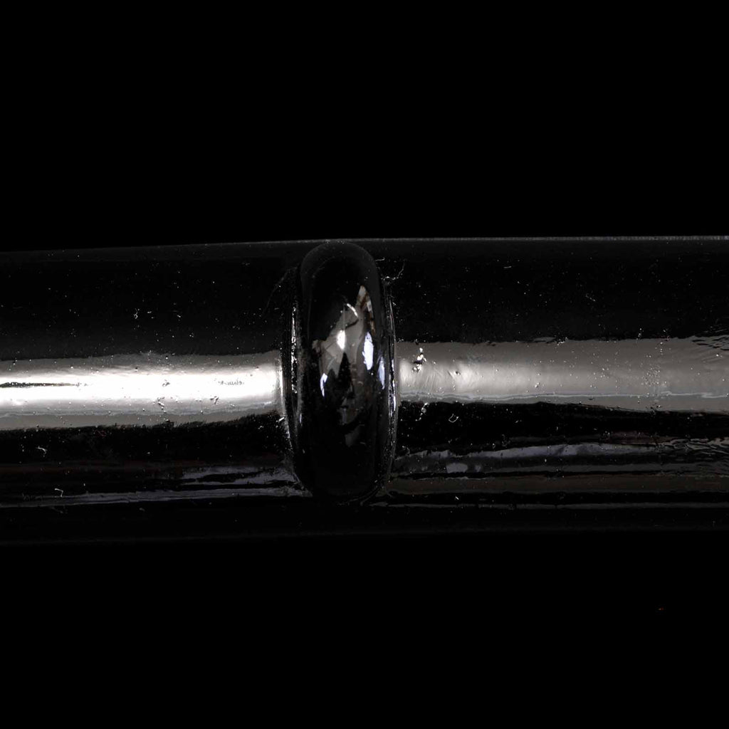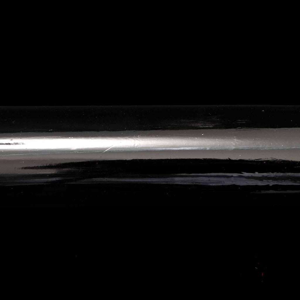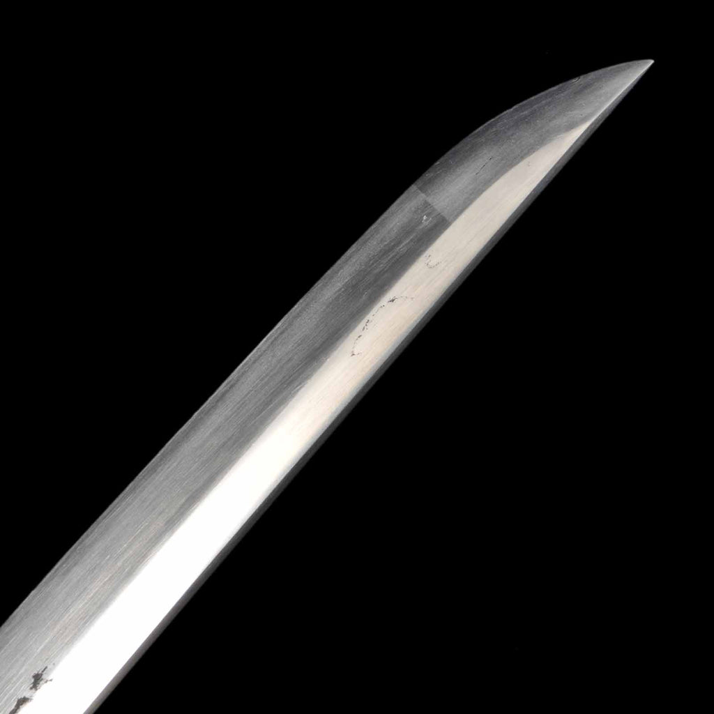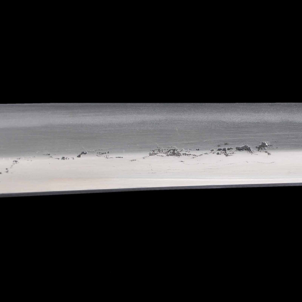 The surface of the sword is a little cloudy with some sliding, but the hada and hamon can still be appreciated. The preservation condition is not bad, but there is a 7 cm long forging flaw at the shinogi point about 12 cm from the kissaki on the sashiomote side, which is a little detrimental to the appearance of the sword. In addition, there are some other forging flaws and dots of rust in some places. The hada has itame mixed with mokume and chikei, but cannot be seen clearly because there are marks as if the entire surface has been rubbed. Hamon shows kognome in the well-tightened notare-like suguha. It is slender overall, but especially near the kissaki. It is built more like a large wakizashi than a katana.