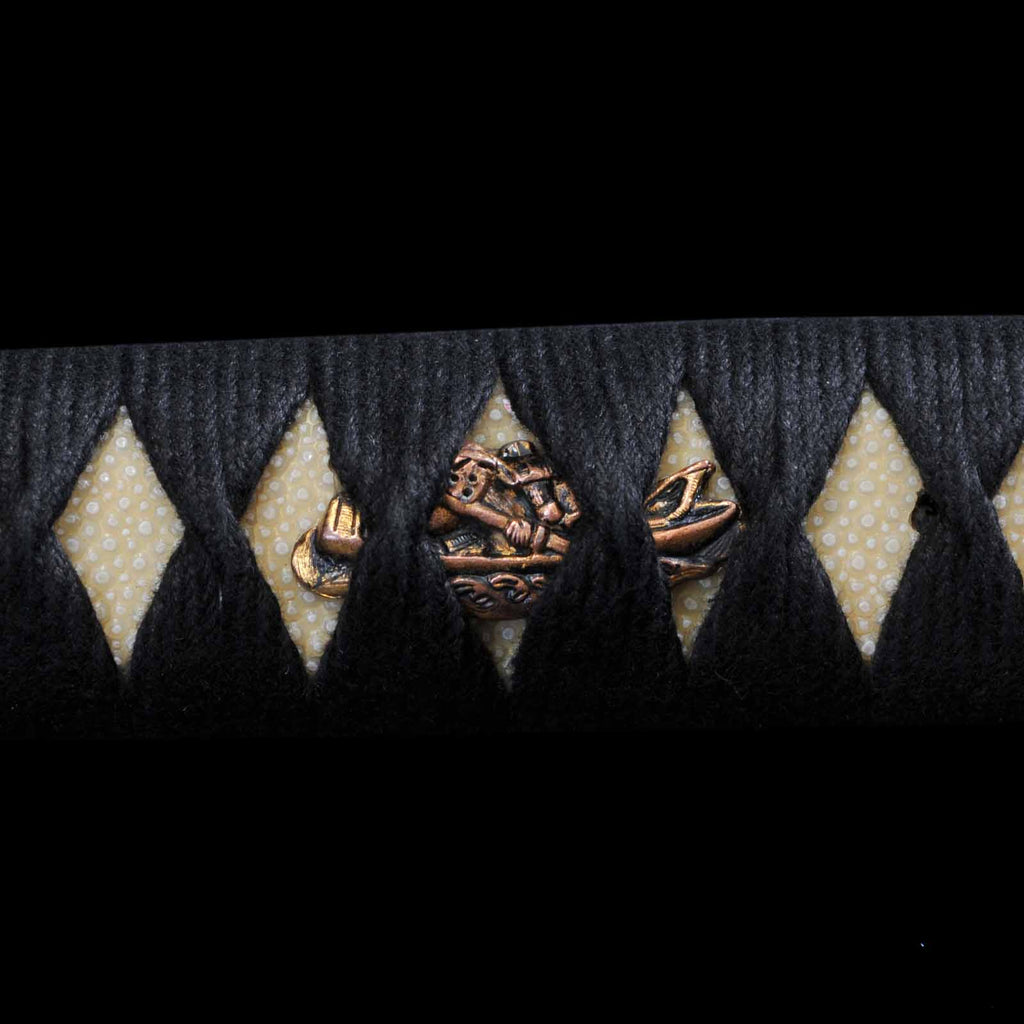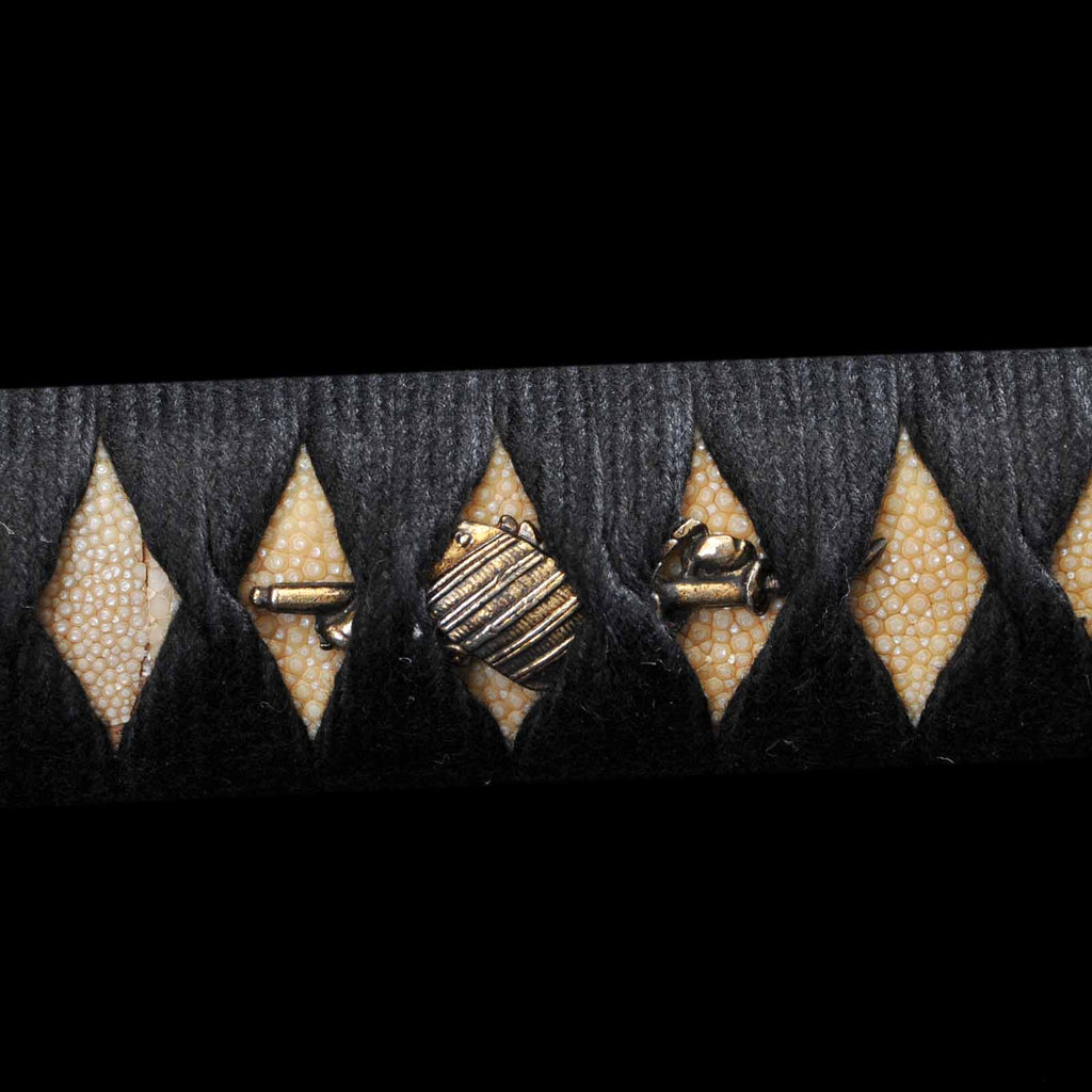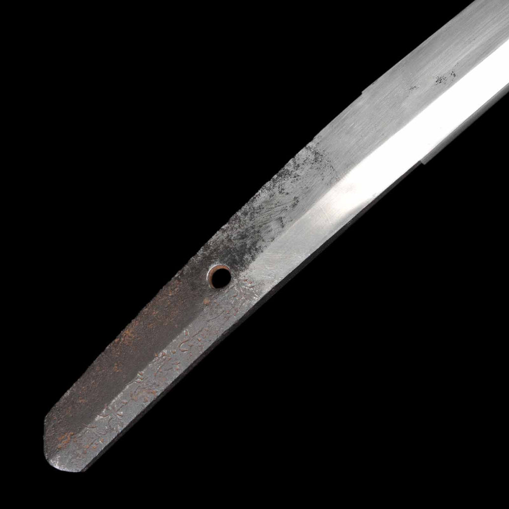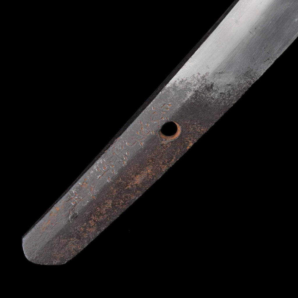 The koshirae fittings are all of the period, and are of the Tensho style. The tsukamaki cord was broken, so it has been newly replaced and is tightly wrapped. The nakago is engraved on the back as the work of an Osafune katsumitsu living in Bishu, and the reverse side states that this katana was made in August 1489. Katsumitsu was famous as one of the best swordsmiths in Bizen along with Kiyomitsu in the late Muromachi period (1336-1573), and was one of the leading masters of Sue Bizen.