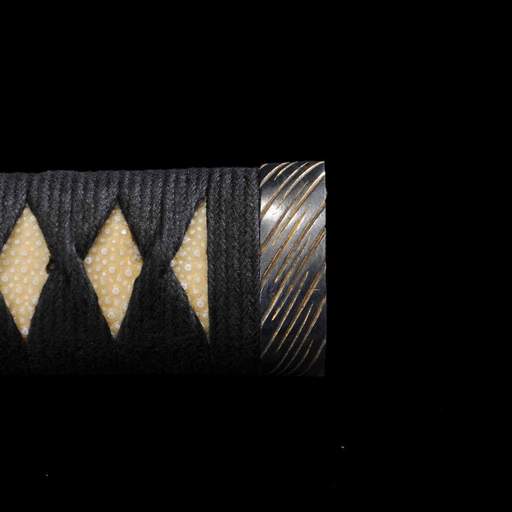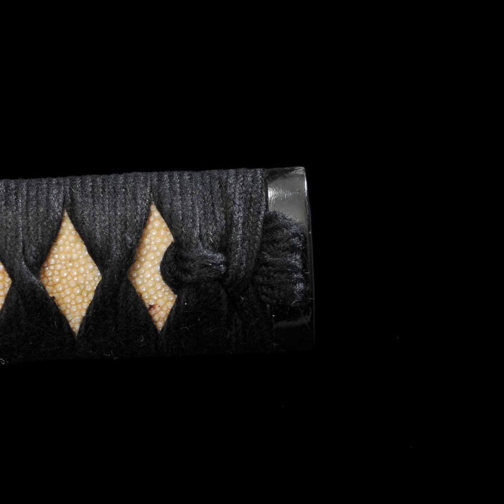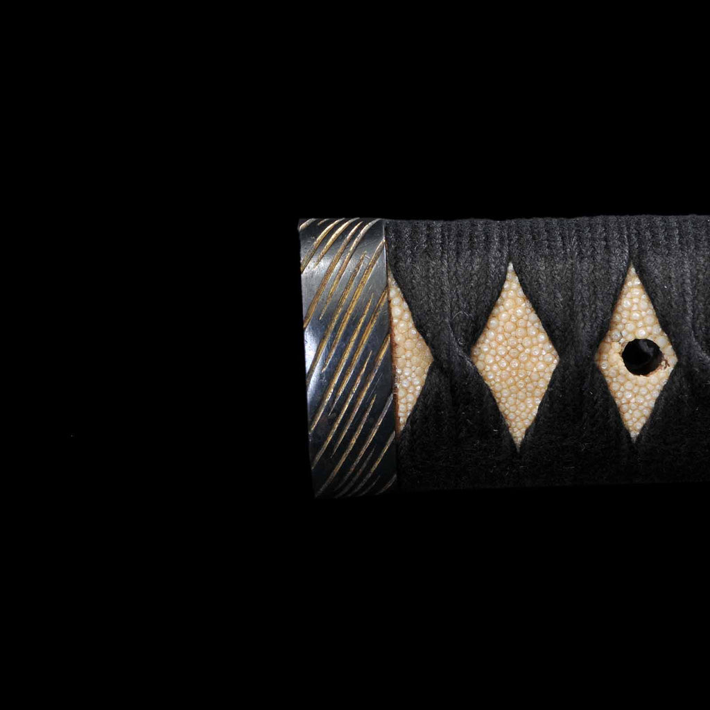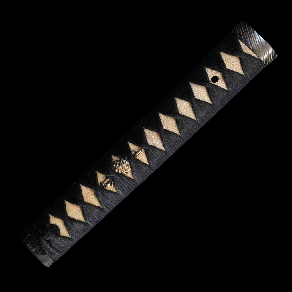 The koshirae fittings are all of the period, and are of the Tensho style. The tsukamaki cord was broken, so it has been newly replaced and is tightly wrapped. The nakago is engraved on the back as the work of an Osafune katsumitsu living in Bishu, and the reverse side states that this katana was made in August 1489. Katsumitsu was famous as one of the best swordsmiths in Bizen along with Kiyomitsu in the late Muromachi period (1336-1573), and was one of the leading masters of Sue Bizen.