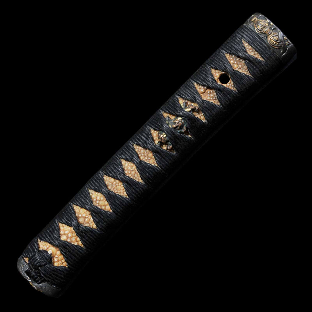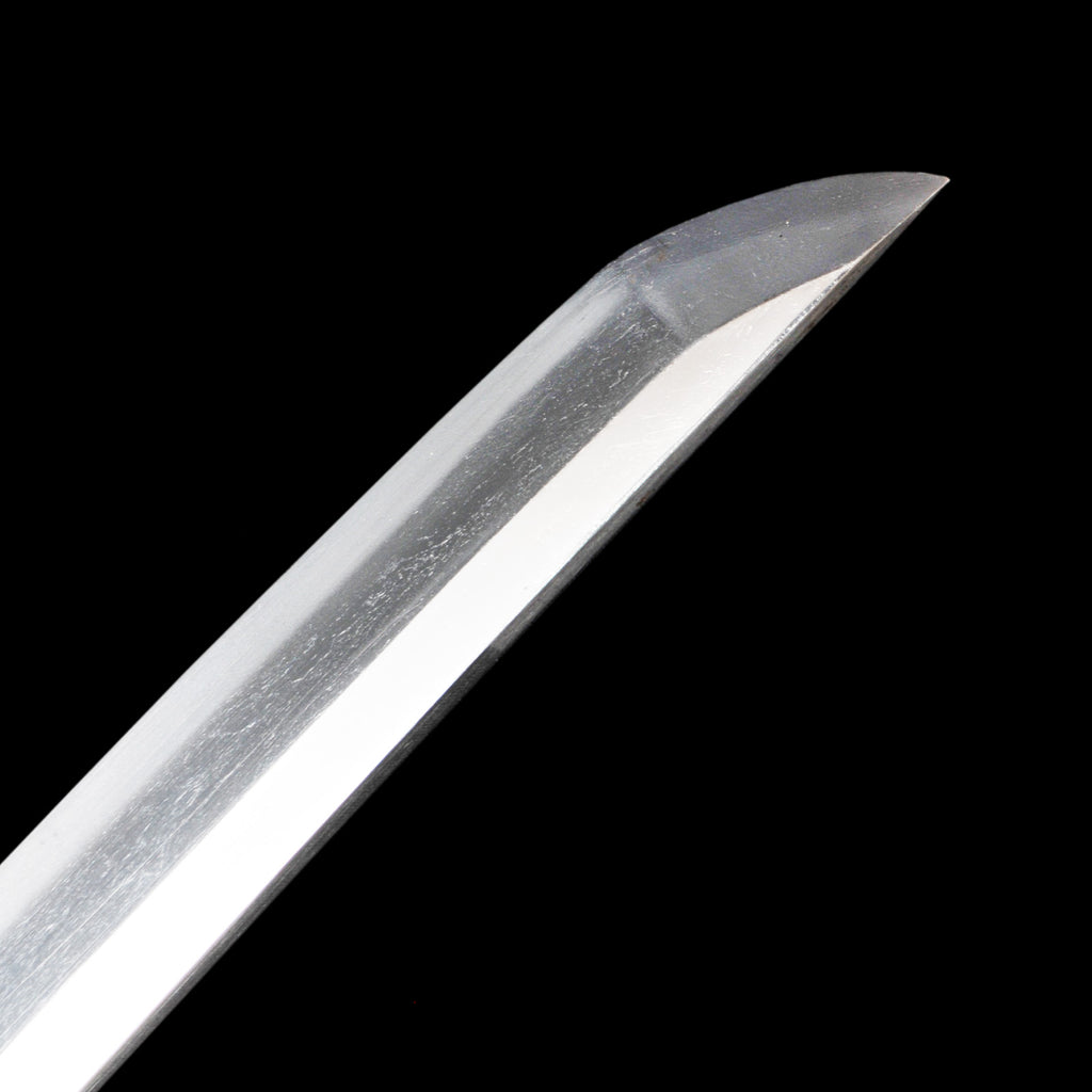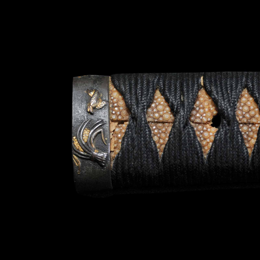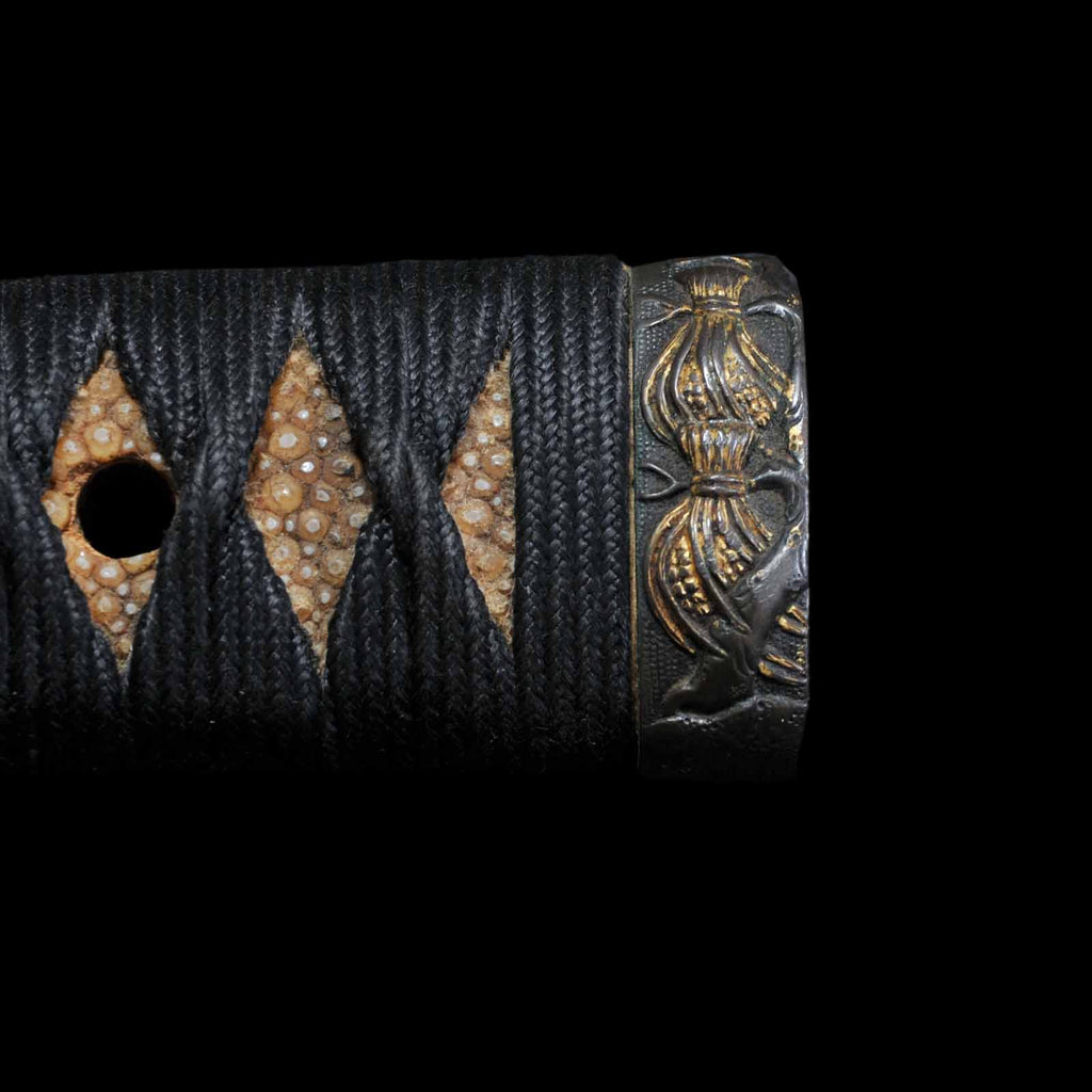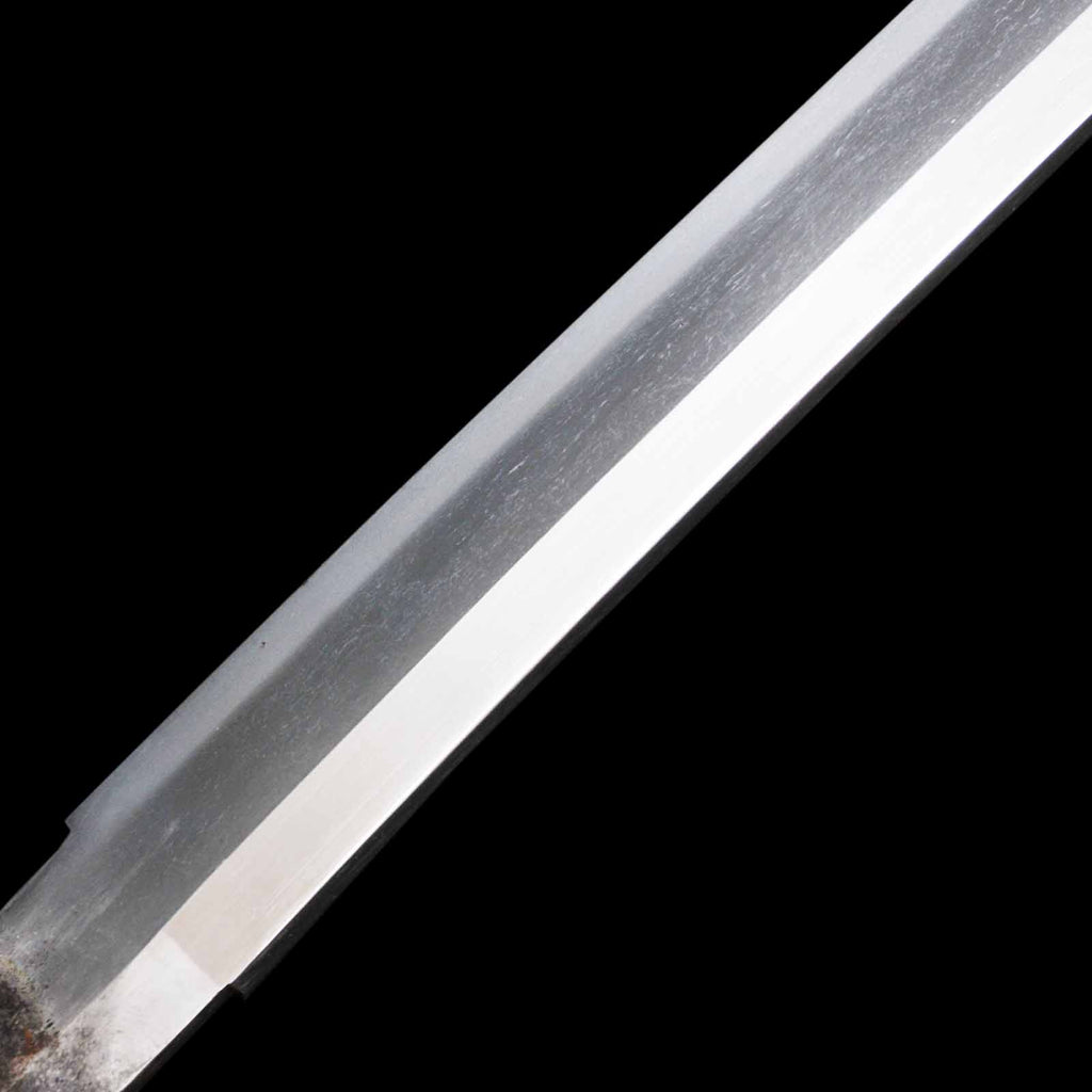This work shows this tendency clearly and has a very elegant appearance. The hada is well packed with itame and has elegant suguha hamon. The sword body is in relatively good condition, but there are some dots of black rust and scratches called hike in some places. The slim body makes it suitable as a practice sword for iai. The koshirae is not original, but antique metal fittings are used. The scabbard lacquer has some dents and dings due to age.