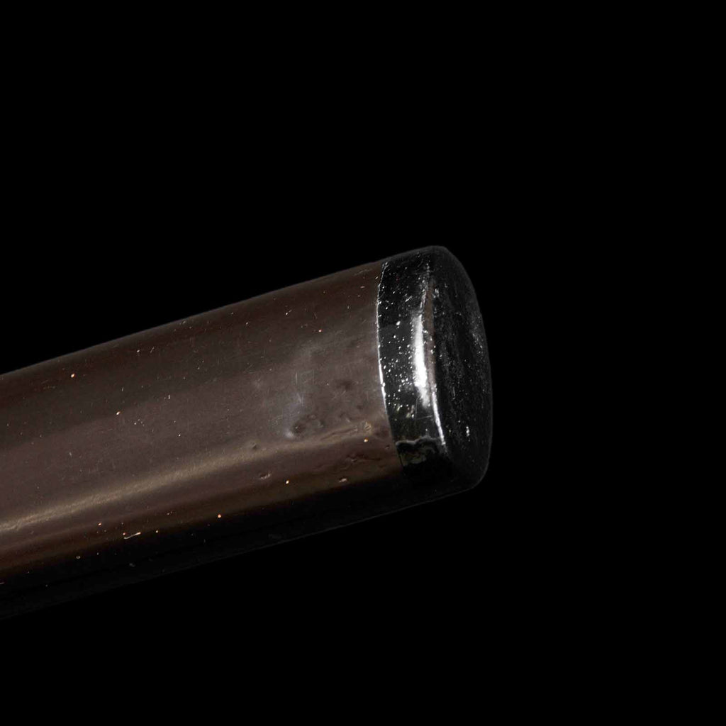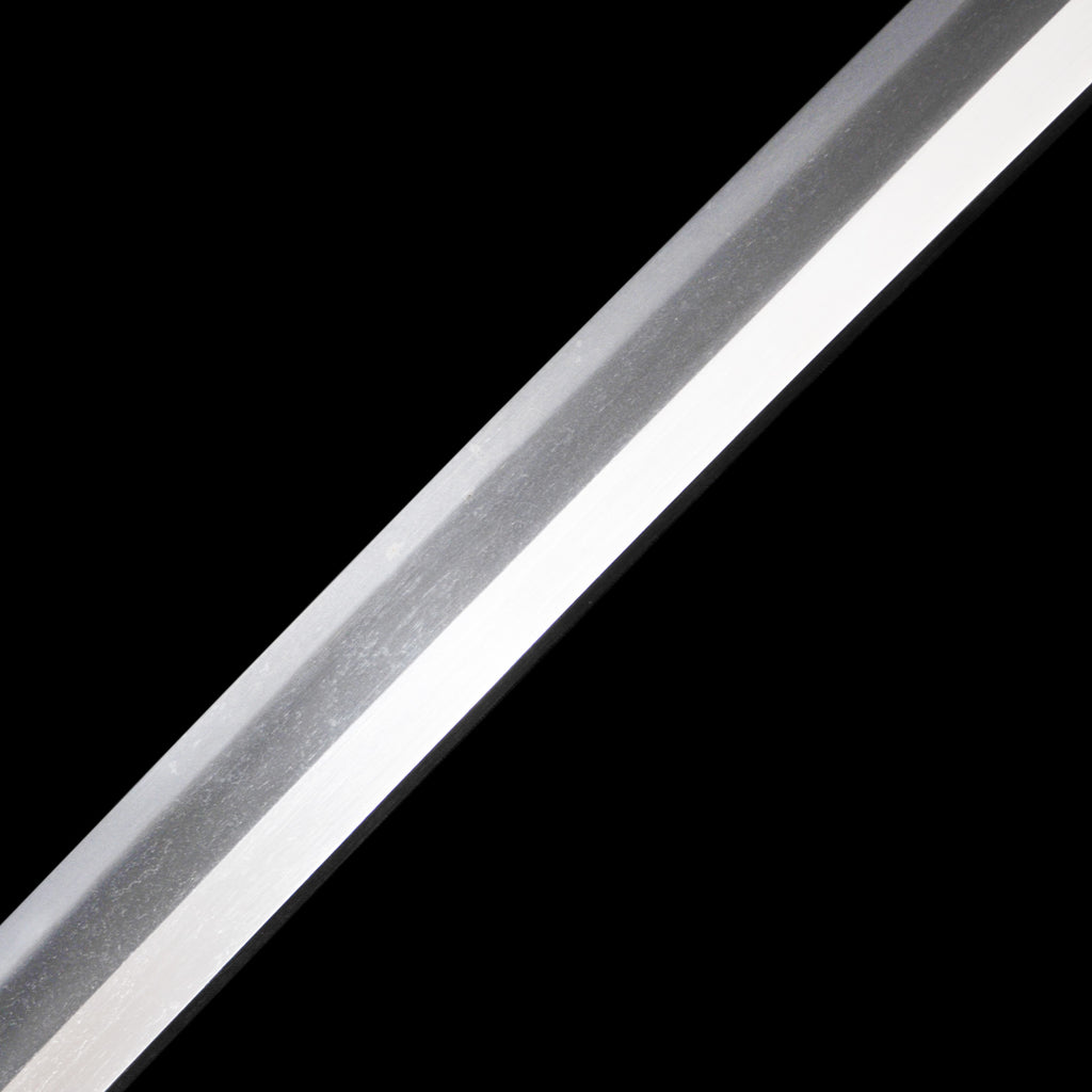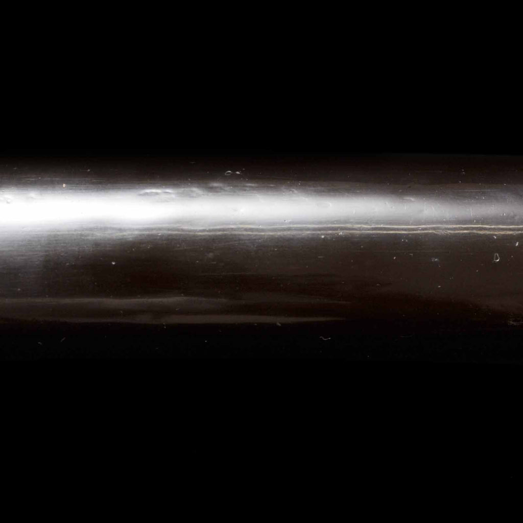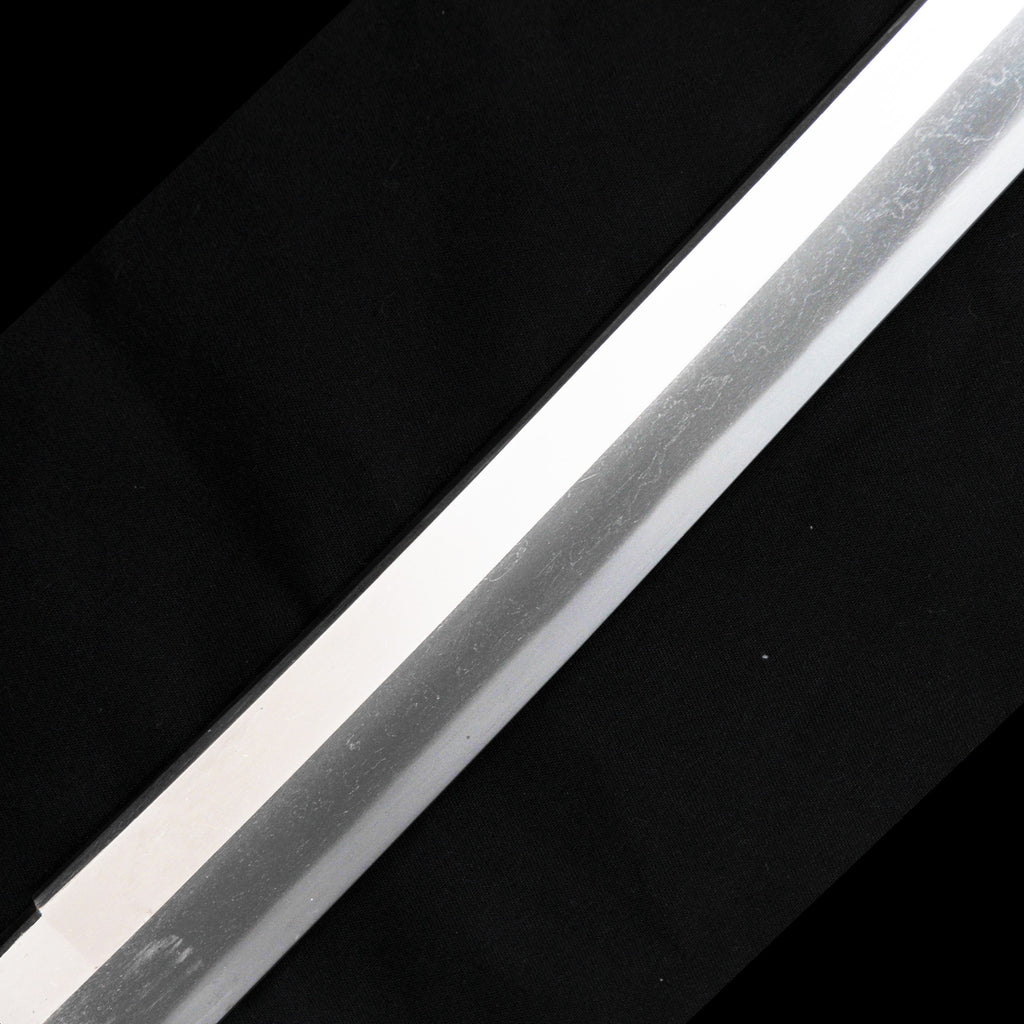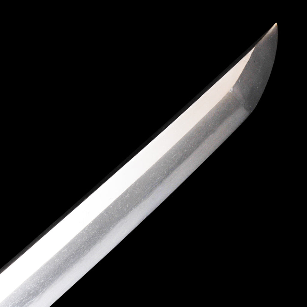 This work shows this tendency clearly and has a very elegant appearance. The hada is well packed with itame and has elegant suguha hamon. The sword body is in relatively good condition, but there are some dots of black rust and scratches called hike in some places. The slim body makes it suitable as a practice sword for iai. The koshirae is not original, but antique metal fittings are used. The scabbard lacquer has some dents and dings due to age.