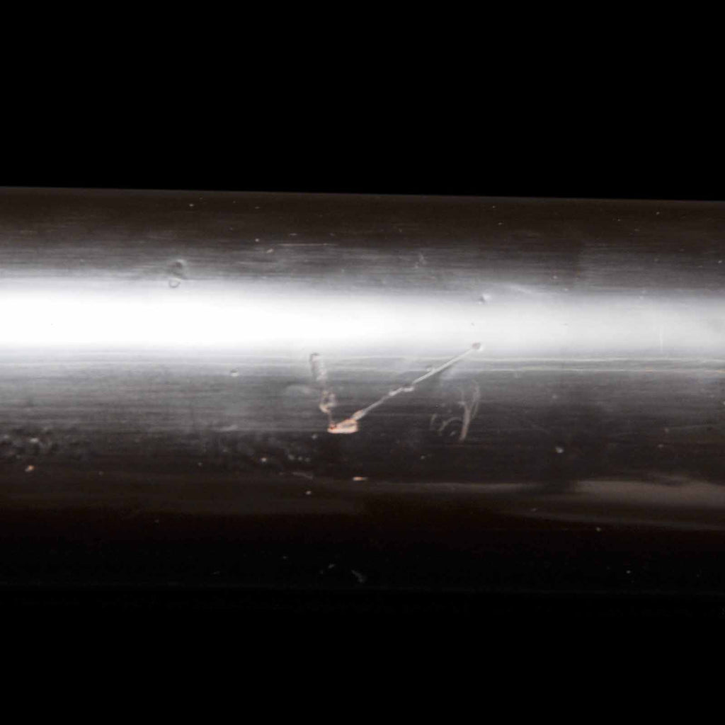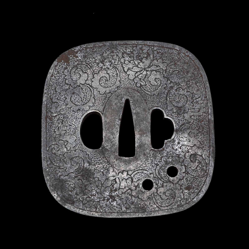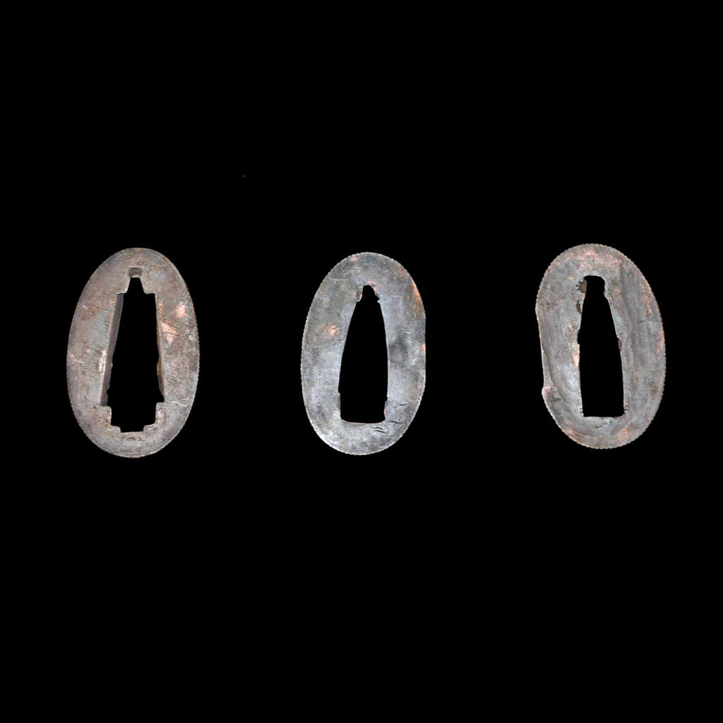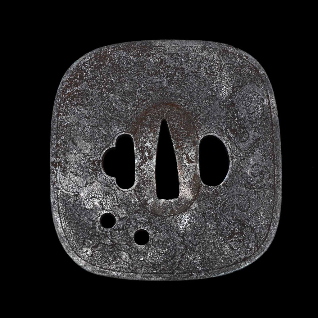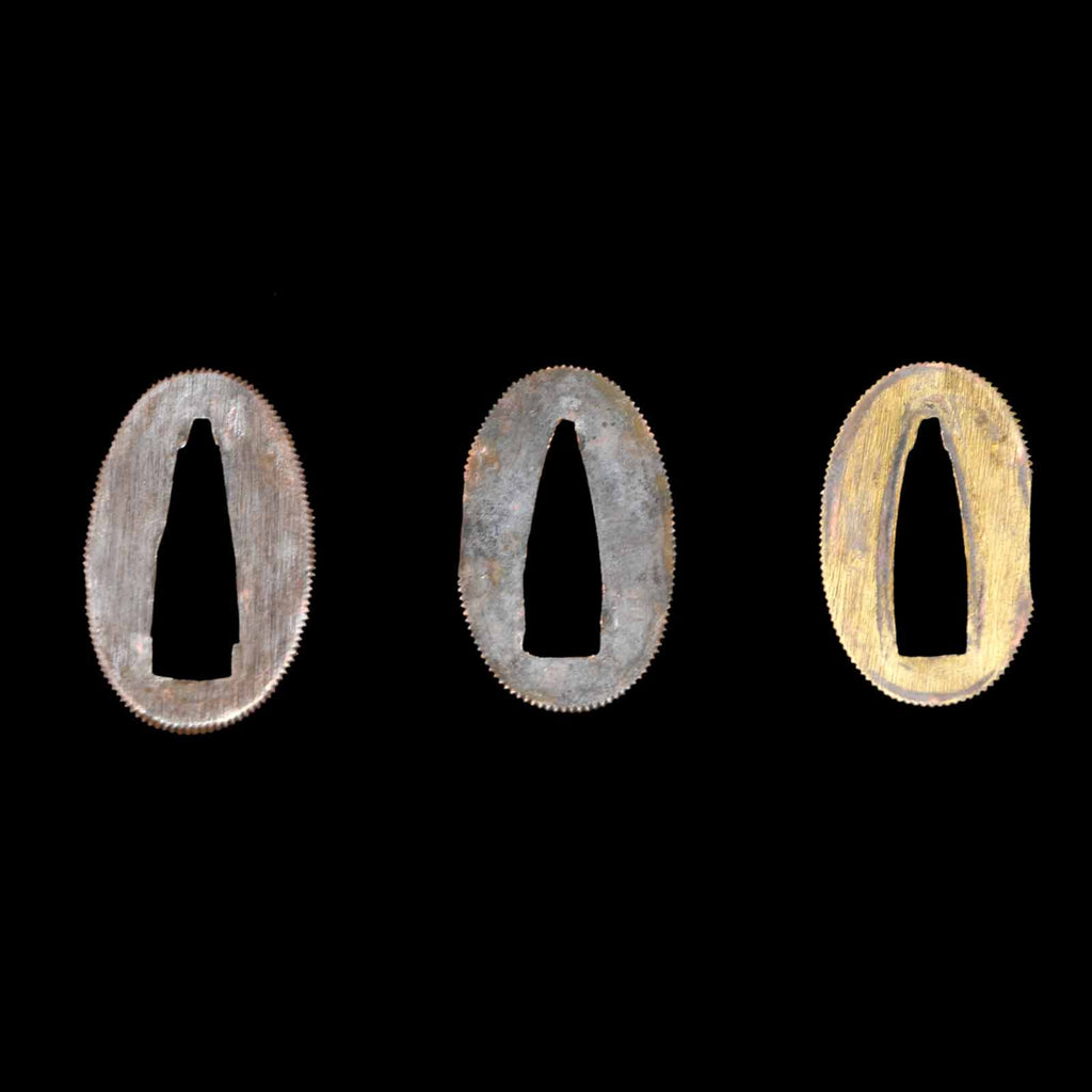 This work shows this tendency clearly and has a very elegant appearance. The hada is well packed with itame and has elegant suguha hamon. The sword body is in relatively good condition, but there are some dots of black rust and scratches called hike in some places. The slim body makes it suitable as a practice sword for iai. The koshirae is not original, but antique metal fittings are used. The scabbard lacquer has some dents and dings due to age.