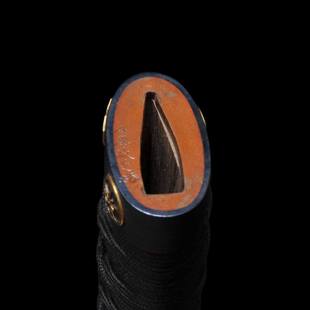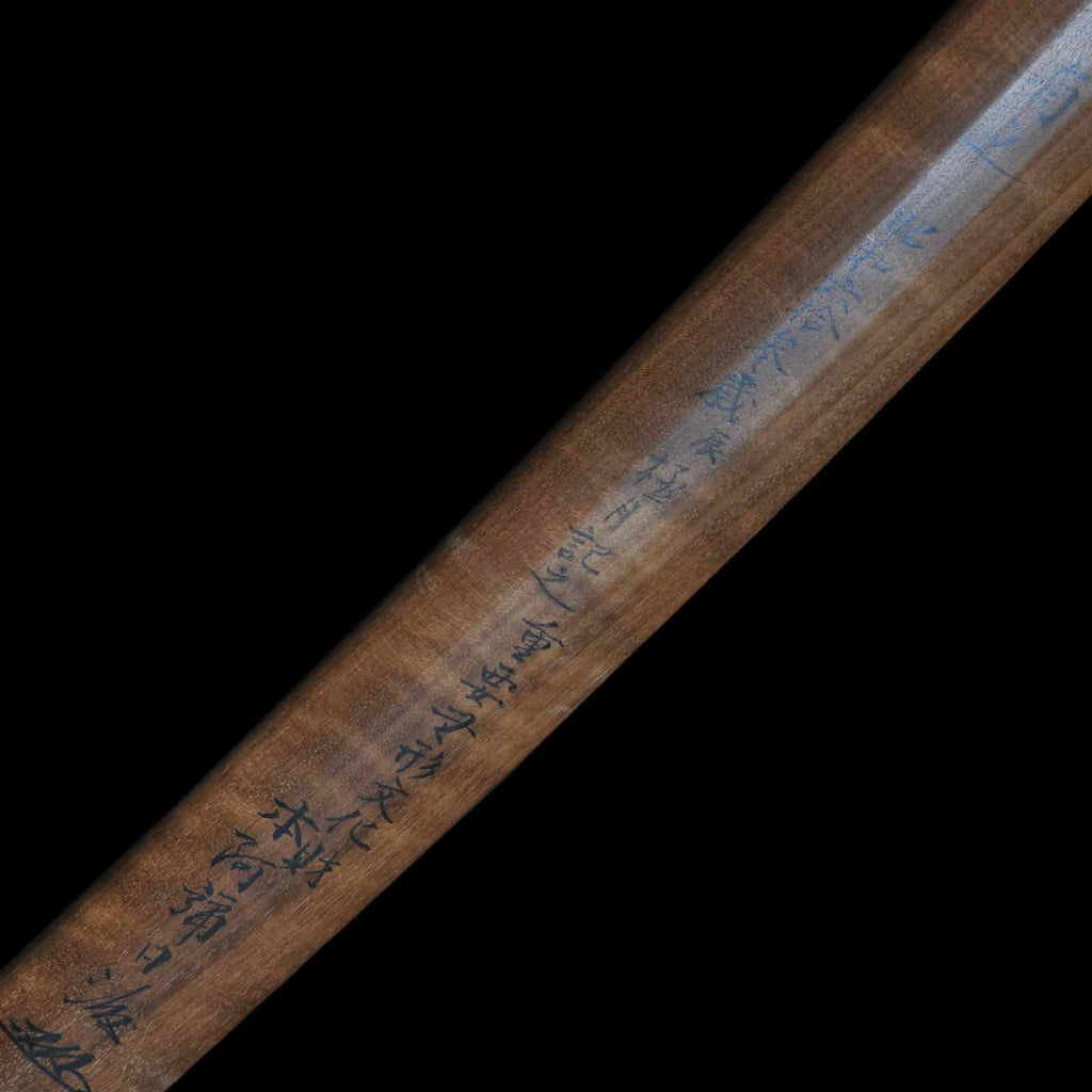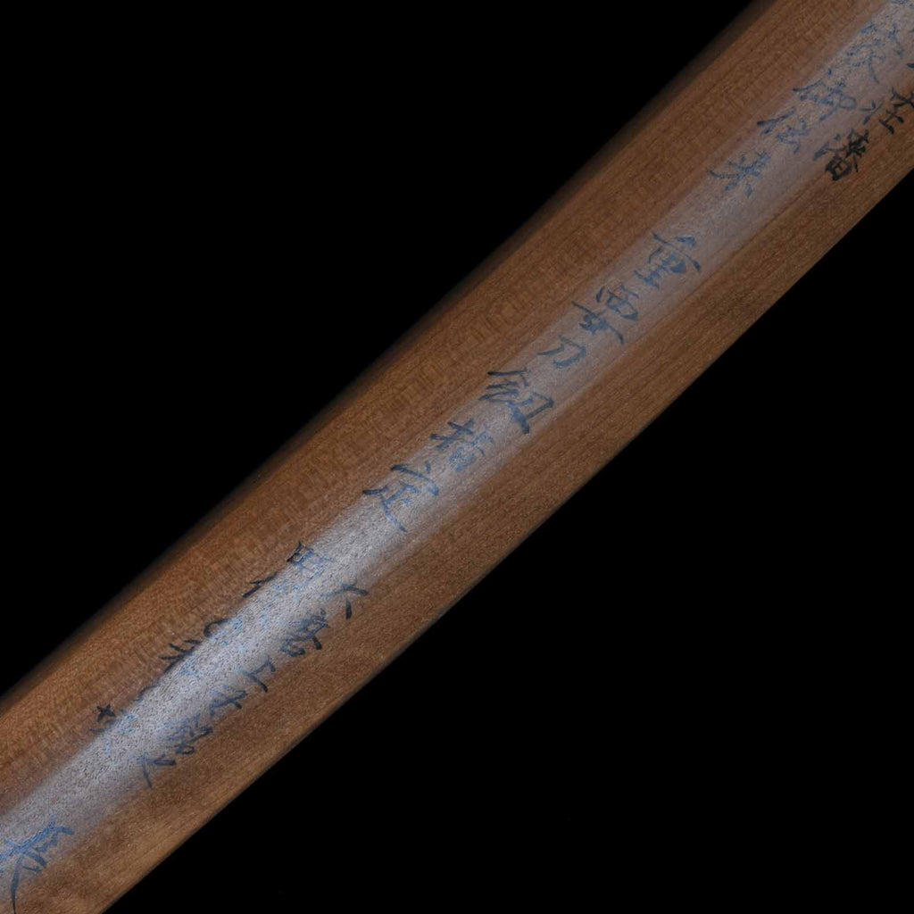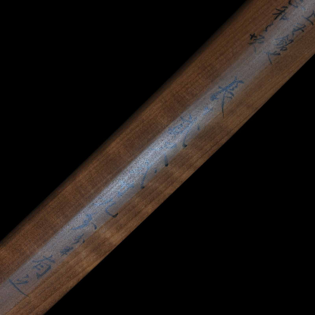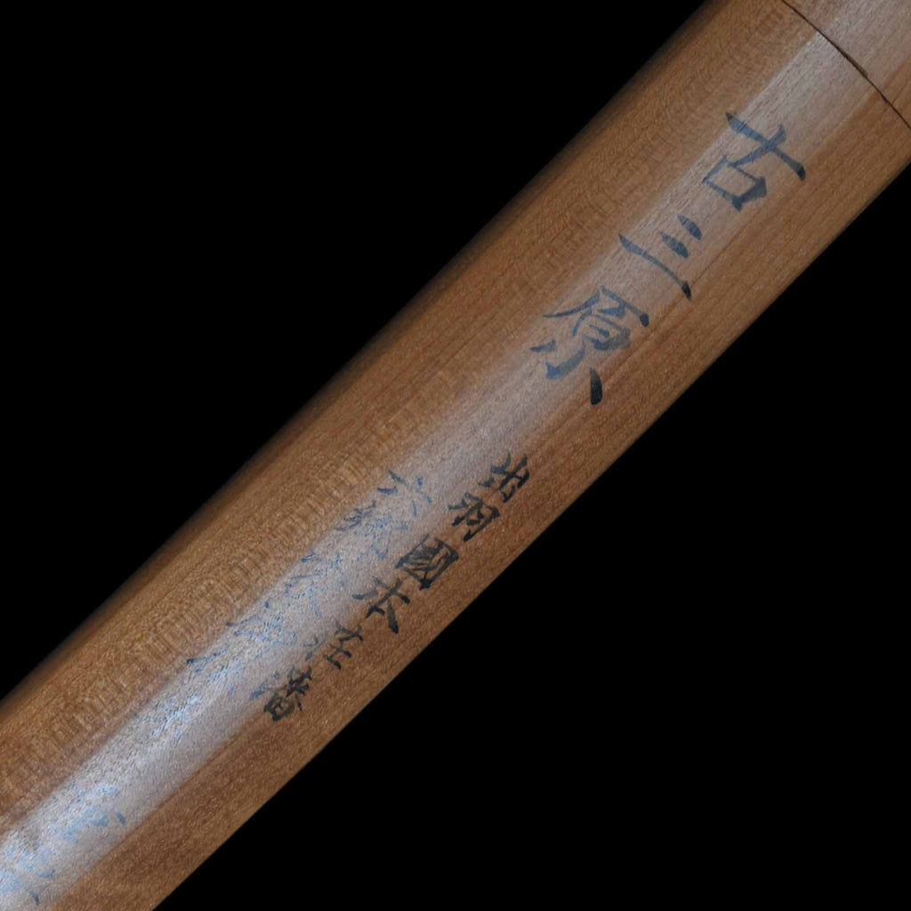 This piece has a wider shinogi, and a hada with some mokume mixed in with masame, with hoso-suguha hamon. The boshi is arced in a shallow komaru. On the scabbard, the Hon'ami, the most prestigious and renowned sword appraiser, has identified this sword as a work of Komihara and has written a detailed description of it.
