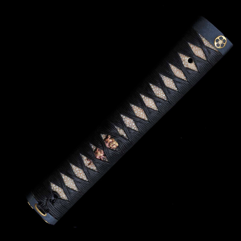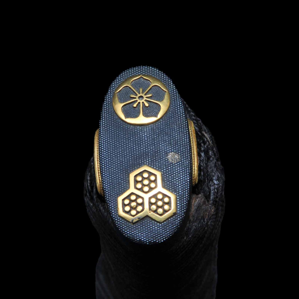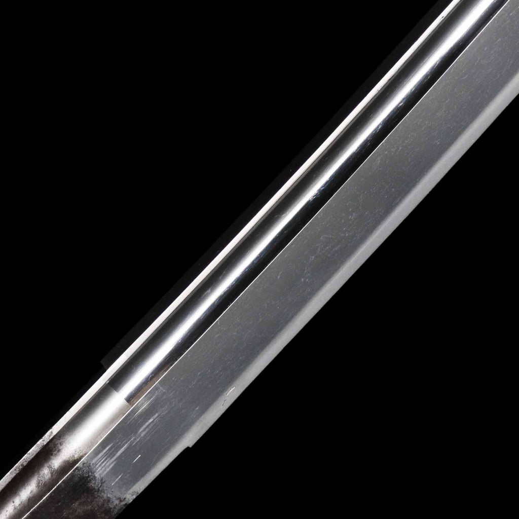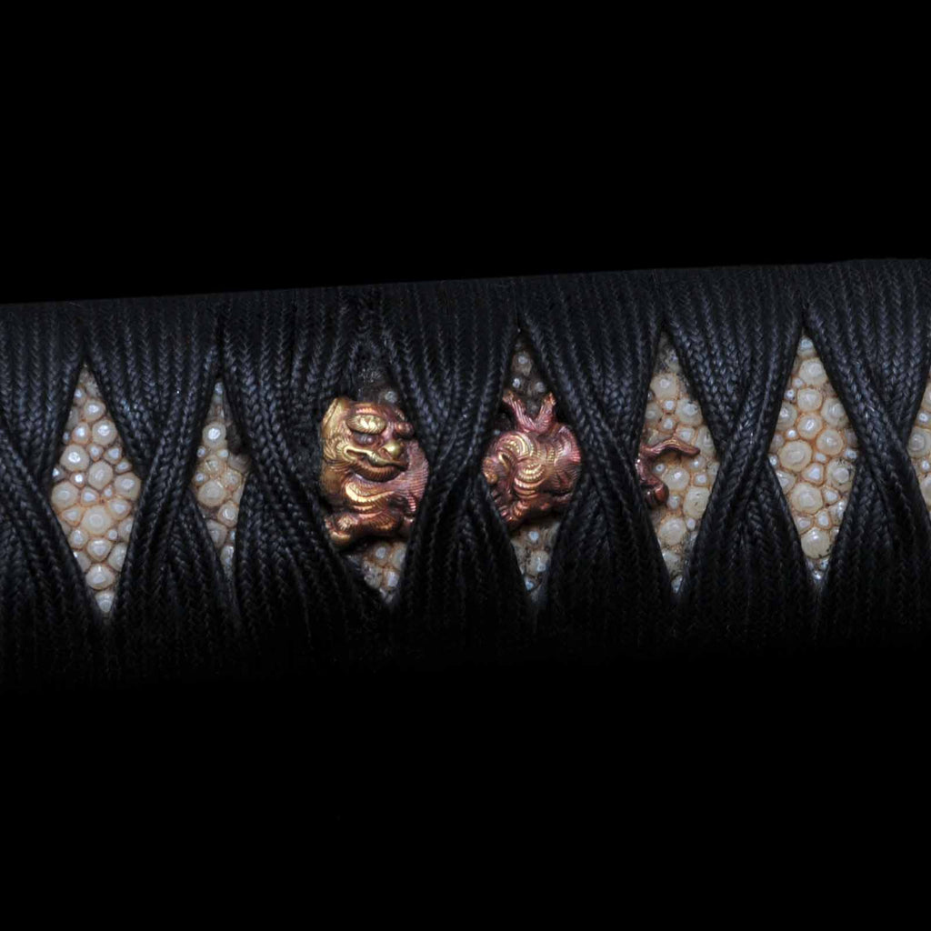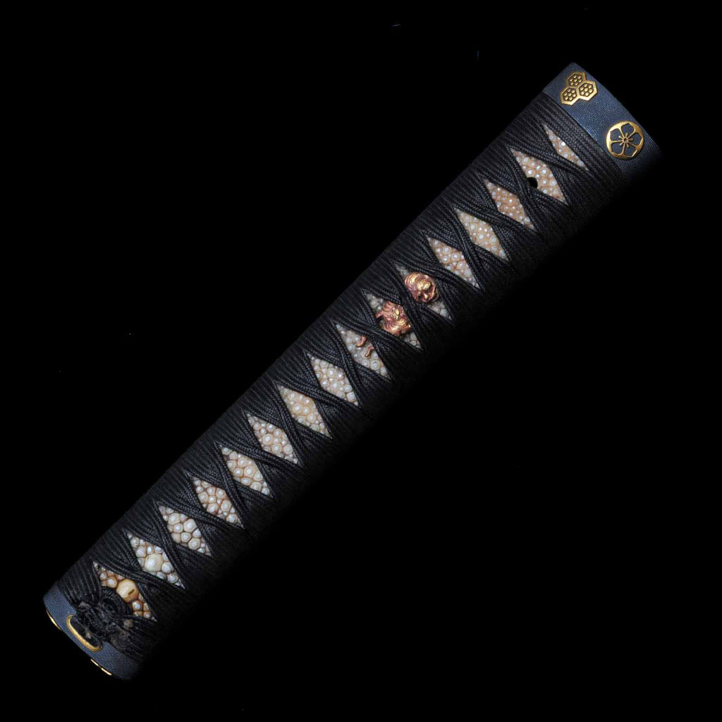 This piece has a wider shinogi, and a hada with some mokume mixed in with masame, with hoso-suguha hamon. The boshi is arced in a shallow komaru. On the scabbard, the Hon'ami, the most prestigious and renowned sword appraiser, has identified this sword as a work of Komihara and has written a detailed description of it.