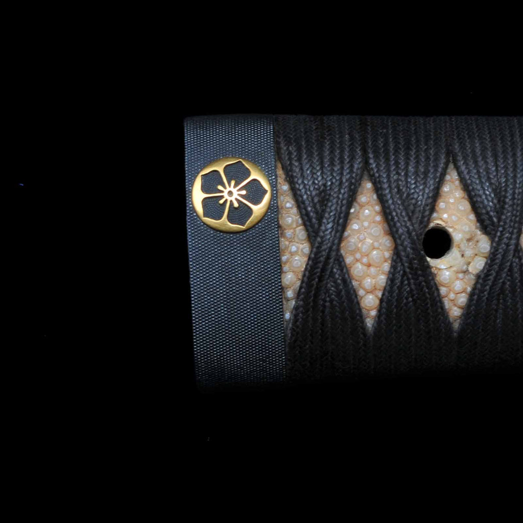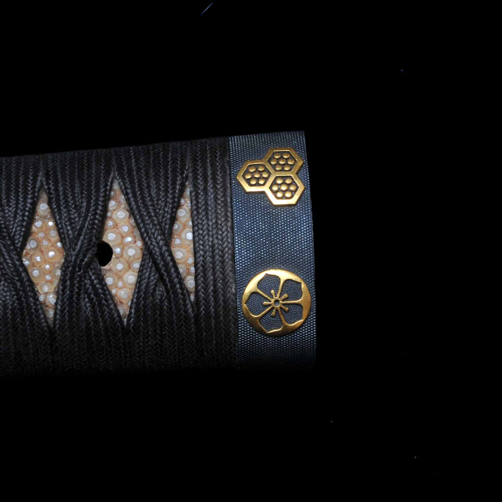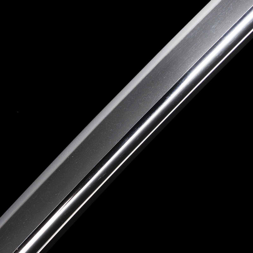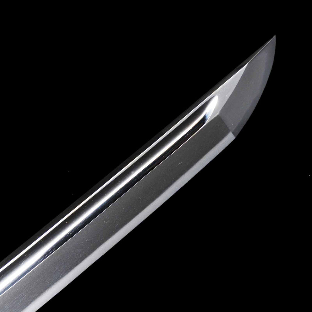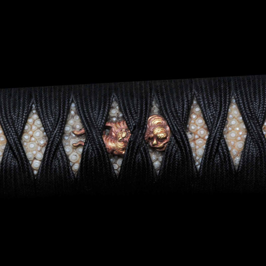 This piece has a wider shinogi, and a hada with some mokume mixed in with masame, with hoso-suguha hamon. The boshi is arced in a shallow komaru. On the scabbard, the Hon'ami, the most prestigious and renowned sword appraiser, has identified this sword as a work of Komihara and has written a detailed description of it.