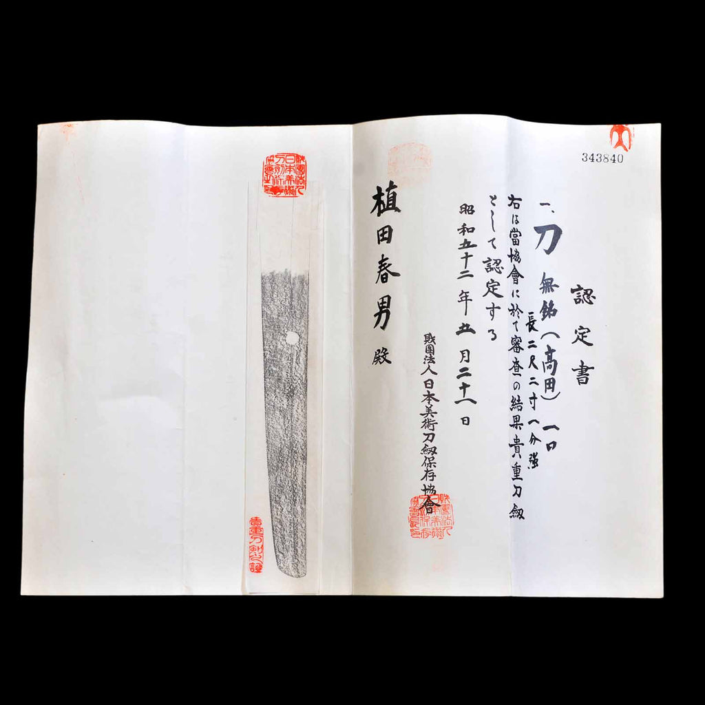 This piece is unsigned and has an unokubi structure, which is very rare for a katana, and is a Japanese sword that the Society for Preservation of Japanese Art Swords has certified as kicho as a very valuable katana.